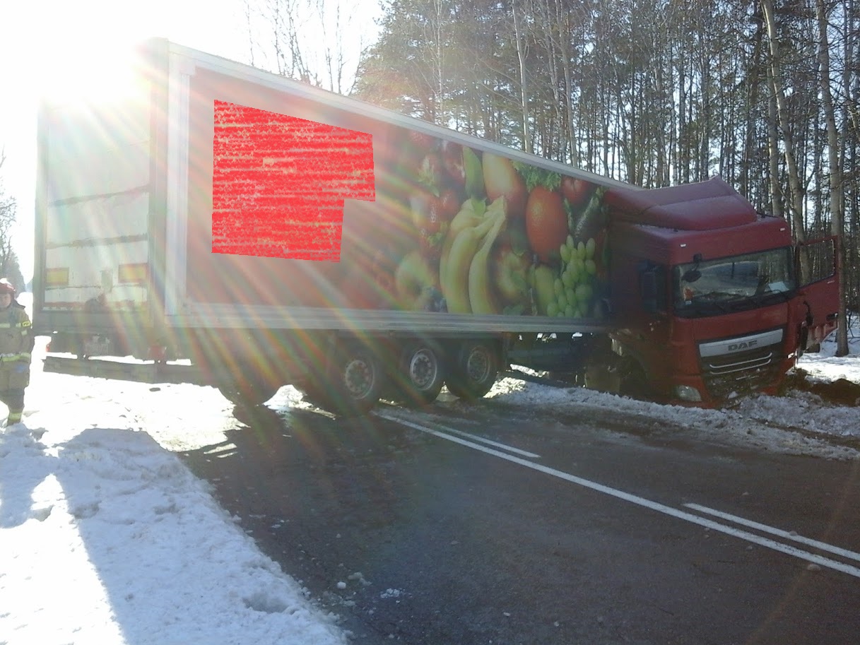 W chwili przybycia zastępów straży pożarnej na miejsce zdarzenia stwierdzono, że samochód ciężarowy DAF z naczepą uderzył w przydrożne drzewo. Naczepa blokowała całą szerokość jezdni. Pojazdem podróżował jedynie kierowca, który opuścił pojazd przed przybyciem zastępów straży pożarnej. Nie odniósł on żadnych obrażeń.
