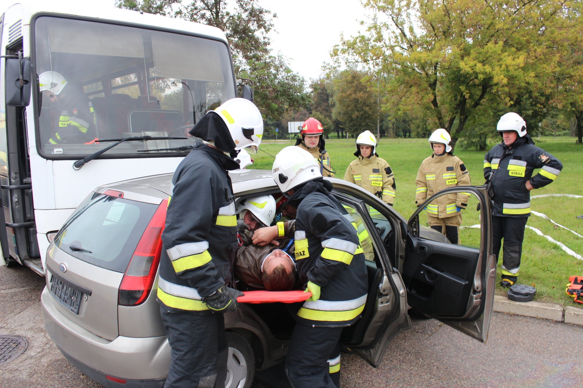 Scenariusz ćwiczeń zakładał, że w wyniku zasłabnięcia kierowcy samochodu osobowego dochodzi do zderzenia autobusu wiozącego podróżnych z tymże samochodem. Trzy osoby podróżujące autem osobowym doznają obrażeń i pozostają uwięzione w uszkodzonym pojeździe. Również wszyscy pasażerowie autobusu zostają ranni w wyniku zderzenia.