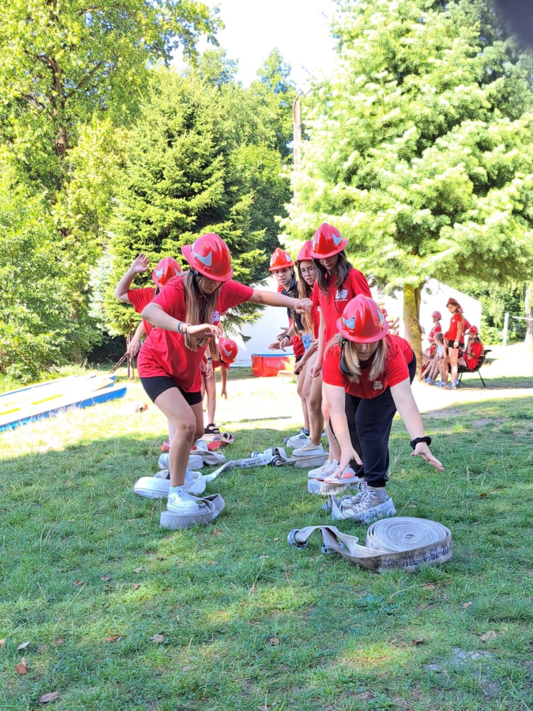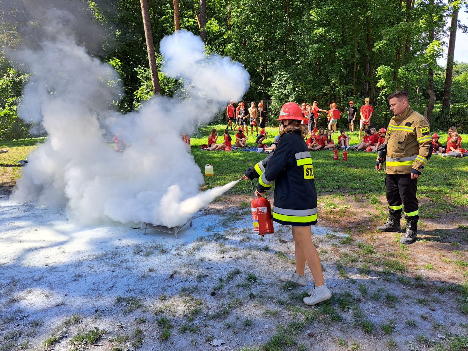 W czasie dwutygodniowego pobytu młodzi strażacy pod okiem druhów OSP i opiekunów pedagogów zapoznawali się m.in. z elementami strażackiej służby, sportów pożarniczych. Uczestnicy obozu uczyli się musztry, węzłów, sprawiania linii gaśniczych, pierwszej pomocy, obsługi gaśnic oraz zasad korespondencji radiowej. Uczestniczyli też w symulacji pożaru lasu i pożarów wewnętrznych. Obozowicze odwiedzili też Komendę Powiatową PSP w Ełku, gdzie m.in. uczestniczyły w zajęciach w sali edukacyjnej OGNIK i komorze dymowej. Na terenie ośrodka odbyły się spotkania ze strażakami i funkcjonariuszami policji oraz pokaz bezzałogowych statków powietrznych będących na wyposażeniu Komendy Wojewódzkiej PSP w Białymstoku. Czekały też na nie liczne atrakcje: gry i zabawy zespołowe, kąpiele w jeziorze, spływy kajakowe, piesze wycieczki, wycieczka na promenadę w Ełku, wizyta w parku trampolin i „Zjawiskolandzie”, wycieczka kolejką wąskotorową i wiele innych.