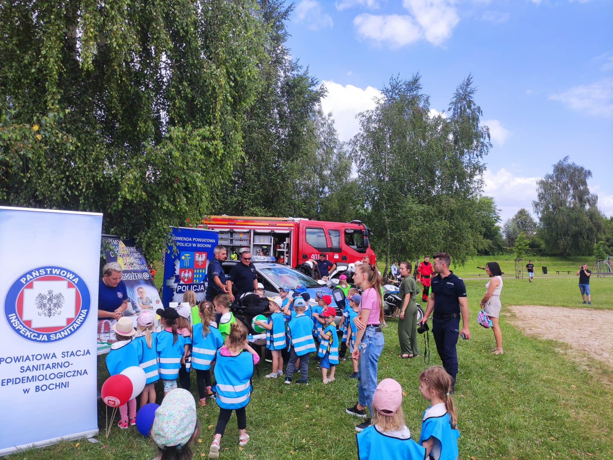 W ramach tegorocznej inauguracji akcji „Kręci mnie bezpieczeństwo nad wodą” dniu 24 czerwca 2024 r. strażacy z Komendy Powiatowej Państwowej Straży Pożarnej w Bochni, funkcjonariusze Komendy Powiatowej Policji w Bochni, pracownicy Powiatowej Stacji Sanitarno-Epidemiologicznej w Bochni, ratownicy wodni oraz przedstawiciele UG w Łapanowie spotkali się z młodzieżą szkolną i dziećmi na terenie zalewu rekreacyjnego w Łapanowie. Miejsce to nie zostało wybrane przypadkowo, gdyż kąpielisko w upalne dni cieszy się dużą popularnością i ściąga rzesze amatorów kąpieli i sportów wodnych. Głównym tematem poruszanym podczas spotkania było bezpieczeństwo nad wodą. Pośród przygotowanej i omawianej tematyki znalazły się także: podstawowe zasady bezpieczeństwa w górach, w lesie, bezpieczeństwa w internecie, porady mające uchronić nasz dom lub mieszkanie przed włamaniami podczas urlopowych wyjazdów, bezpieczeństwo podczas kontaktów z nieznajomymi oraz pokazy ratownictwa wodnego. W ramach zajęć młodzież miała możliwość zapoznania się z elementami sprzętu do ratownictwa wodnego, zasadami postępowania w przypadku zauważenia osoby tonącej oraz nauczyć się udzielania pomocy tonącym.