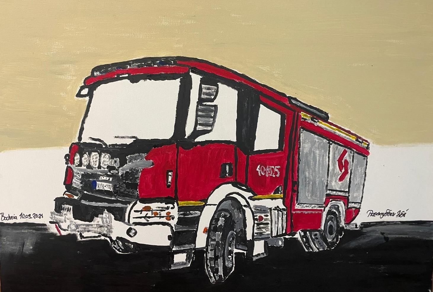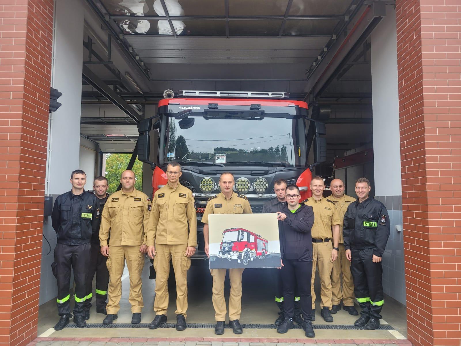 10 września 2024 r. mięliśmy zaszczyt gościć w Komendzie Powiatowej Państwowej Straży Pożarnej w Bochni młodego artystę Przemysława Wosia. Przemek na co dzień zmaga się z problemami zdrowotnymi, jednak nie przeszkadza mu to w realizowaniu swojej pasji , którą jest malowanie na płótnie wozów strażackich oraz scen związanych z pracą strażaka. W trakcie wizyty Przemek przekazał na ręce Komendanta Powiatowego Państwowej Straży Pożarnej w Bochni st. bryg. Jacka Ryncarza własnoręcznie namalowany obraz samochodu GCBARt 5/35 SCANIA będącego na wyposażeniu JRG Bochnia. Wyjątkowy młody pasjonat miał okazję zwiedzić tutejszą komendę, spotkał się z załogą, zapoznał się z wyposażeniem oraz podzielił się z nami opowieściami związanymi z trudem codziennego życia. W podziękowaniu za wspaniałą pracę malarz otrzymał od bocheńskich strażaków kilka pożarniczych eksponatów, które ucieszyły młodego pasjonata i kolekcjonera pożarnictwa.