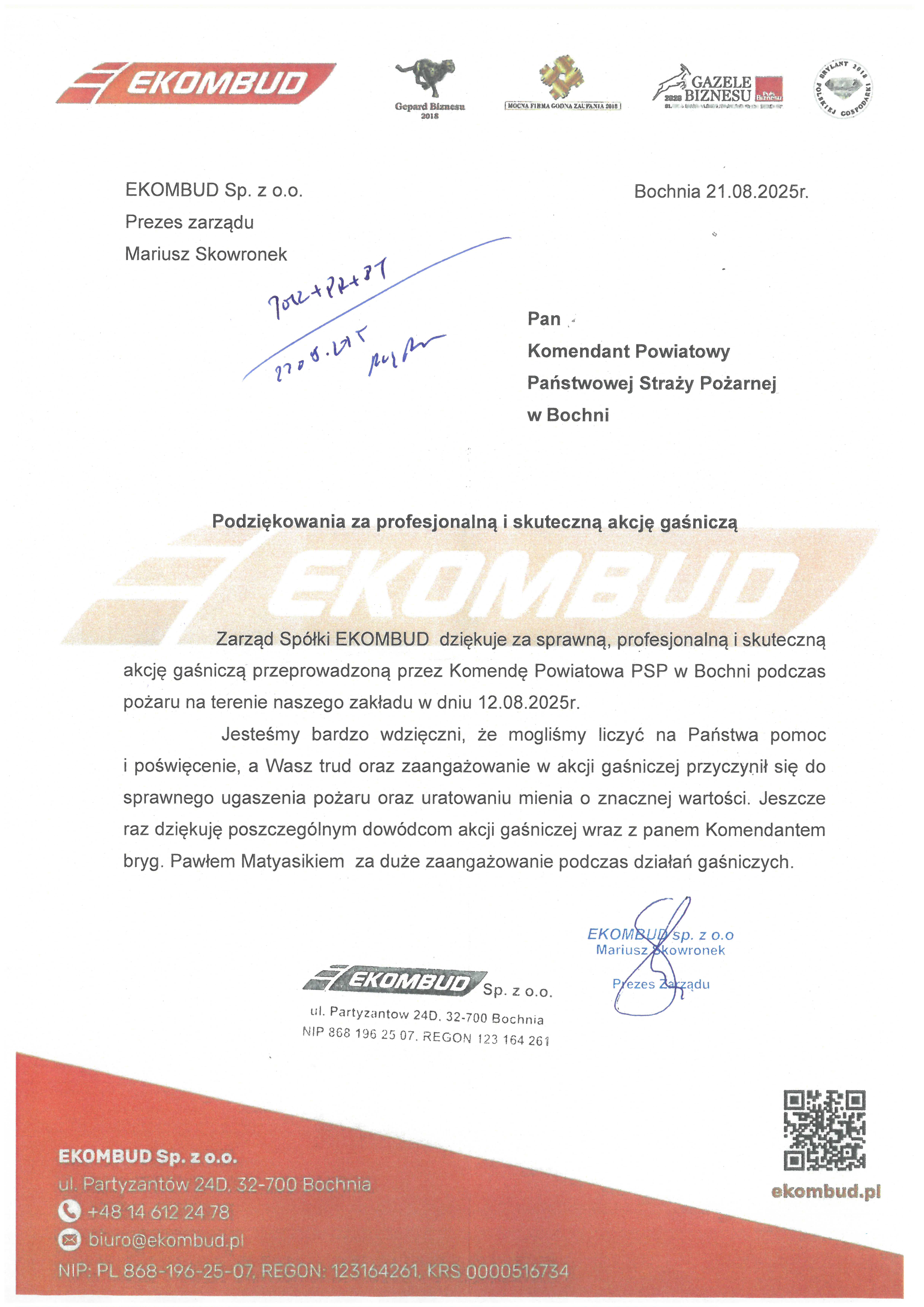 Do Komendy Powiatowej Państwowej Straży Pożarnej w Bochni wpłynęło podziękowanie za profesjonalną i skuteczną akcję gaśniczą przeprowadzoną w dniu 12 sierpnia 2025 roku.