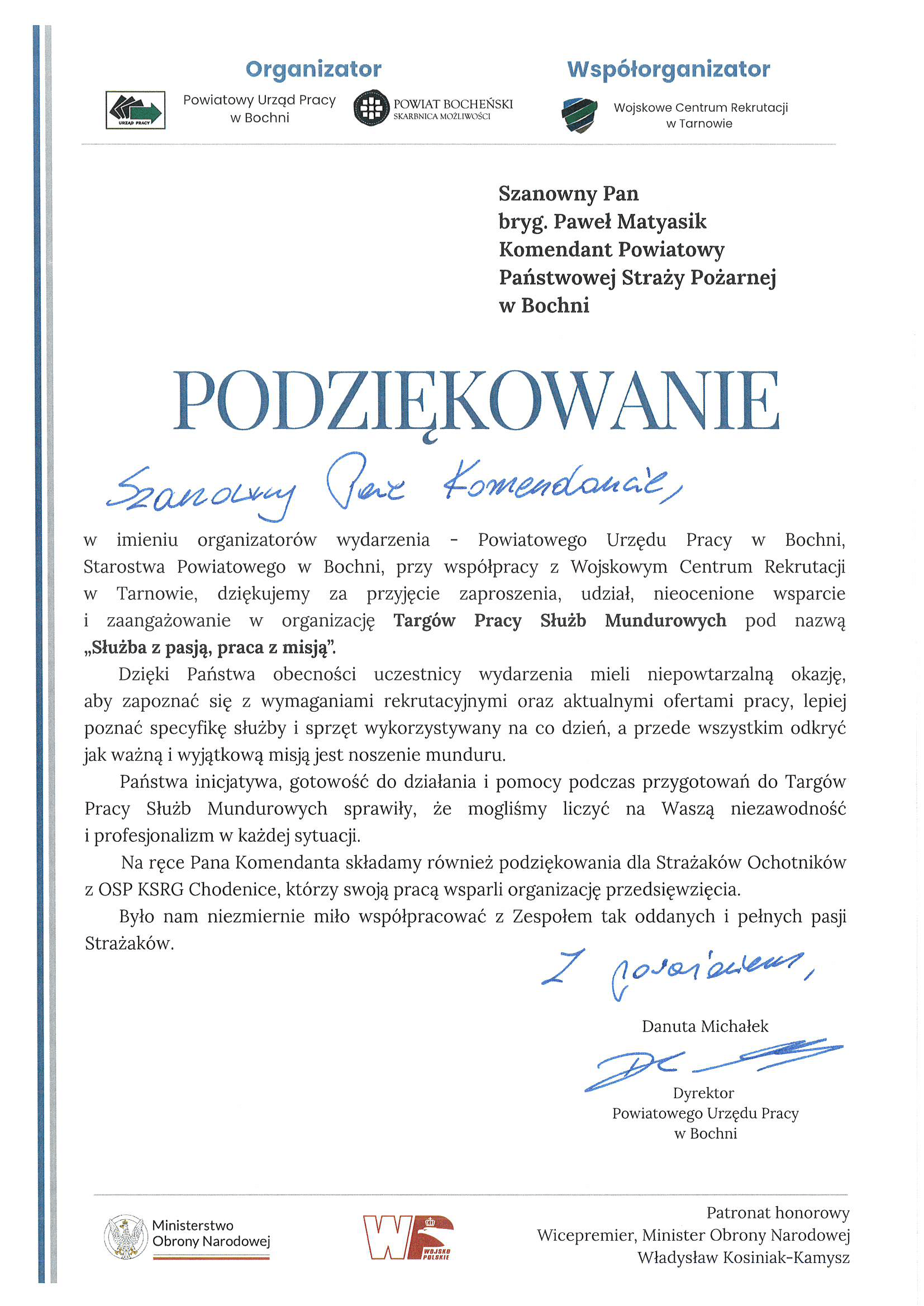 Do Komendy Powiatowej Państwowej Straży Pożarnej w Bochni wpłynęło podziękowanie za aktywny udział w Targach Pracy Służb Mundurowych, które odbyły się 12 września 2025 roku na płycie bocheńskiego Rynku.