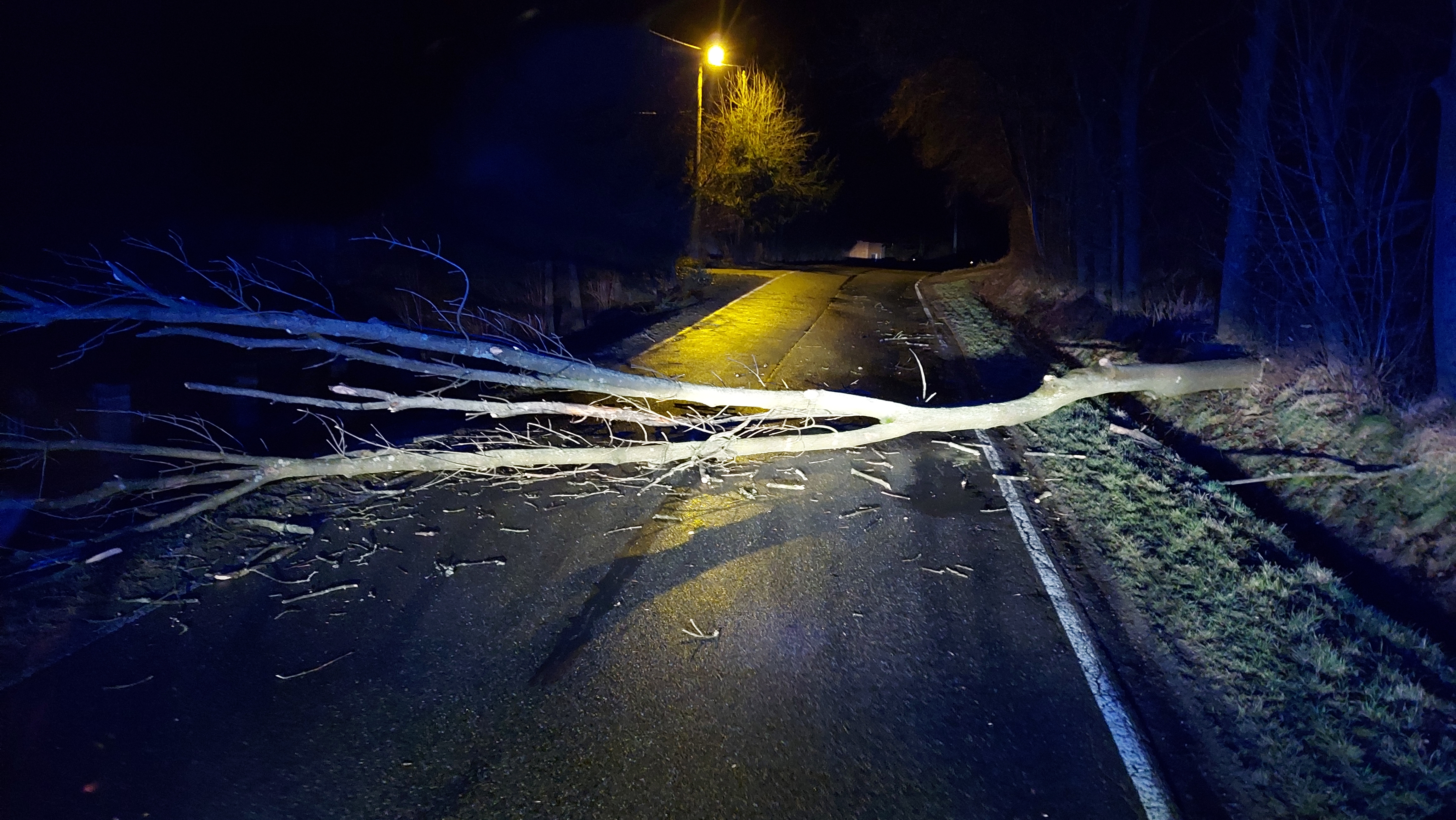 Powalane drzewa, zablokowane drogi, zerwane dachy na skutek silnego wiatru