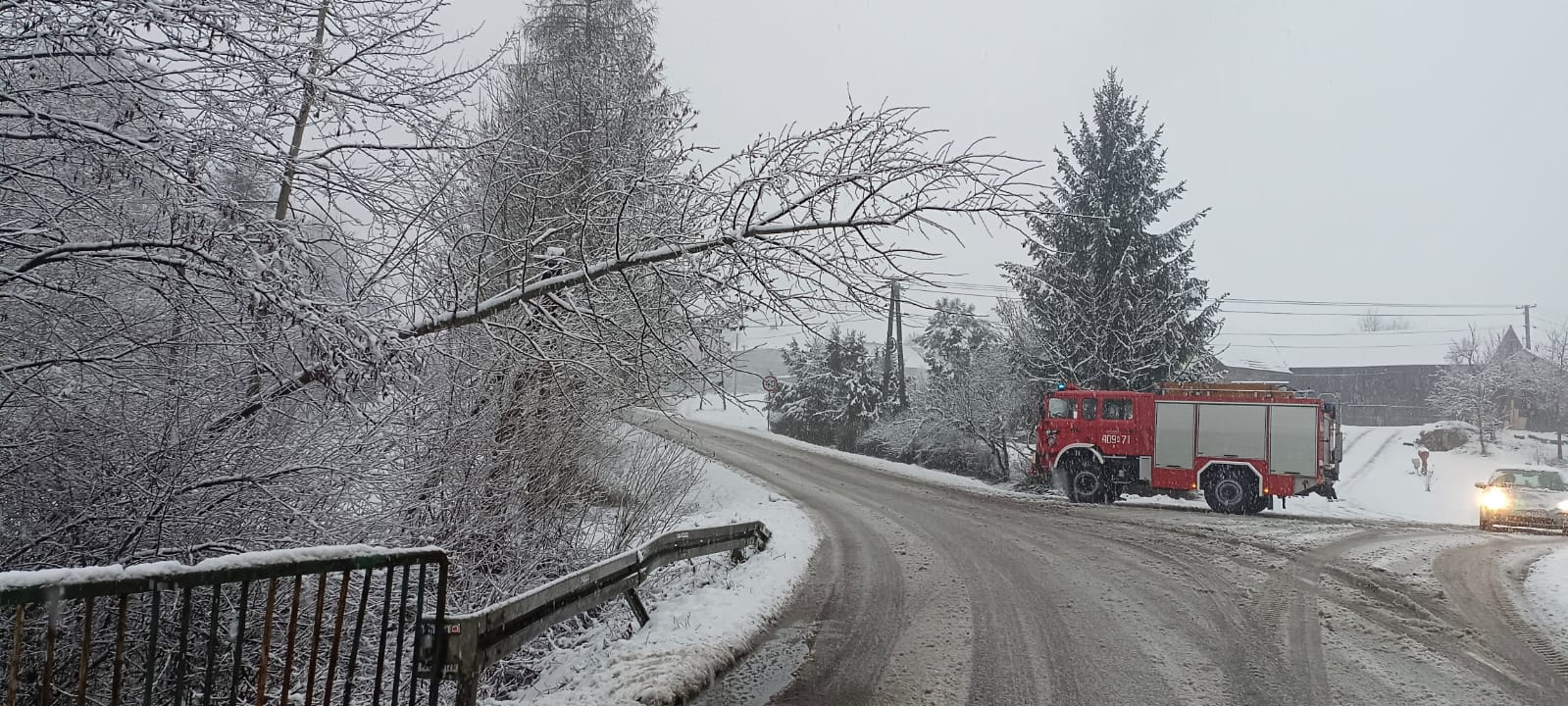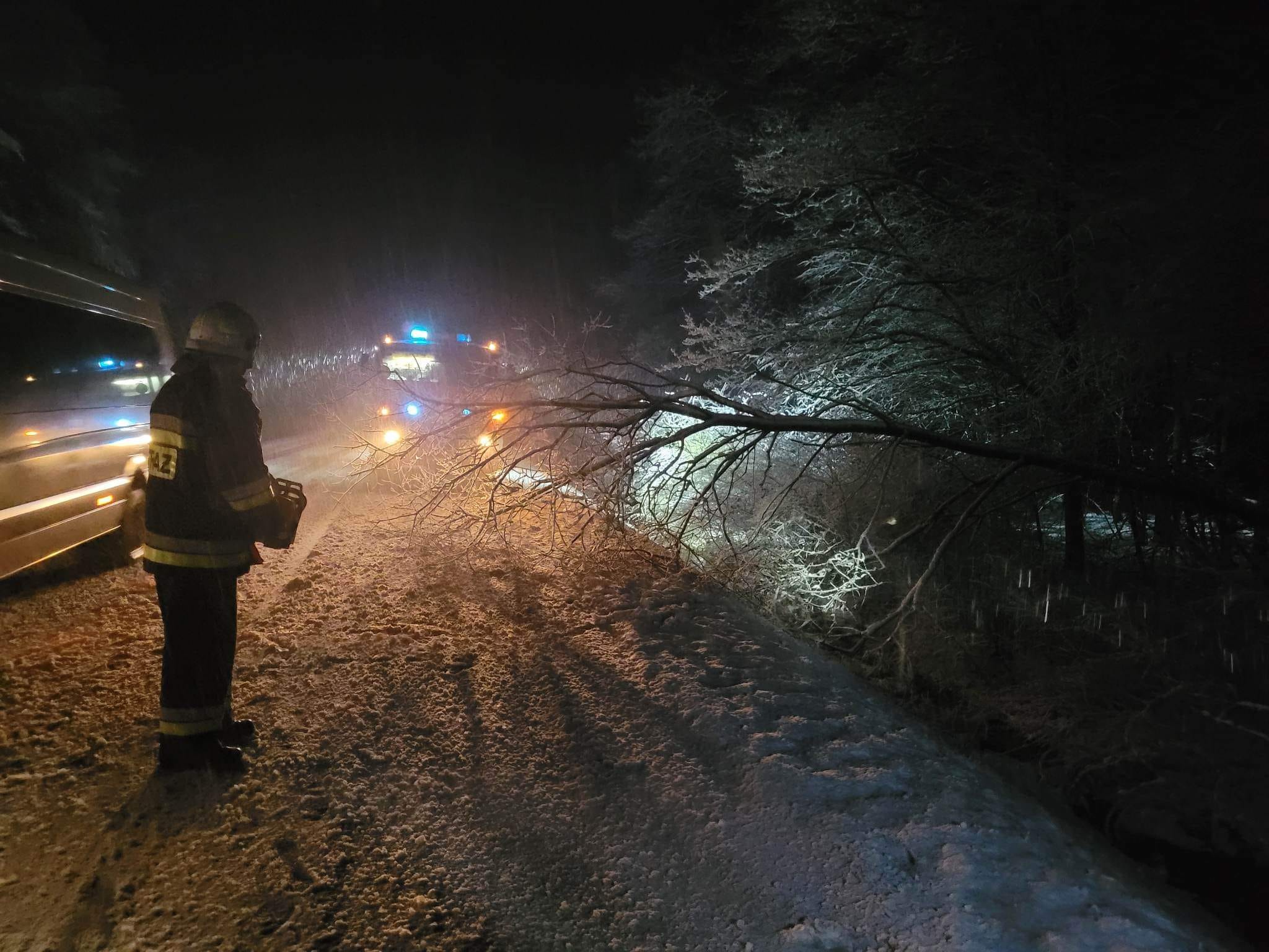 Powalone drzewa, zerwane linie energetyczne na skutek intensywnych opadów śniegu