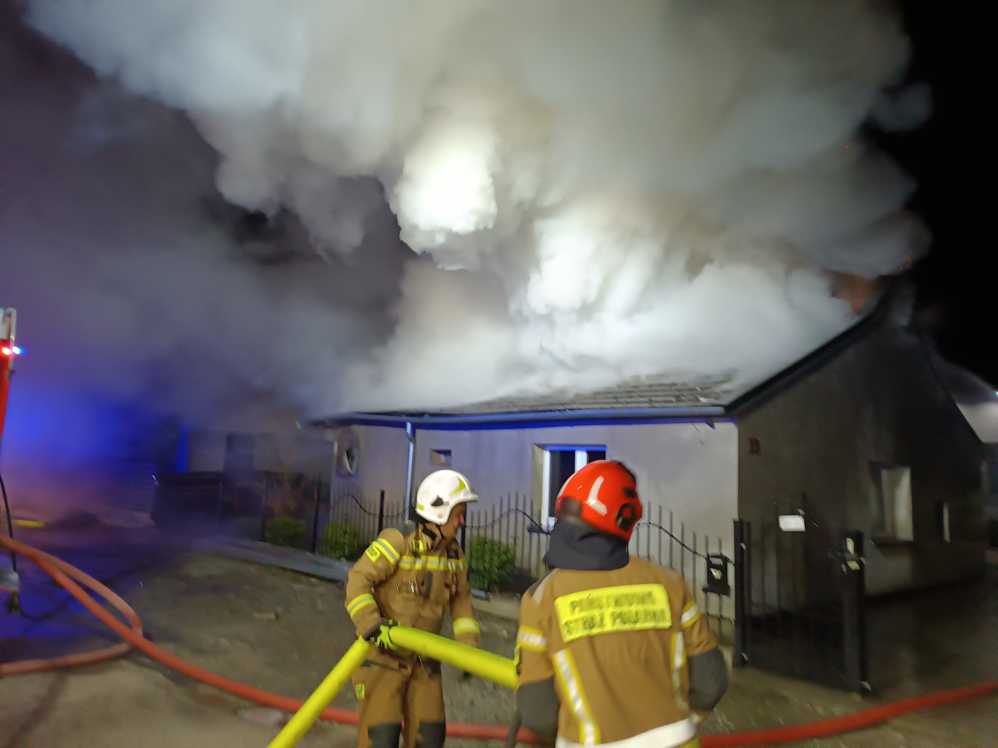 Po przeprowadzeniu rozpoznania stwierdzono, że pali się budynek mieszkalny, pożarem objęte jest poddasze oraz część parteru. Przed przybyciem Jednostek Ochrony Przeciwpożarowej budynek opuściła jedna osoba, która nie wymaga pomocy medycznej. Z budynku wyniesiona została również butla z gazem propan-butan. Część dachu zawaliła się i wpadła do wnętrza budynku, a część drewnianych stropów uległa przepaleniu i wpadła na parter. Pożar zagrażał dwóm sąsiednim budynkom oddalonym o około 6 metrów od budynku objętego pożarem. Działania JOP polegały na zabezpieczeniu miejsca zdarzenia i podaniu prądów wody na palący się budynek oraz w obronie sąsiednich budynków. Skontrolowano butlę z gazem przy pomocy kamery termowizyjnej nie stwierdzono zagrożenia, nie była poddana oddziaływaniu płomieni oraz nie uległa rozszczelnieniu. Wprowadzono rotę wyposażaną w kamerę termowizyjną, sprzęt OUO oraz linię gaśniczą do wnętrza budynku celem jego kontroli nie stwierdzono obecności innych osób wewnątrz budynku. Zaopatrzenie wodne zrealizowano w oparciu o dwa hydranty znajdujące się w bliskiej odległości od miejsca zdarzenia. Po lokalizacji pożaru przystąpiono do prac rozbiórkowych. Przy pomocy podnośnika hydraulicznego oraz pilarek łańcuchowych usunięto krokwie oraz inne drewniane elementy konstrukcji dachu. Usunięte materiały złożono w miejscu bezpiecznym oraz systematycznie przelewano je wodą. Działania ratowniczo - gaśnicze prowadziło łącznie 10 zastępów w tym: 4 zastępy z JRG Bochnia, 2 zastępy z OSP Rzezawa, 2 zastępy z OSP Bratucice, 1 zastęp z OSP Borek, 1 zastęp z OSP Okulice, patrol Policji, Pogotowie Gazowe, Pogotowie Energetyczne. Przyczyny zdarzenia ustala Policja.