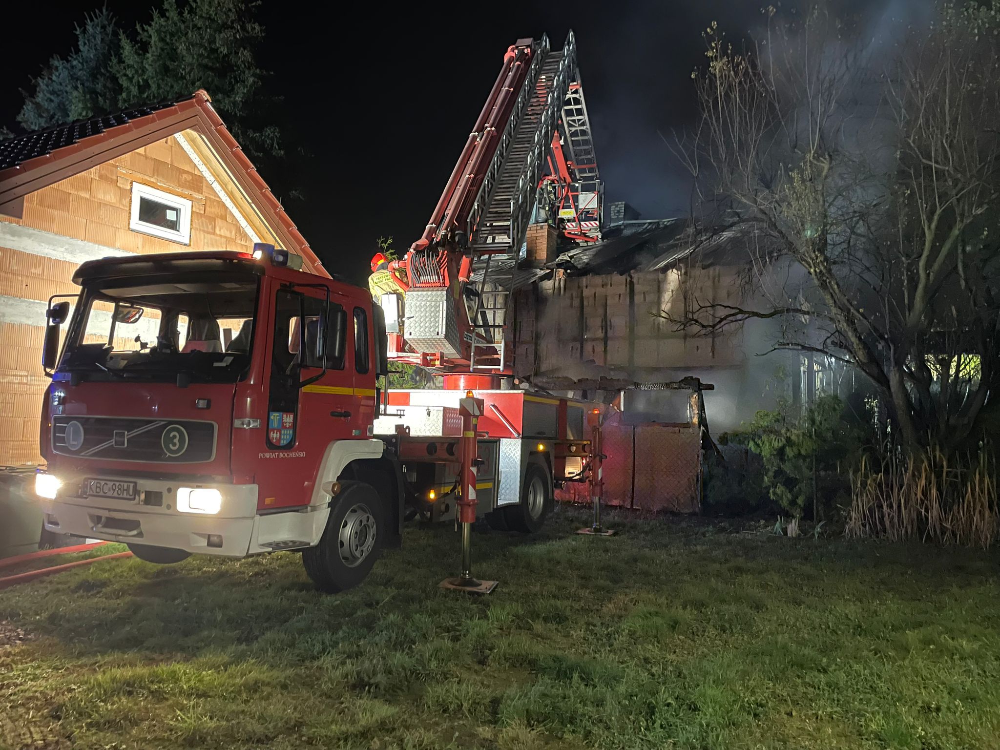 W dniu 31 października 2024 roku około godziny 03:40 w miejscowości Krzeczów, gmina Rzezawa doszło do pożaru w budynku mieszkalnym. Po przeprowadzeniu rozpoznania stwierdzono, że pali się budynek mieszkalny, pożar rozwinął się na dach, brak zagrożonych budynków w sąsiedztwie. Działania zastępów Jednostek Ochrony Przeciwpożarowej polegały na zabezpieczeniu miejsca zdarzenia, podaniu prądu wody na palący się budynek, jednocześnie rota w sprzęcie OUO weszła do budynku w celu przeszukania pomieszczeń, stwierdzono brak przebywania osób w wewnątrz budynku objętego pożarem. Otrzymano również informację, że przed przybyciem zastępów JOP budynek opuściły trzy osoby w tym dwójka dzieci, które nie zgłaszają żadnych dolegliwości i nie potrzebują pomocy medycznej. Odłączono zasilanie budynku w energię elektryczną, gazową oraz fotowoltaiczną. Dalsze działania polegały na podaniu prądu z podnośnika SHD 24, usuwaniu pokrycia dachowego oraz sukcesywnym przelewaniu konstrukcji dachu. Budynek wyposażony był w instalację fotowoltaiczną, która uległa całkowitemu spaleniu. Pogotowie energetyczne odłączyło przyłącz instalacji na słupie elektrycznym w obrębie domu. Ze względu na konstrukcję dachu oraz wykończenie poddasza płytami gipsowymi konieczne było ich usuwanie aby dostać się do spalonych elementów konstrukcji. Po zlokalizowaniu pożaru miejsce zdarzenia skontrolowano ponownie kamerą termowizyjną, nie stwierdzono ognisk pożaru. Na miejsce prowadzonych działań ratowniczo-gaśniczych przybył Komendant Powiatowy Państwowej Straży Pożarnej w Bochni st. bryg. Jacek Ryncarz. Działania ratowniczo - gaśnicze prowadziło łącznie 10 zastępów w tym: 3 zastępy z JRG Bochnia, 1 zastęp z KP PSP Bochnia, 2 zastępy z OSP Rzezawa, 2 zastępy z OSP Bratucice 1 zastęp z OSP Jodłówka, patrol Policji, Pogotowie Gazowe, Pogotowie Energetyczne, Przedstawiciele Gminnego Ośrodka Pomocy Społecznej. Przyczyny zdarzenia ustala Policja.