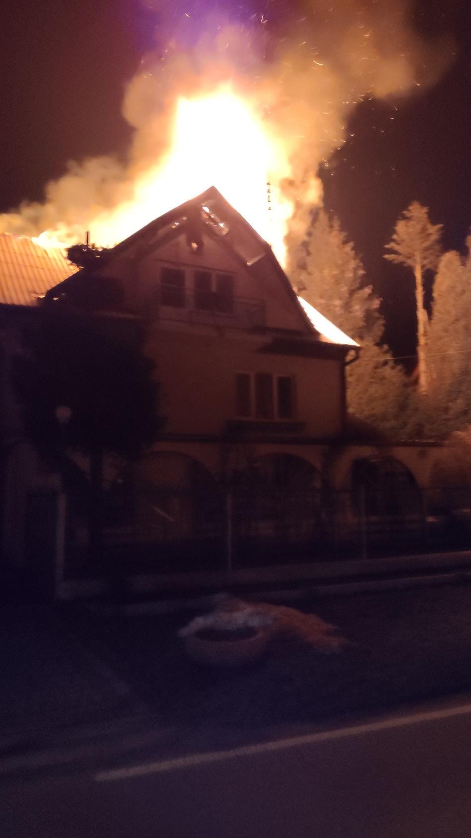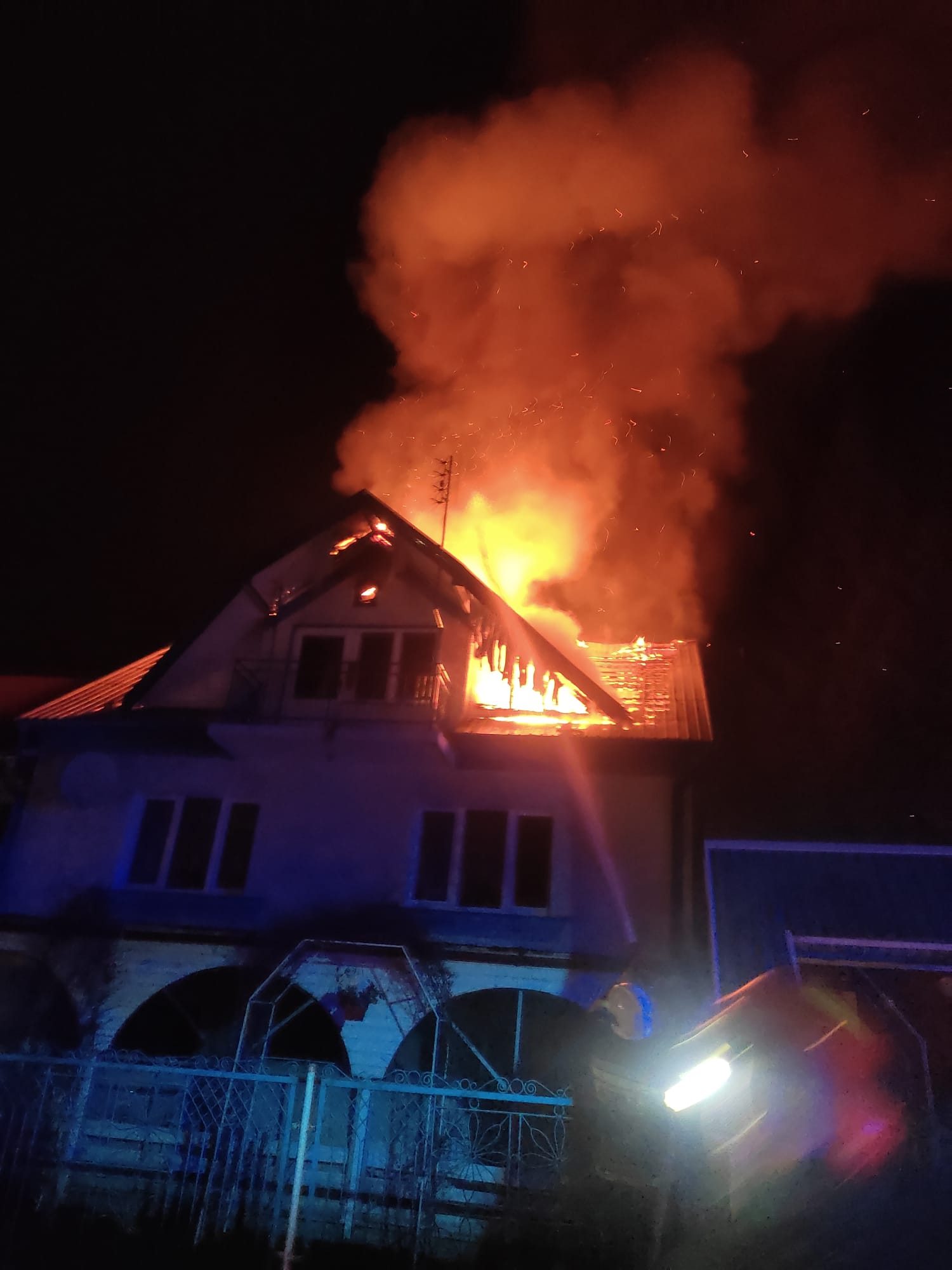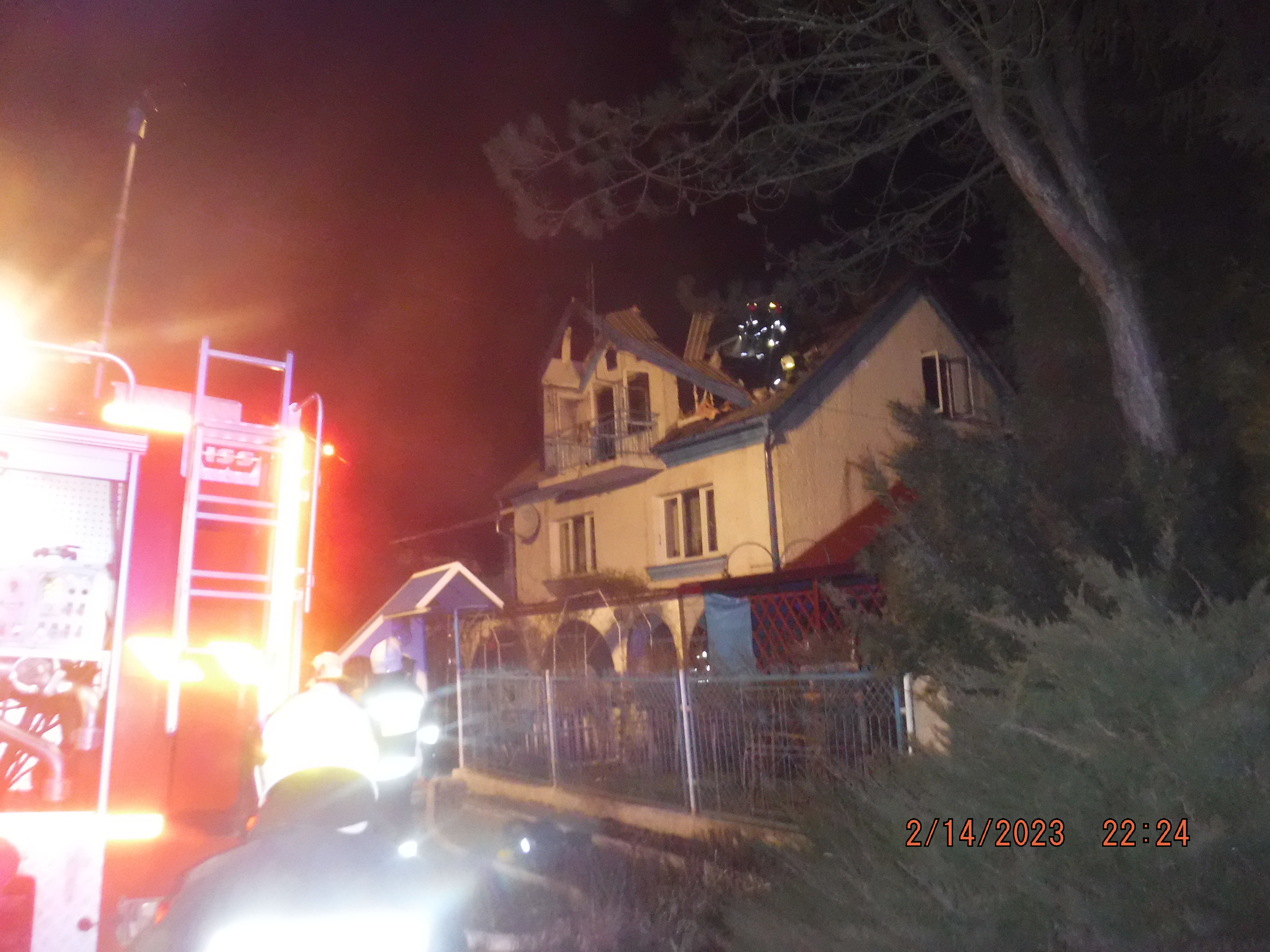 W dniu 14 lutego 2023 roku o godziny 21:17 do Stanowiska Kierowania Komendanta Powiatowego w Bochni wpłynęło zgłoszenie o pożarze poddasza w budynku mieszkalnym w miejscowości Nowy Wiśnicz przy ulicy Olchawskiej . Po przybyciu na miejsce zdarzenia i przeprowadzeniu rozpoznania stwierdzono, że pali się dach i poddasze budynku mieszkalnego. Budynek przed przybyciem Jednostek Ochrony Przeciwpożarowej opuściły dwie osoby - mieszkańcy budynku.. Zasilanie w gaz i energię elektryczna odcięte zostały przez osoby postronne. Działania zastępów OSP polegały na zabezpieczeniu miejsca zdarzenia oraz podaniu 3 prądów wody - dwa prądy w natarciu oraz jeden w obronie dobudówki do domu mieszkalnego. Wprowadzono rotę ratowników do wnętrza budynku na poddasze w aparatach OUO wyposażonych w kamerę termowizyjną. Po przybyciu zastępów z JRG zwiększono zabezpieczany obszar. Wprowadzono kolejną rotę ratowników w aparatach OUO do wnętrza budynku. Po lokalizacji pożaru przystąpiono do prac rozbiórkowych dachu. Po przybyciu zastępu SHD z JRG Brzesko wykonano część prac rozbiórkowych z podnośnika hydraulicznego, pozostałe prace wykonano z drabin przystawnych oraz z poziomu stropu. Nadpalone elementy wyniesiono poza budynek i przelano wodą. Dokonano kontroli poddasza kamerą termowizyjną - miejsca o podwyższonej temperaturze przekopano i przelano wodą. Przybyłe na miejsce pogotowie gazowe zabezpieczyło i skontrolowało instalację gazowa (nie stwierdzono uszkodzeń) a pogotowie energetyczne odłączyło zasilanie w energię elektryczną poprzez odcięcie przewodów zasilających na słupie. Działania ratowniczo – gaśnicze prowadzone były do godziny 23:42. Działania ratowniczo - gaśnicze prowadziło łącznie 10 zastępów w tym: 2 zastępy z JRG Bochnia, 1 zastęp z JRG Brzesko oraz OSP: 2 zastępy OSP Nowy Wiśnicz, OSP Mały Wiśnicz, jeden zastęp OSP Królówka. OSP Stary Wiśnicz, OSP Połom Duży oraz Policja, Pogotowie Energetyczne i Gazowe oraz Zespół Ratownictwa Medycznego. Przyczyny pożaru ustala Policja.