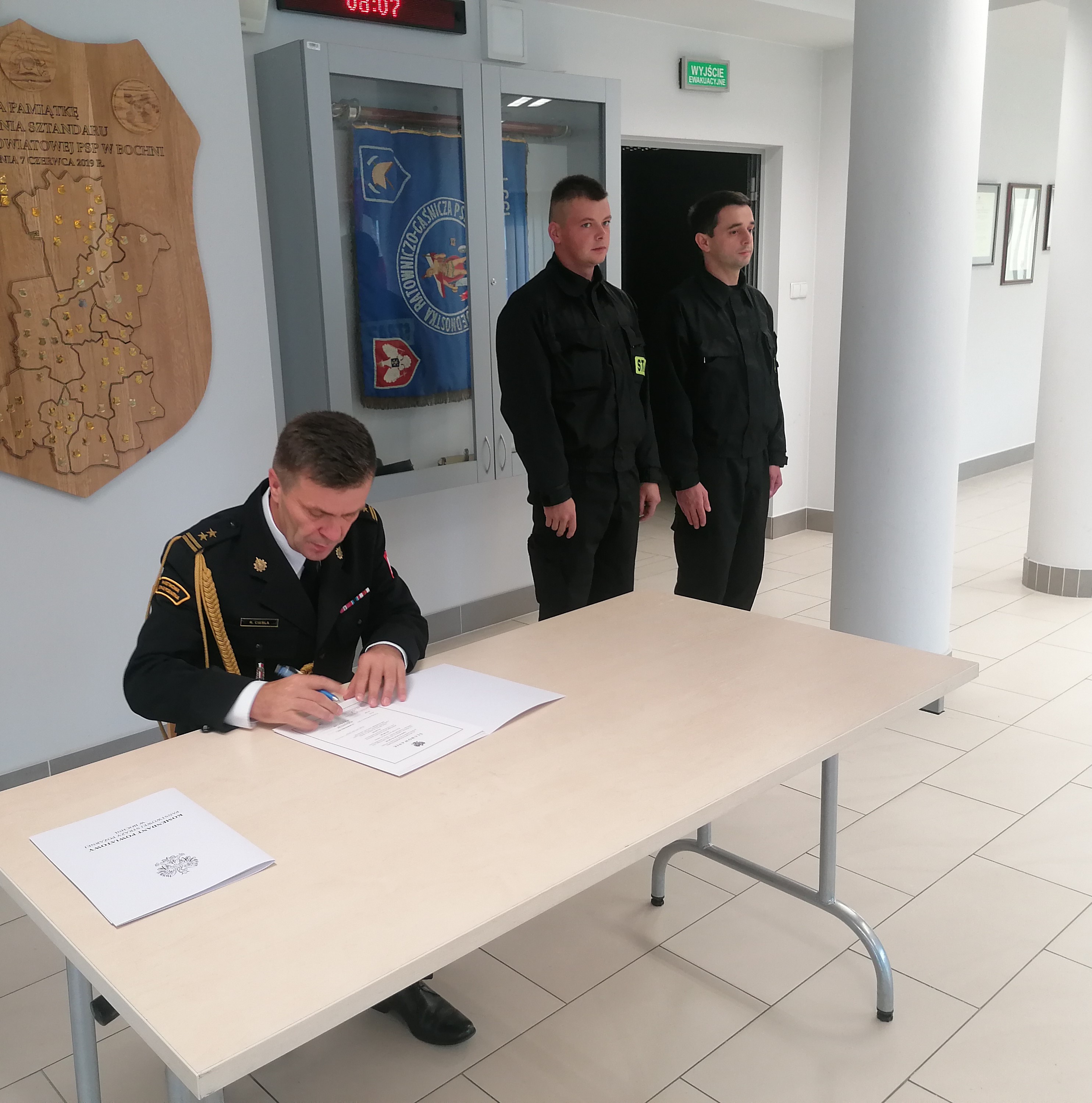 Dnia 12 października 2022 roku w siedzibie Komendy Powiatowej Państwowej Straży Pożarnej w Bochni odbyło się uroczyste ślubowanie dwóch, nowo przyjętych do służby w PSP, strażaków. Ślubowanie przyjął Komendant Powiatowy Państwowej Straży Pożarnej bryg. Robert Cieśla, w obecności Zastępcy Komendanta Powiatowego Państwowej Straży Pożarnej st. bryg. Piotra Gadowskiego oraz funkcjonariuszy i pracowników Komendy.