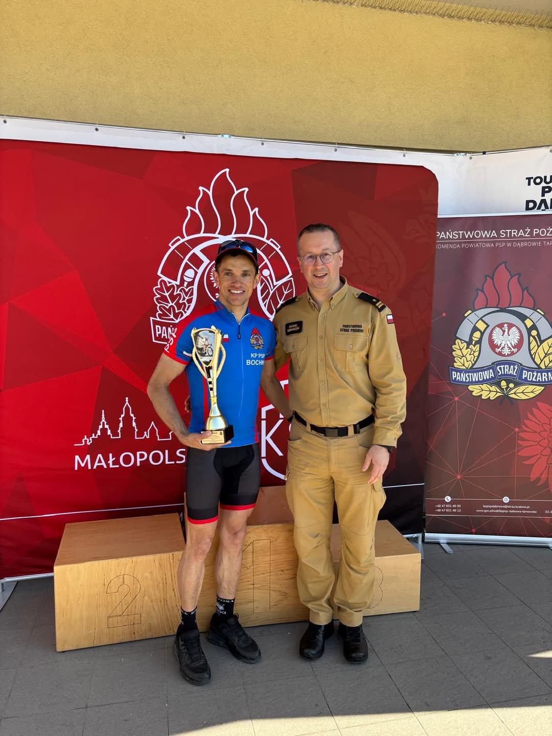 W dniu 27 kwietnia 2025 roku w Dąbrowie Tarnowskiej w ramach wyścigu kolarskiego Tour de Powiśle Dąbrowskie odbyły się II Mistrzostwa Małopolskich Strażaków o puchar Małopolskiego Komendanta Wojewódzkiego Państwowej Straży Pożarnej. W zawodach tych udział wziął przedstawiciel naszej Komendy asp. Marcin Kasprzyk, który w 2022 roku zdobywał tytuł Mistrza Polski Strażaków w kolarstwie szosowym. W zawodach wzięło udział łącznie 10 strażaków reprezentujących małopolskie komendy. Ostatecznie funkcjonariusz naszej Komendy znalazł się na pierwszym miejscu podium zdobywając tym samym Puchar Małopolskiego Komendanta Wojewódzkiego oraz tytuł Mistrza Małopolskich Strażaków w kolarstwie szosowym.