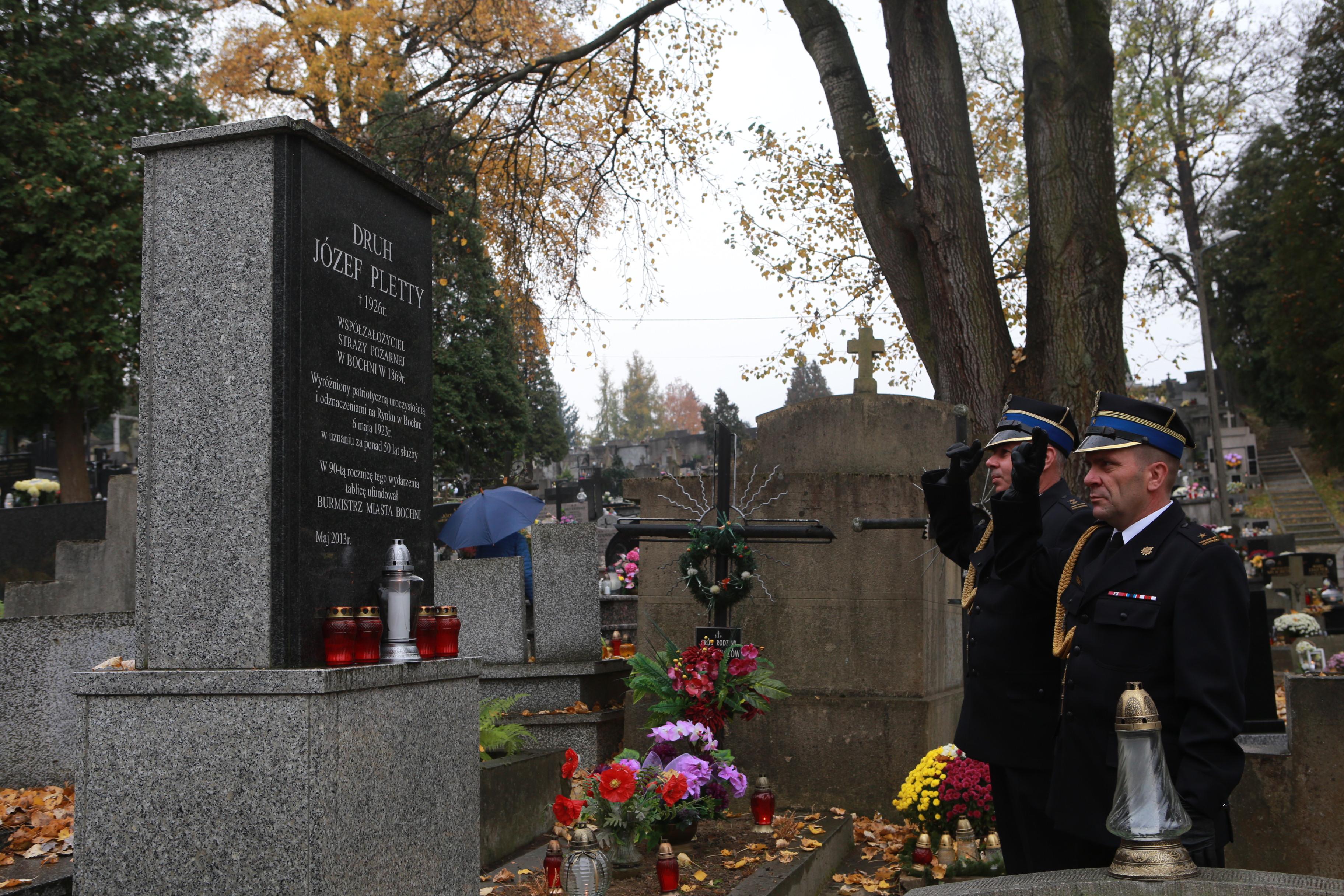 W hołdzie strażakom, którzy odeszli na wieczną służbę w Dzień Zaduszny 2 listopada 2021 r. Kierownictwo Komendy Powiatowej Państwowej Straży Pożarnej w Bochni zapaliło znicze na grobach: druha Józefa Pletty, współzałożyciela Straży Pożarnej w Bochni w 1869 r.; druha Józefa Turka, współzałożyciela Straży Pożarnej w Bochni, wieloletniego Burmistrza Miasta Bochni; druha Jana Kuca, sekretarza Zarządu Głównego Związku Straży Pożarnych RP, V-ce Prezesa Zarządu Wojewódzkiego Związku Straży Pożarnych woj. Krakowskiego, Naczelnika III Okręgu, nieetatowego Komendanta zawodowego Miejskiego Pogotowia Straży Pożarnej Miasta Bochni oraz st. kpt. Andrzeja Kęcika, Dowódcy JRG, który zginął w 1993 r. Kierownictwo i funkcjonariusze Komendy Powiatowej Państwowej Straży Pożarnej w Bochni od wielu lat oddają hołd zmarłym strażakom, którzy w ponad 150- letniej jej historii zasłużyli się dla rozwoju ochrony przeciwpożarowej na terenie miasta Bochni, regionu i kraju.
