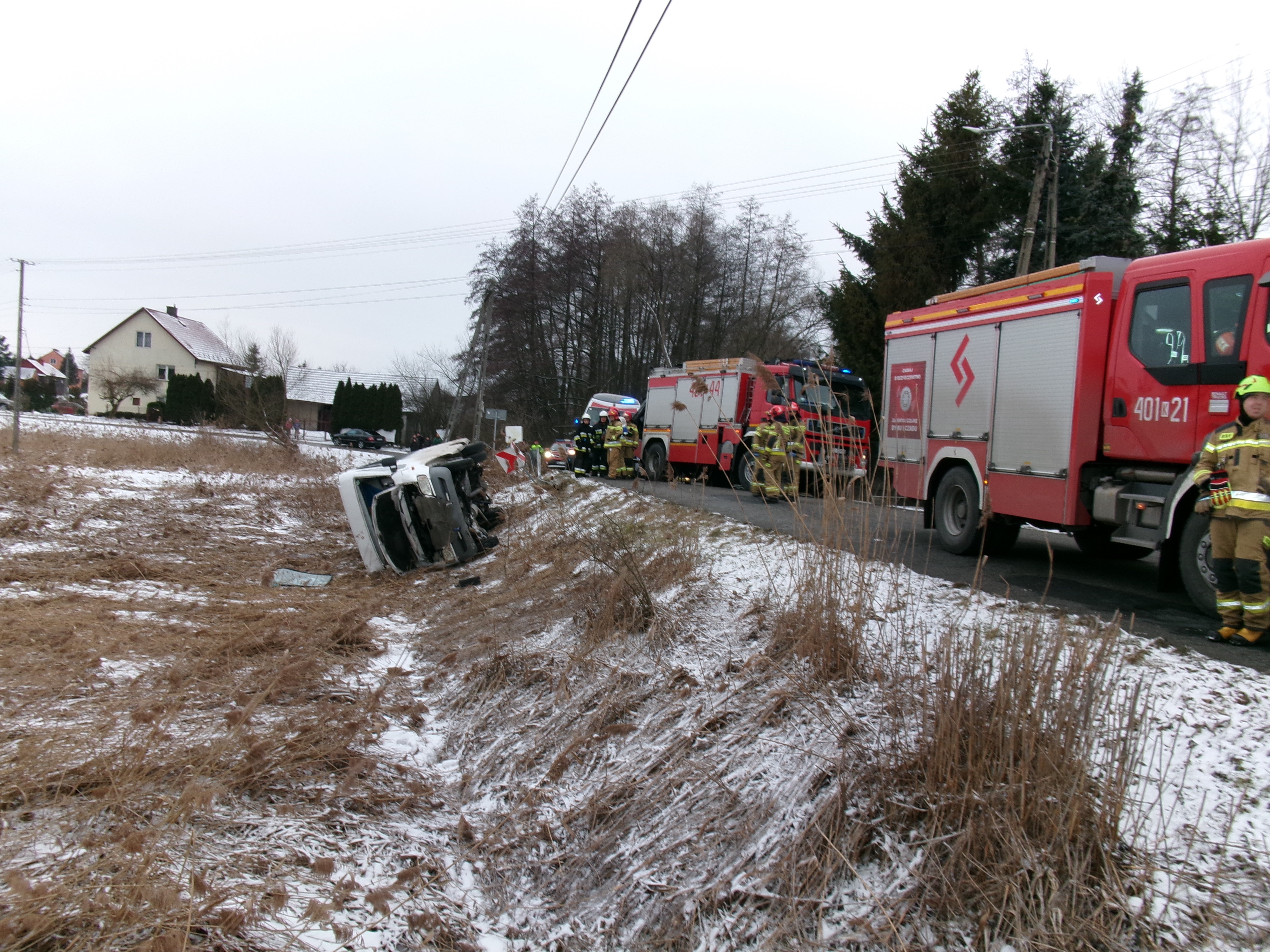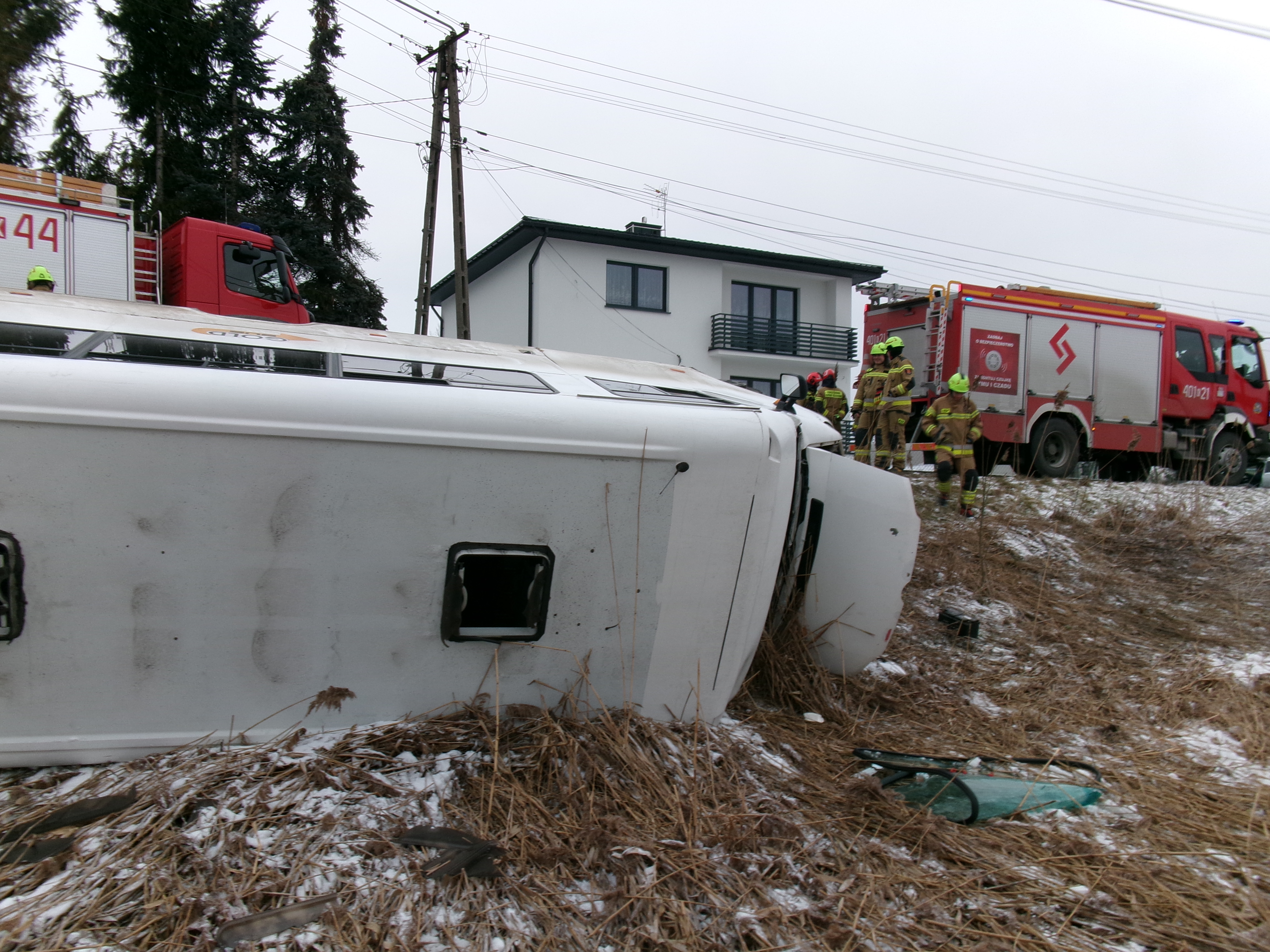 W dniu 09 lutego 2026 roku około godziny 13:19 w miejscowości Krzeczów doszło do wypadku busa przewożącego pasażerów. Po przybyciu na miejsce zdarzenia jednostek JOP i przeprowadzeniu rozpoznania stwierdzono, że bus pasażerski na łuku wypadł z drogi i przewrócił się na prawy bok. Pojazdem podróżowało łącznie 9 osób (kierowca i 8 pasażerów w tym jedna osoba niepełnoletnia). Osoby podróżujące opuściły samodzielnie pojazd przed przybyciem zastępów Straży Pożarnej. Przybyłe na miejsce zdarzenia Zespoły Ratownictwa Medycznego przeprowadziły segregacje osób biorących udział w zdarzeniu i ustaliły że dwie osoby doznały niewielkich urazów, pozostałe nie zgłaszają dolegliwości i nie wymagają pomocy medycznej. Ruch na drodze był całkowicie zablokowany. Działania jednostek ochrony przeciwpożarowej polegały na zabezpieczeniu miejsca zdarzenia, odłączeniu akumulatora w pojeździe, zabezpieczeniu wycieku substancji ropopochodnej. Jedna z osób poszkodowanych została zabrana do szpitala celem dalszej diagnostyki, pozostali pasażerowie udali się w dalsza podróż pojazdem zastępczym podstawionym przez przewoźnika oraz zostali zabrani przez bliskich z rodziny. Na miejsce zdarzenia przybył Zastępca Komendanta Powiatowego Państwowej Straży Pożarnej w Bochni st. kpt. Bartłomiej Łącki. Działania ratownicze prowadziło łącznie 6 zastępów w tym: 4 zastępy z JRG Bochnia, 1 zastęp z OSP Rzezawa, 1 zastęp z OSP Krzeczów, dwa Zespoły Ratownictwa Medycznego, dwa patrole Policji. Przyczyny zdarzenia ustala Policja