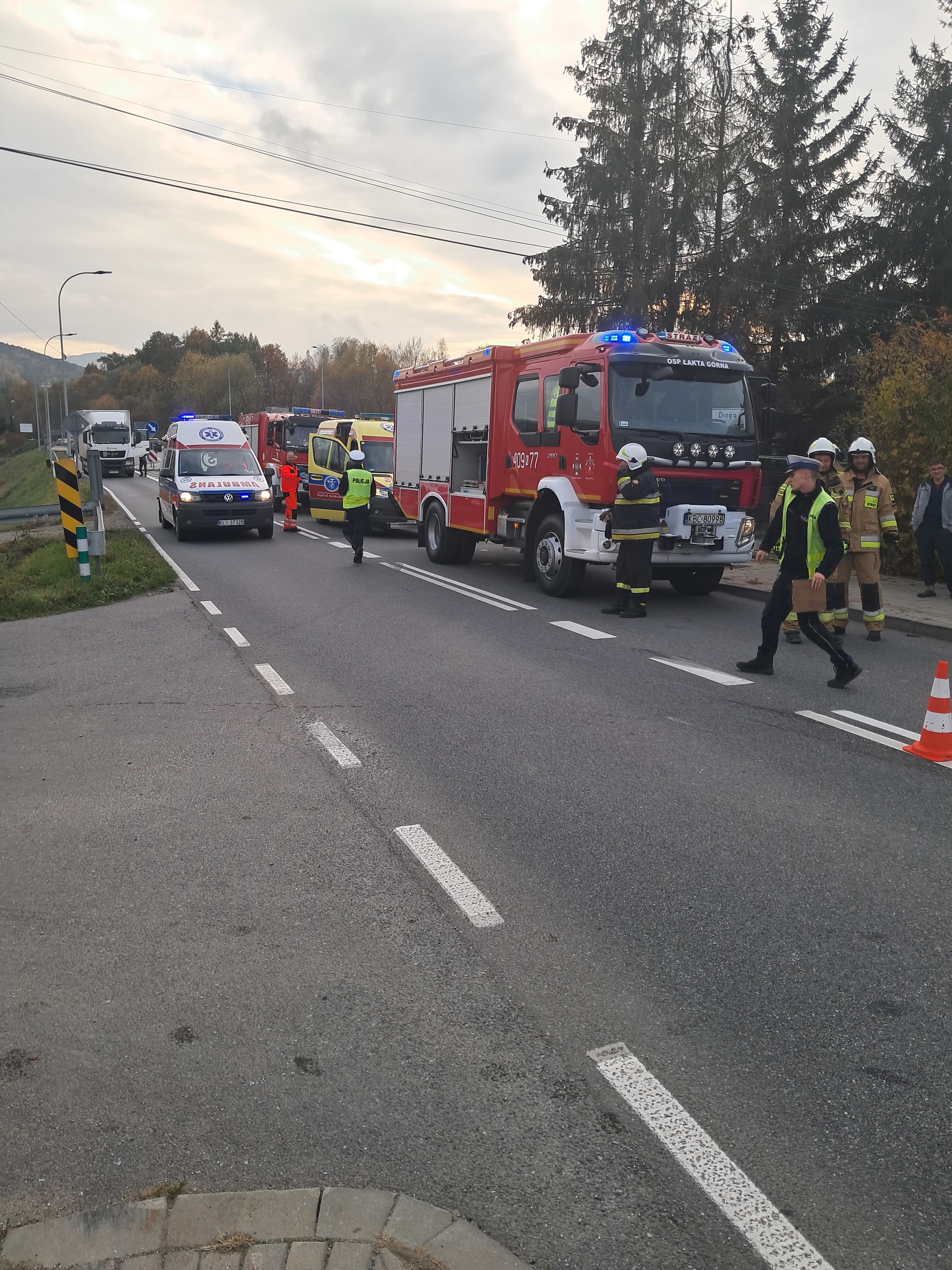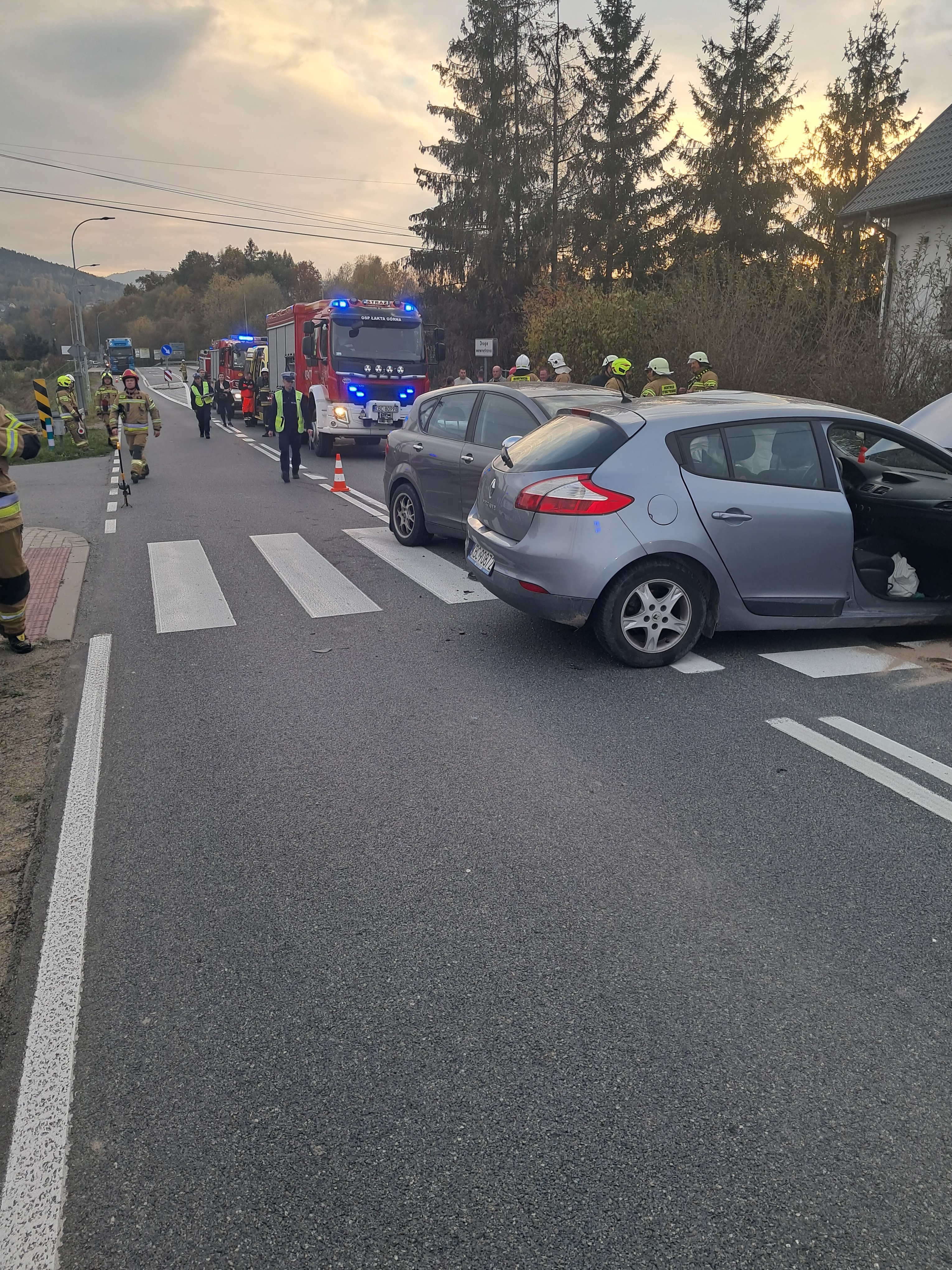 W dniu 29 października 2024 roku około godziny 14:45 w miejscowości Łąkta Górna na drodze wojewódzkiej doszło do zderzenia dwóch samochodów osobowych. Pojazdami łącznie podróżowało sześć osób w tym trójka dzieci. Przybyłe na miejsce zdarzenia Zespoły Ratownictwa Medycznego po przebadaniu wszystkich osób biorących udział w zdarzeniu, pięć osób w tym trójka dzieci zostały zabrane do Szpitala w Bochni i Limanowej w celu dalszej hospitalizacji. Działania jednostek ochrony przeciwpożarowej polegały na zabezpieczeniu miejsca zdarzenia (pojazdy, stożki ostrzegawcze, lampy błyskowe), odłączeniu akumulatorów w samochodach osobowych oraz kierowaniu ruchem na drodze wojewódzkiej. Po zakończeniu czynności prowadzonych przez Policje pojazdy zostały przestawione na pobocze, jezdnia została uprzątnięta z odpadów powypadkowych, a następnie ruch na drodze wojewódzkiej został przywrócony. Działania ratowniczo - gaśnicze prowadziło łącznie 7 zastępów w tym: 3 zastępy z JRG Bochnia, 1 zastęp z OSP Łąkta Górna, 2 zastępy z OSP Trzciana, 1 zastęp z OSP Żegocina oraz cztery Zespoły Ratownictwa Medycznego i dwa patrole Policji. Przyczyny zdarzenia ustala Policja.
