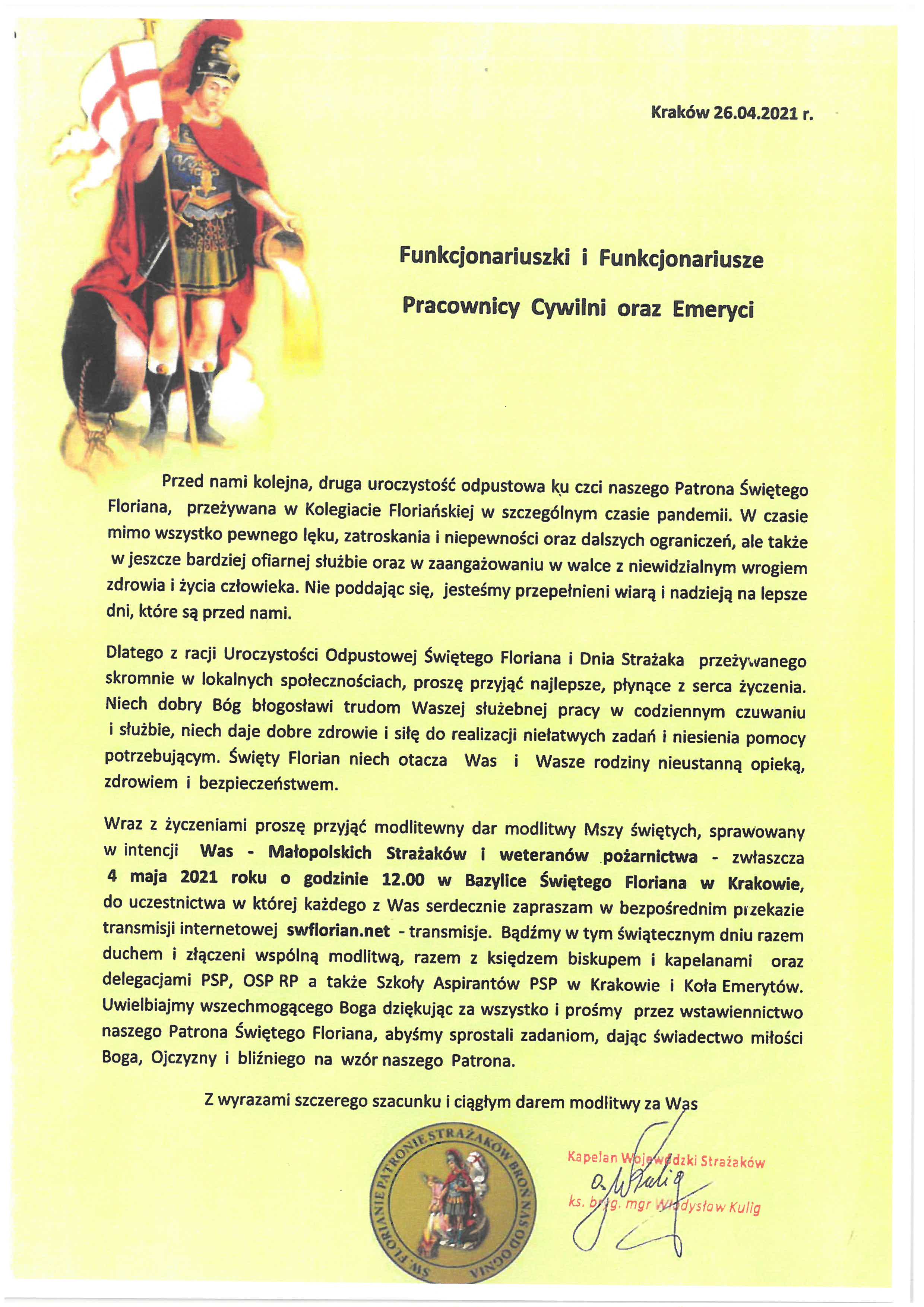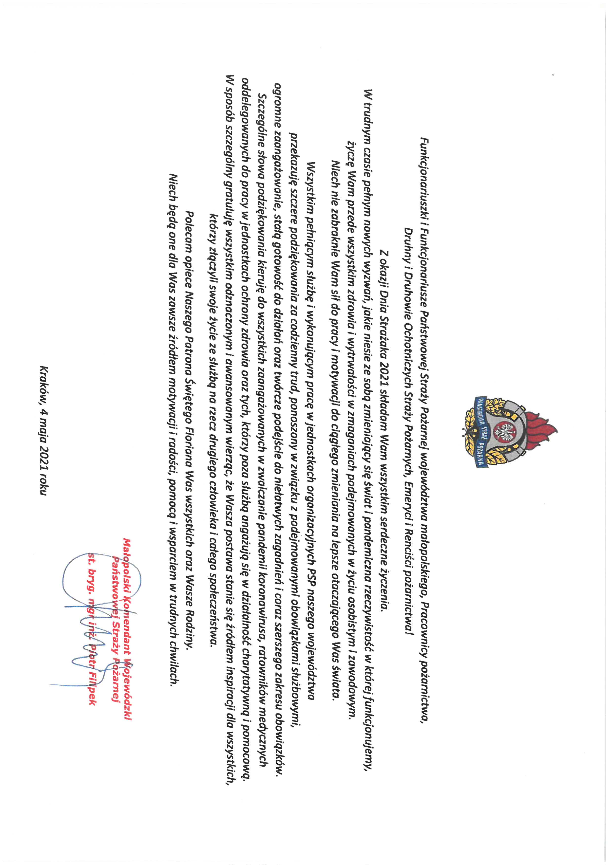 Życzenia Małopolskiego Komendanta Wojewódzkiego PSP z okazji Dnia Strażaka 04.05.2021 Zdjęcia (2) Pokaż zdjęcie 1 z galerii. Pokaż zdjęcie 2 z galerii.