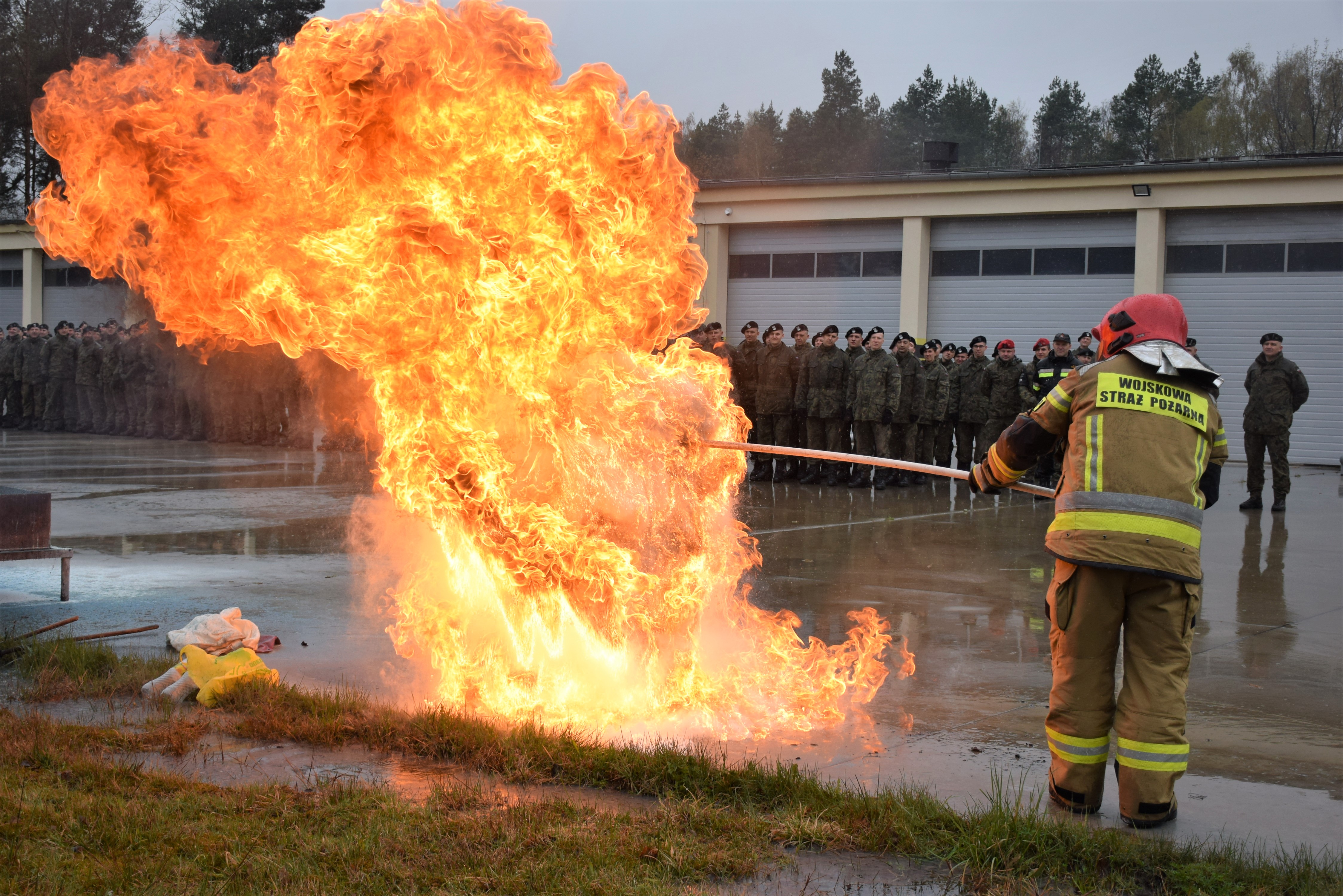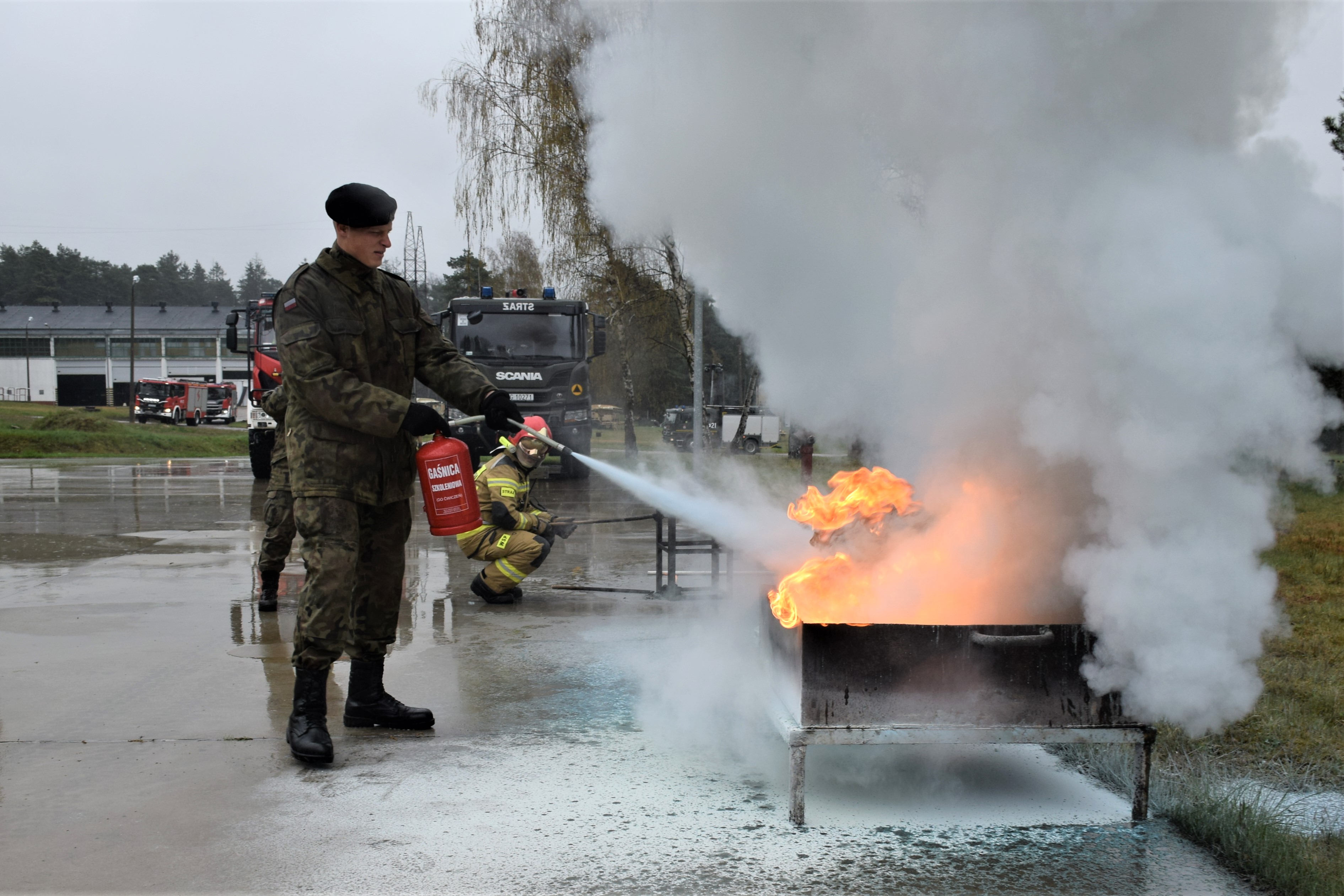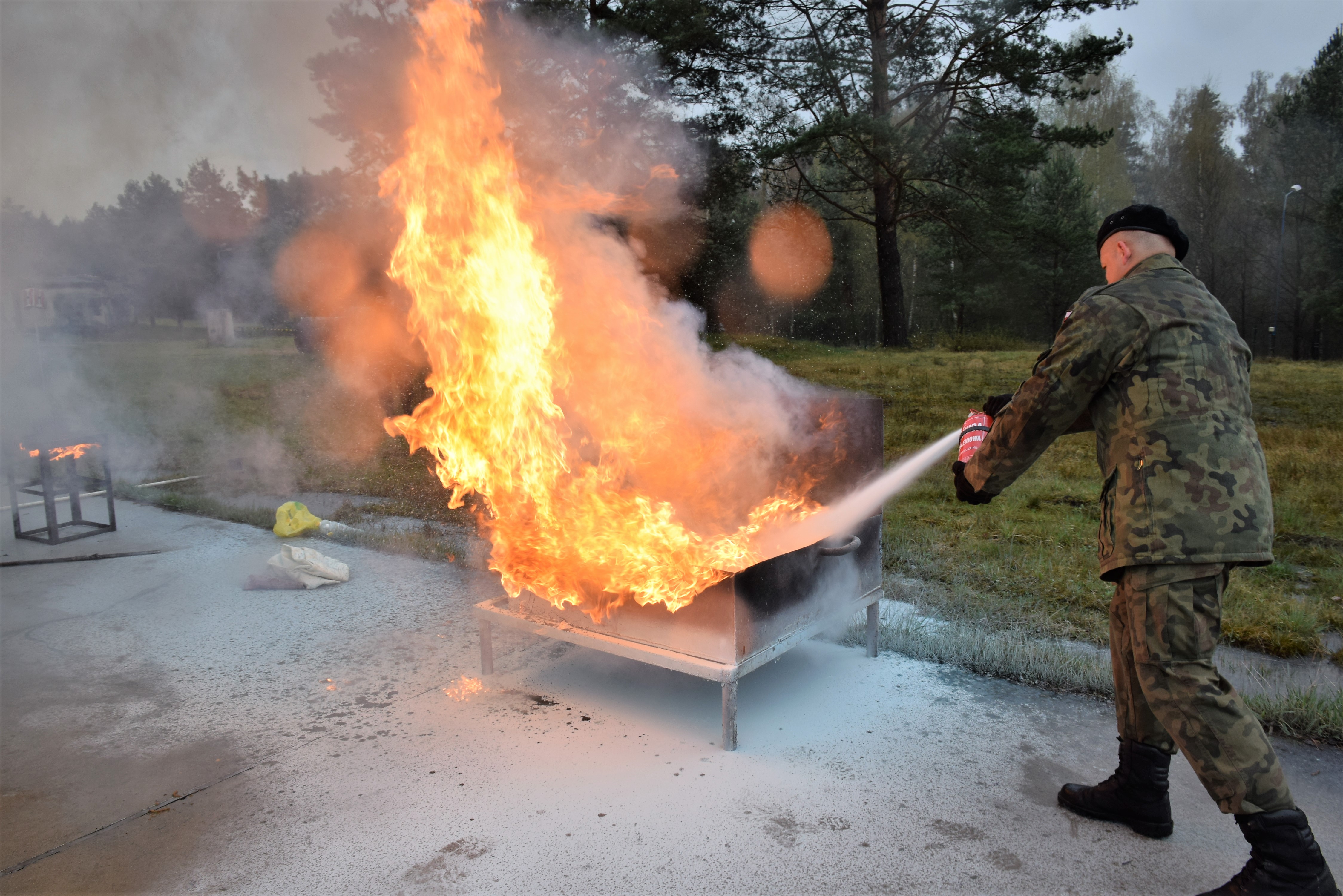 W drugiej części ćwiczeń, komendant wojskowej straży pożarnej, przeprowadził szkolenie obejmujące zasady obsługi podręcznego sprzętu gaśniczego, połączone z praktycznym gaszeniem kontrolowanego pożaru, w tym pożaru oleju jadalnego. Ponadto odbył się też pokaz niekontrolowanego rozwoju pożaru oleju przy zastosowaniu wody jako nieodpowiedniego środka gaśniczego.