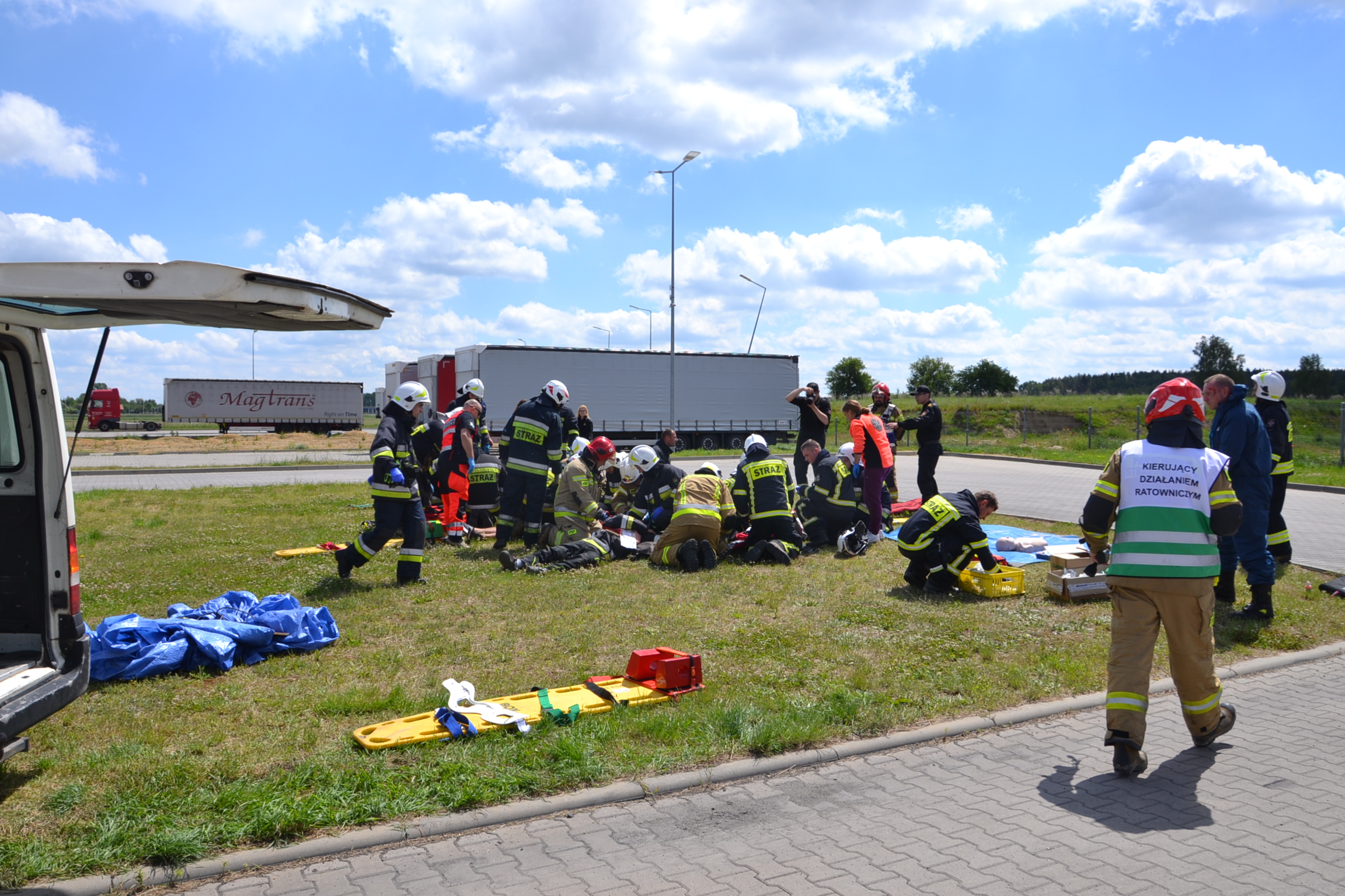 Podczas realizacji pierwszego epizodu ćwiczeń, który miał miejsce w pomieszczeniu magazynowym serwisu samochodów ciężarowych ESA DAF, strażacy mieli postawione zadania ewakuacji 2 osób z pomieszczenia zadymionego oraz z dachu budynku i ugaszenia pożaru wewnątrz magazynu. W drugim epizodzie dochodzi do wypadku dwóch samochodów osobowych i pojazdu typu bus. Jeden z pojazdów osobowych był o napędzie elektrycznym . Z uwagi na ilość osób podróżujących pojazdami – zdarzenie miało charakter masowy. Strażacy zabezpieczyli miejsce zdarzenia, zrobili dostęp do poszkodowany przy pomocy narzędzi hydraulicznych i ewakuowali poszkodowanych (8 osób) do strefy bezpiecznej . Tam została przeprowadzona segregacja, która ma miejsce przy zdarzeniach z dużą ilością osób poszkodowanych, kiedy zapotrzebowanie na kwalifikowaną pierwszą pomoc i medyczne czynności ratunkowe przekracza możliwości podmiotów ratowniczych obecnych na miejscu zdarzenia.