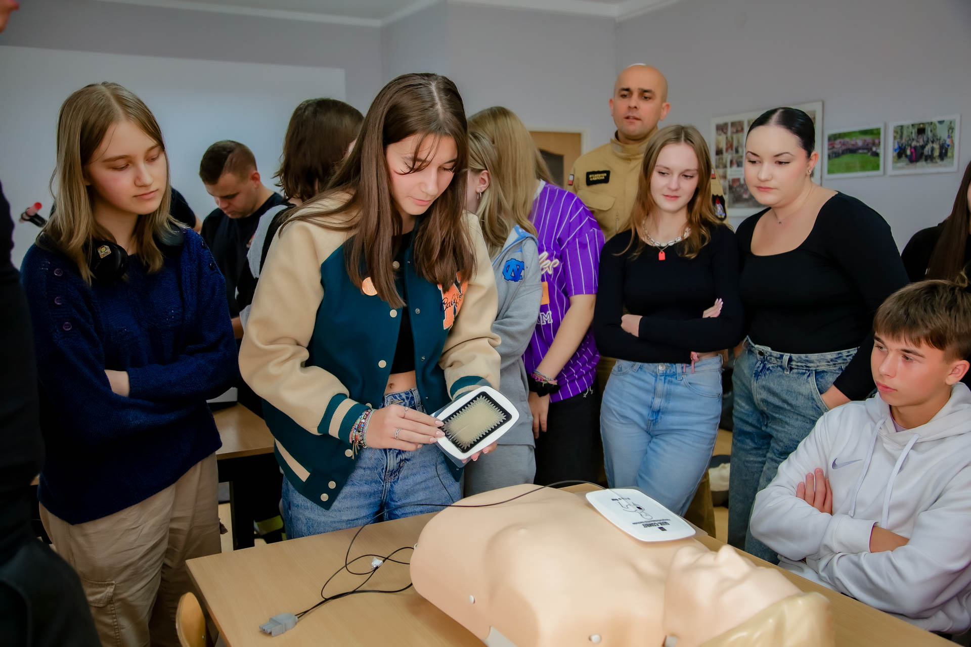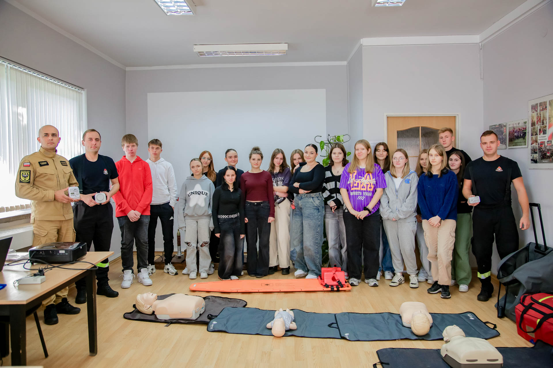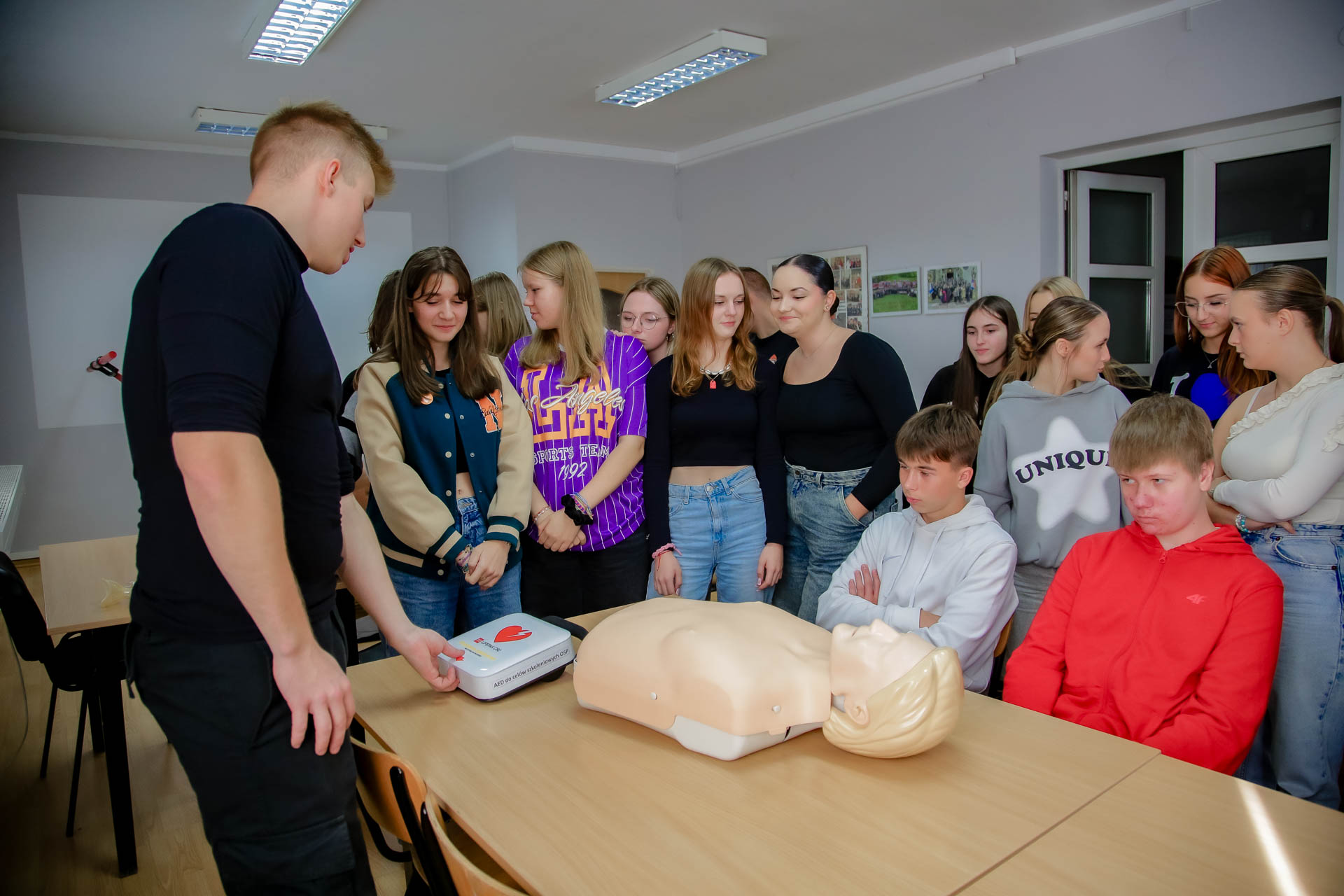 Ponadto młodzież uczestniczyła w praktycznych ćwiczeniach resuscytacji krążeniowo oddechowej, udrażaniania dróg oddechowych, stabilizacji kóńczyn górnych. Poznali zasady bezpiecznego używania automatycznego defibrylatora AED.