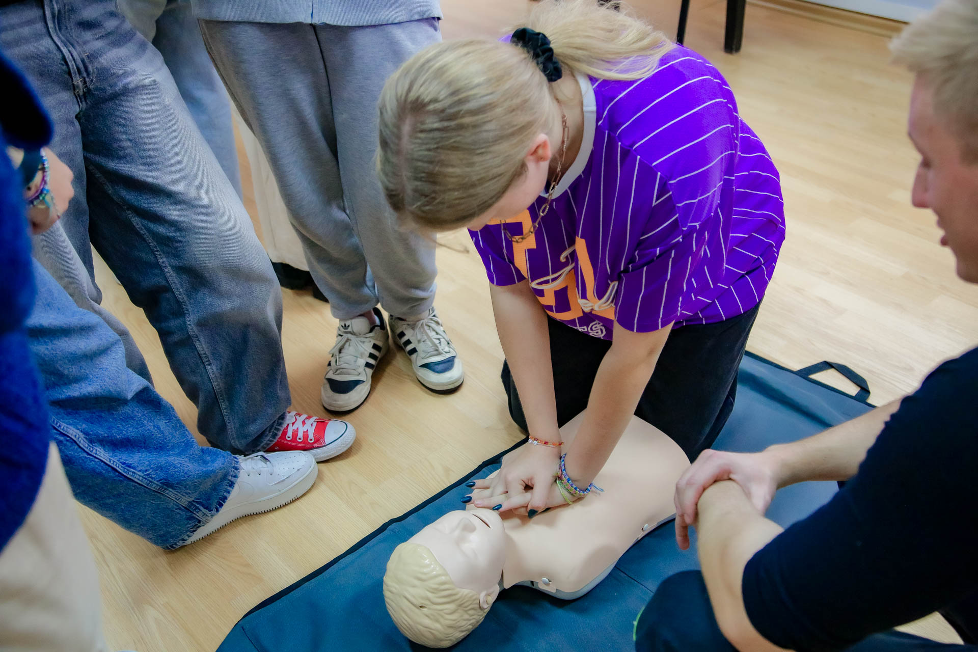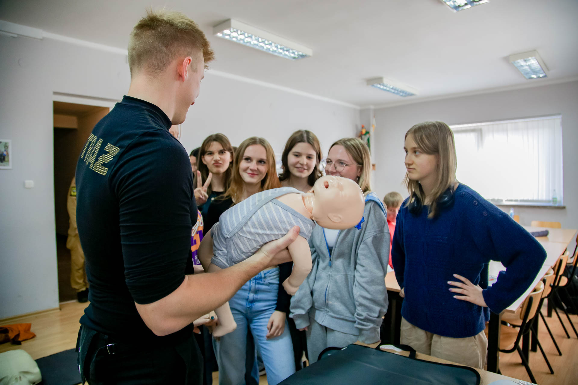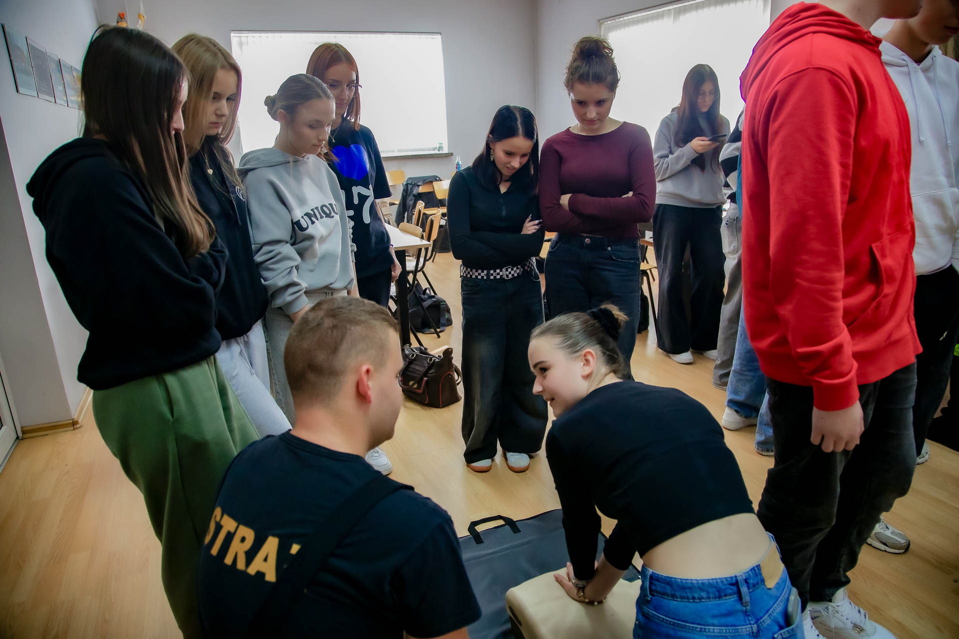 Ponadto młodzież uczestniczyła w praktycznych ćwiczeniach resuscytacji krążeniowo oddechowej, udrażaniania dróg oddechowych, stabilizacji kóńczyn górnych. Poznali zasady bezpiecznego używania automatycznego defibrylatora AED.