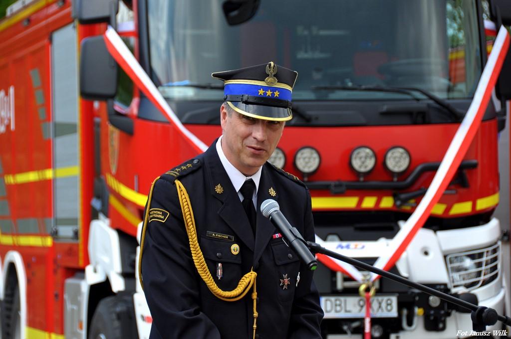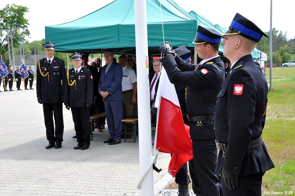 Zgodnie z ceremoniałem pożarniczym po złożeniu meldunku przez dowódcę uroczystości dla Zastępcy Dolnośląskiego Komendanta Wojewódzkiego PSP st. bryg. Andrzeja Fischera podniesiono na maszt flagę państwową i odśpiewano hymn państwowy.