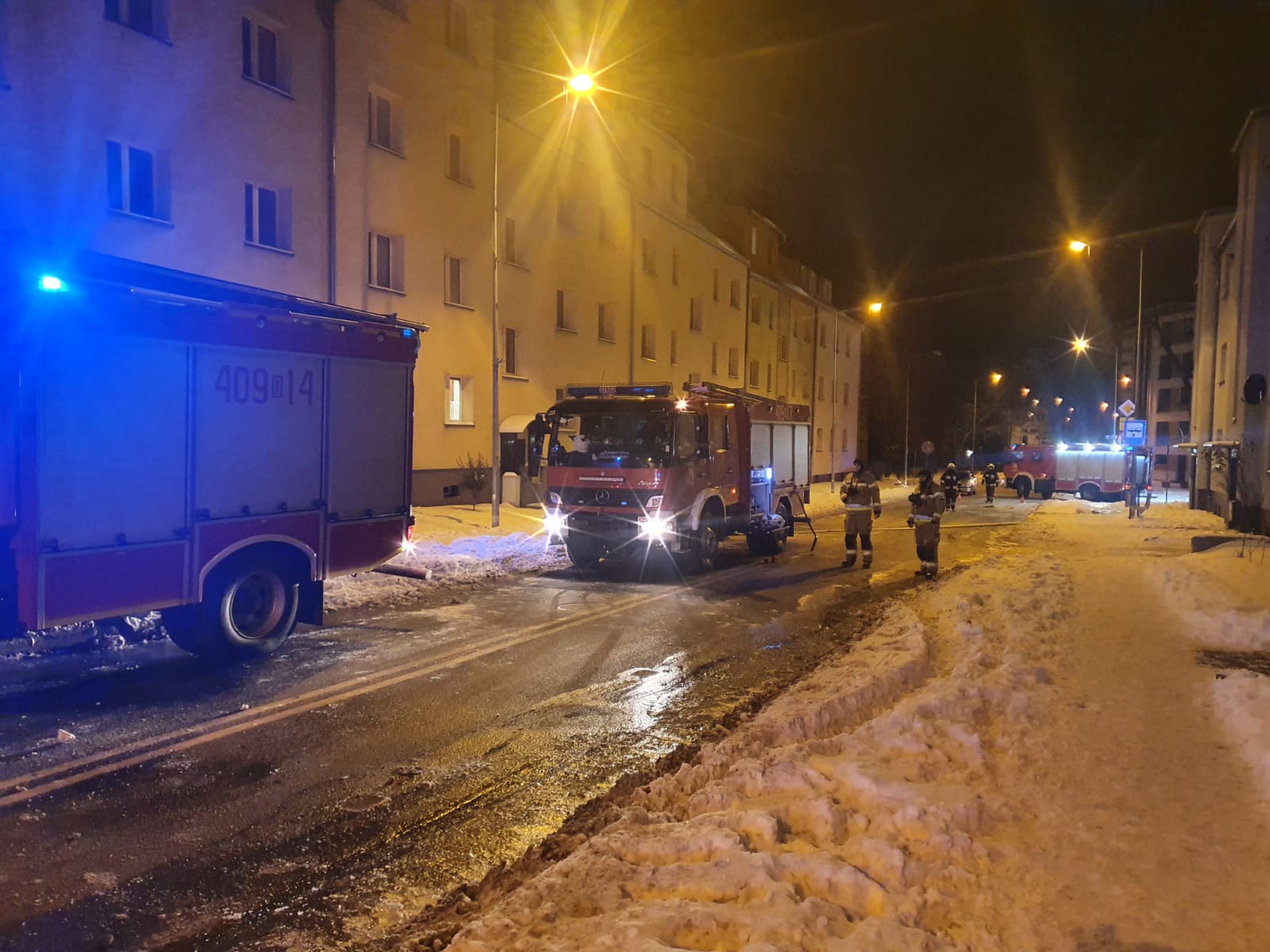 W dniu 12.02.2021 r. ok. godz. 23:00 do Stanowiska Kierowania Komendanta Powiatowego PSP w Bolesławcu wpłynęło zgłoszenie o pożarze mieszkania na poddaszu przy ul. Żwirki i Wigury. Dyżurny natychmiast zadysponował 3 zastępy z JRG Bolesławiec oraz OSP z Nowogrodźca, Trzebienia, Ocic i Brzeźnika. Po dotarciu pierwszych zastępów na miejsce pożaru, strażacy zastali bardzo duże zadymienie na ulicy. Z okna mieszkania na 3 piętrze wydobywał się bardzo intensywny dym. Strażacy w aparatach ochrony układu oddechowego, weszli z linią gaśniczą do środka budynku, podając prąd gaśniczy wody do środka mieszkania oraz przez okno z drabiny mechanicznej. Przeprowadzono ewakuację lokatorów z mieszkań w budynku objętym pożarem i sąsiedniego, do którego przedostawało się zadymienie, łącznie 22 osoby. W trakcie gaszenia pożaru strażacy zaczęli przeszukiwać mieszkanie, w którym znaleźli nieprzytomnego mężczyznę. Natychmiast został on ewakuowany na zewnątrz budynku i przekazany zespołowi ratownictwa medycznego. Po trwającej ok 40 min. reanimacji zespół ZRM przekazał informację o zgonie poszkodowanego.