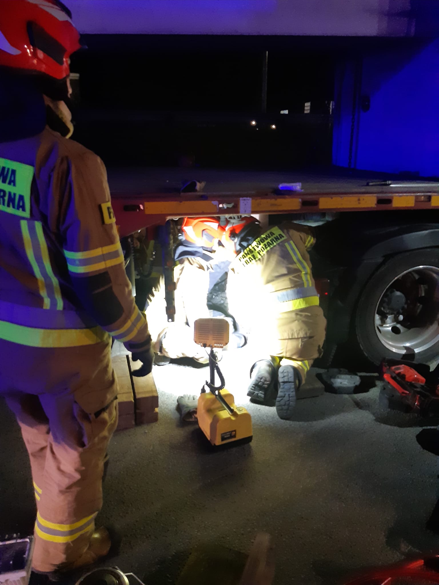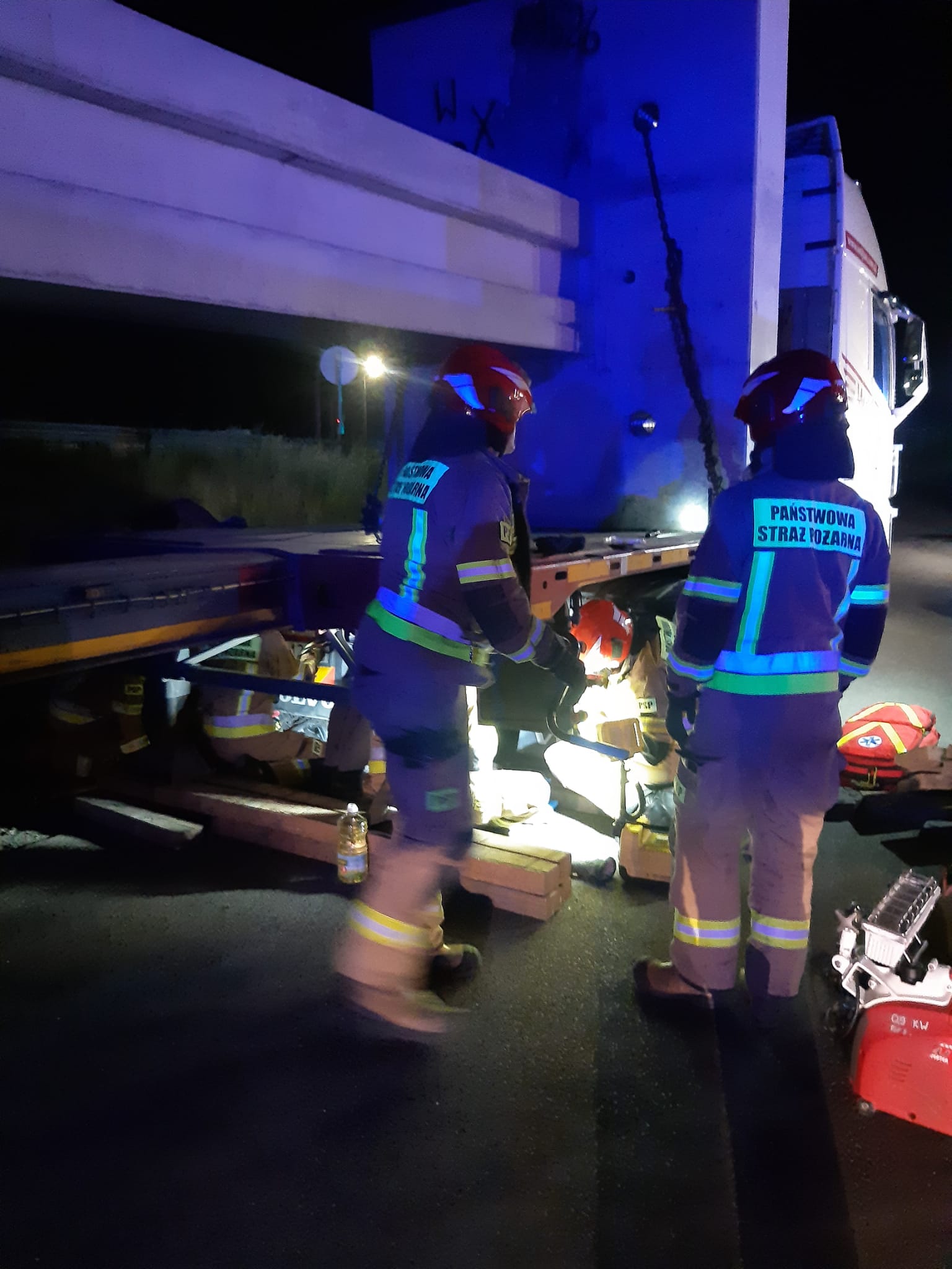 Działania strażaków polegały na ustabilizowaniu pojazdu, demontażu elementu konstrukcyjnego z ciągnika siodłowego w celu wykonania dostępu do poszkodowanego, a następnie jego uwolnieniu i przekazaniu zespołowi ratownictwa medycznego.