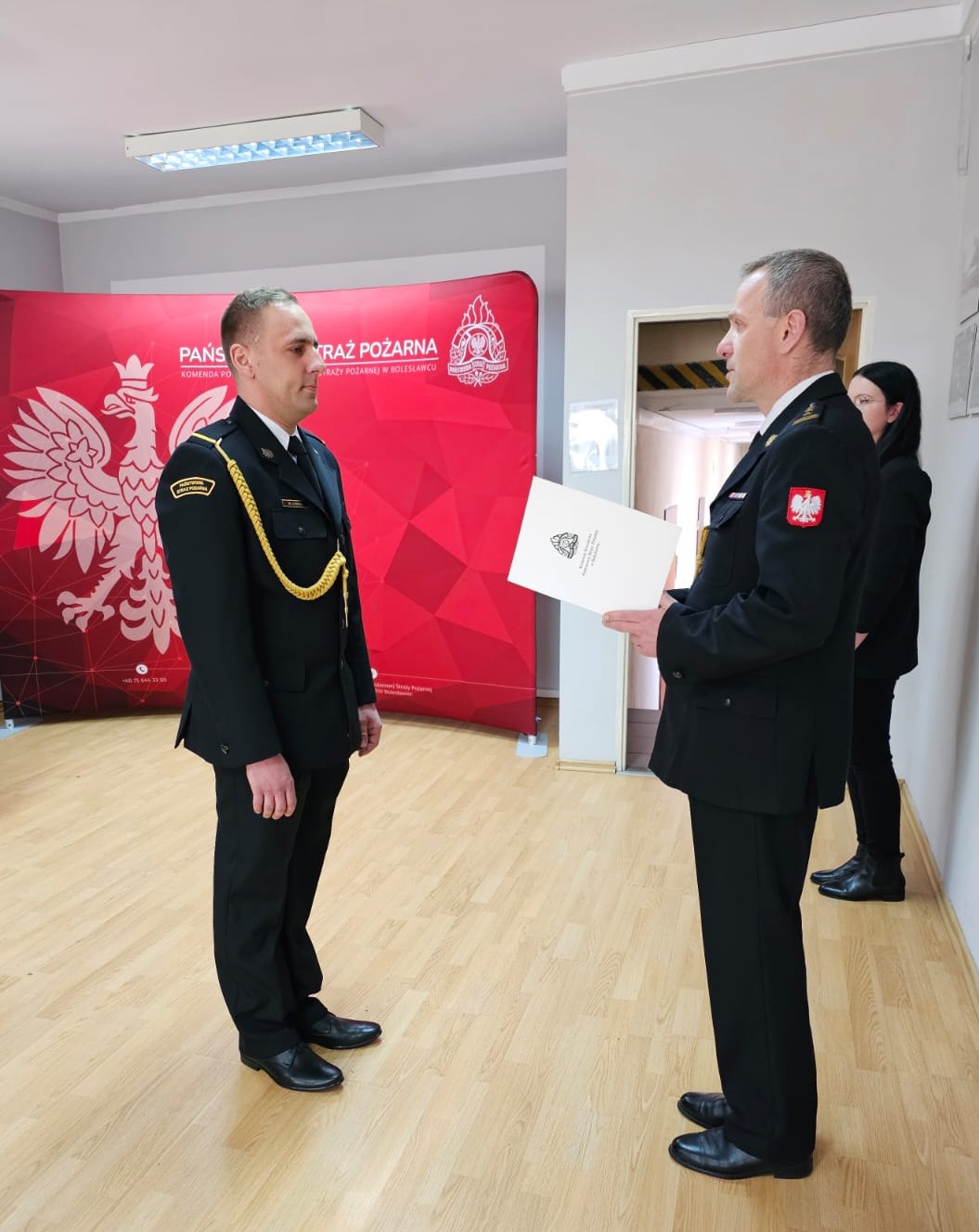 Podczas zbiórki Komendant Powiatowy PSP w Bolesławcu wręczył akty awansowe następującym funkcjonariuszom: