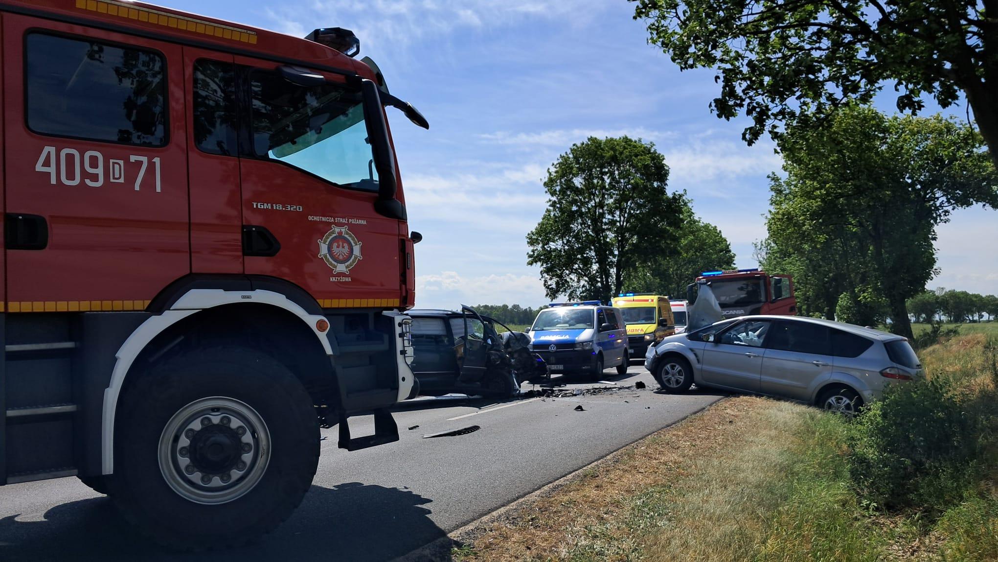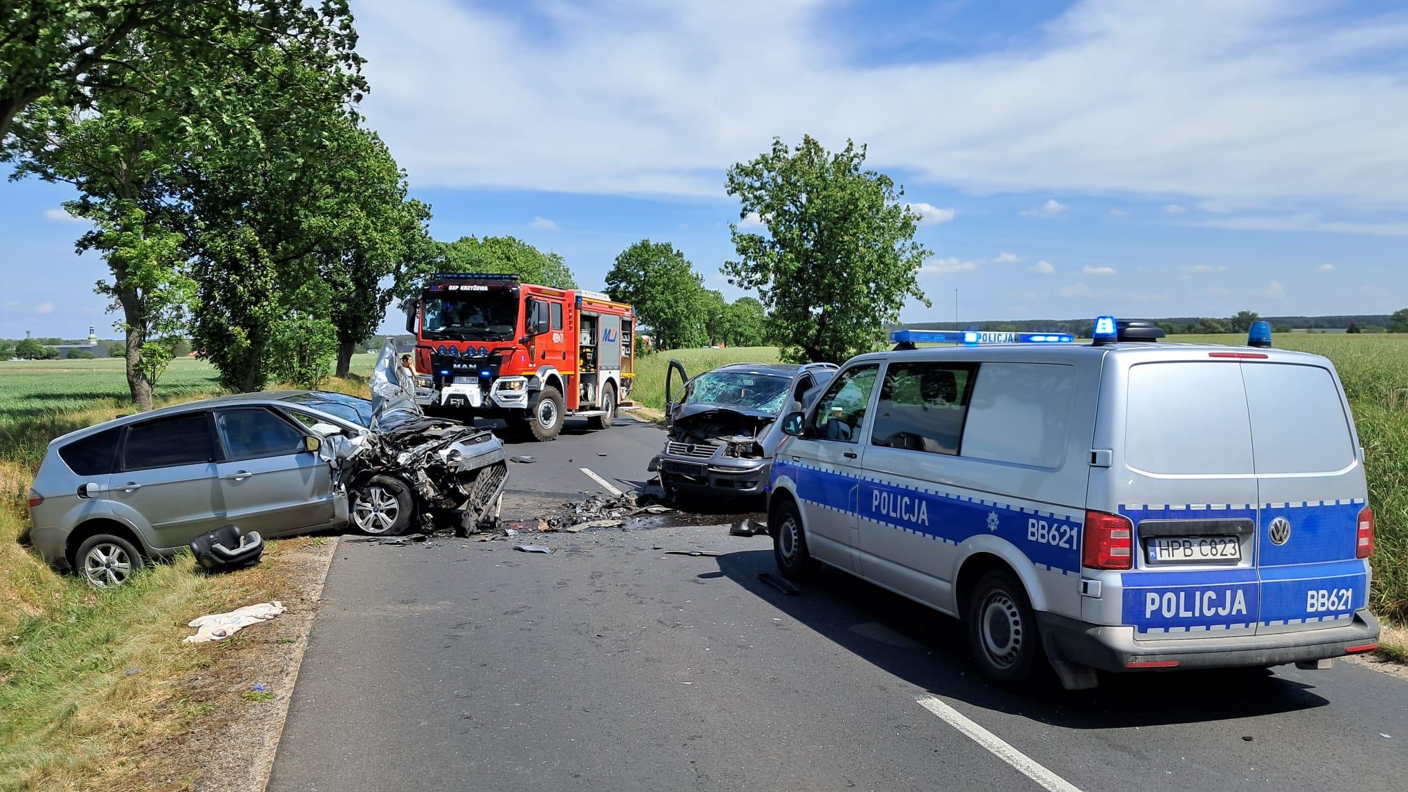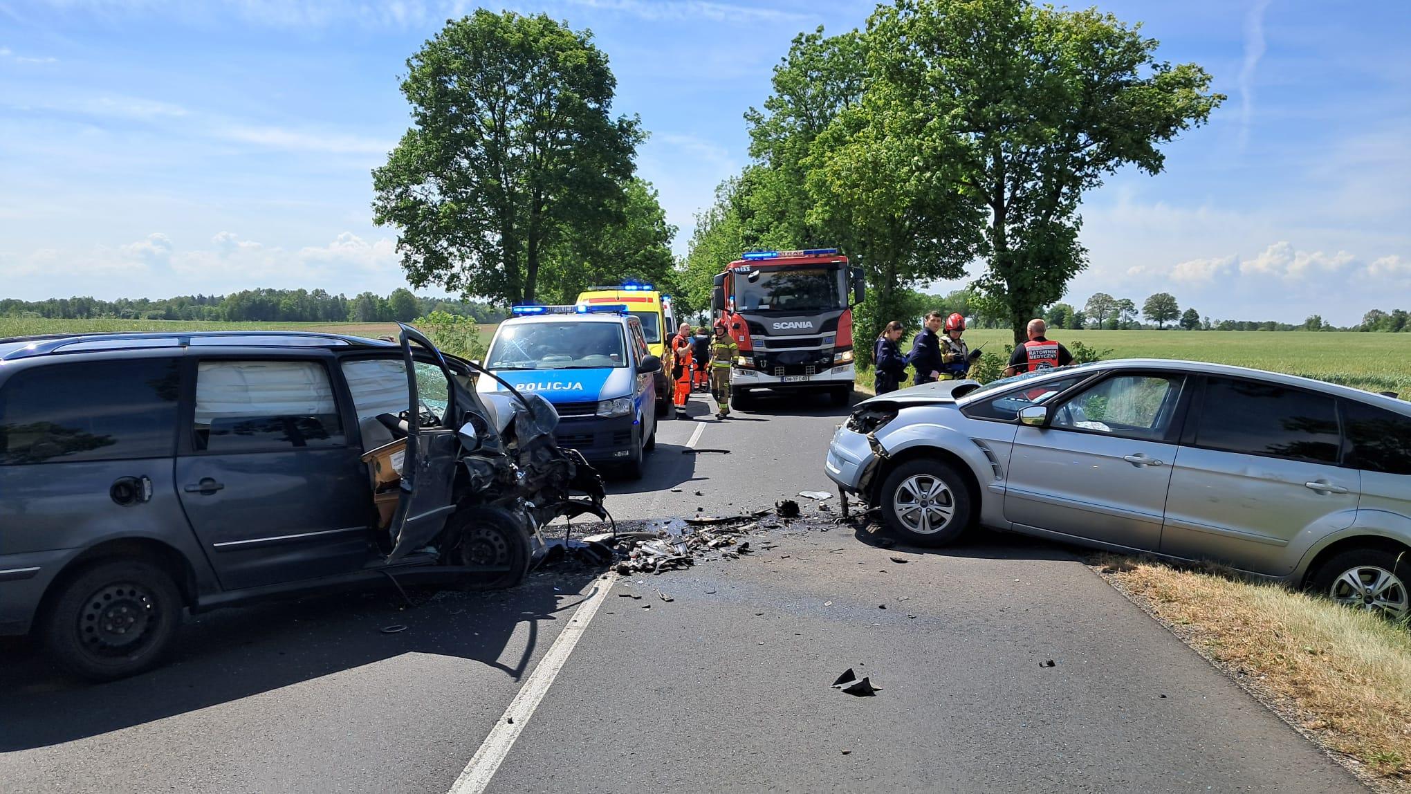Po przybyciu na miejsce zdarzenia zastępów jednostek ochrony przeciwpożarowej strażacy zastali uszkodzone pojazdy znajdujące się na jezdni i w rowie. Samochodami podróżowały trzy osoby. W wyniku zderzenia najciężej poszkodowane zostało dziecko. Na miejscu lądował śmigłowiec lotniczego pogotowia ratunkowego. Dziecko zostało zabrane przez śmigłowiec do szpitala.