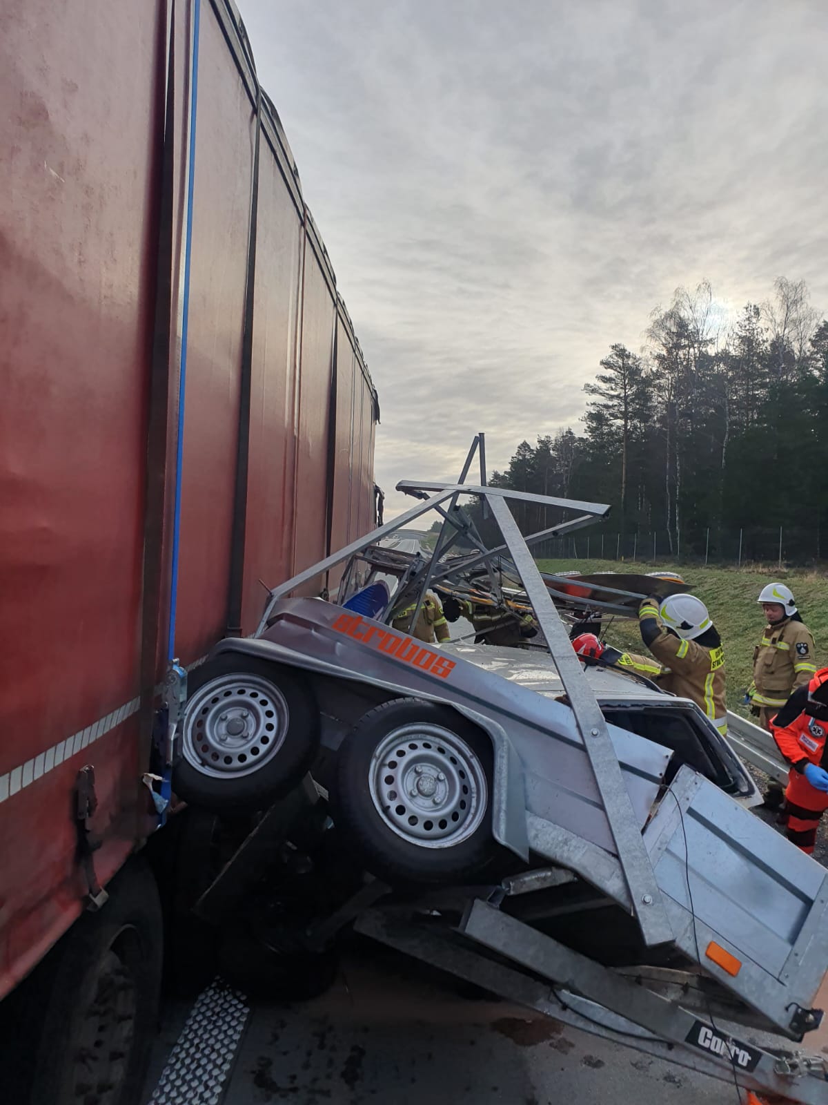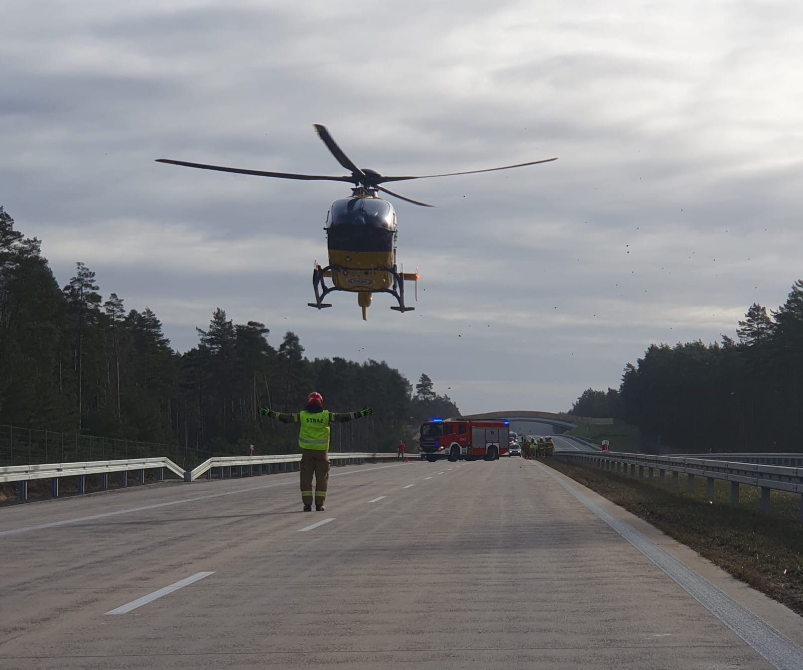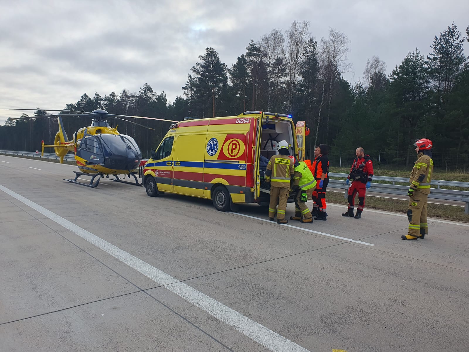 W dniu 26.01.2024 r. o godz. 09:31 do SK KP w Bolesławcu wpłynęło zgłoszenie o wypadku komunikacyjnym samochodu ciężarowego i osobowego na 62 km autostrady A18. Po przybyciu na miejsce zdarzenia zastępów Jednostek Ochrony Przeciwpożarowej strażacy udzielili kwalifikowanej pierwszej pomocy kierowcy samochodu osobowego, następnie zabezpieczyli miejsce lądowania śmigłowca LPR. Autostrada w kierunku Wrocławia była zablokowana, policja zorganizaowała objazdy. Działania trwały ok. 3 godzin.