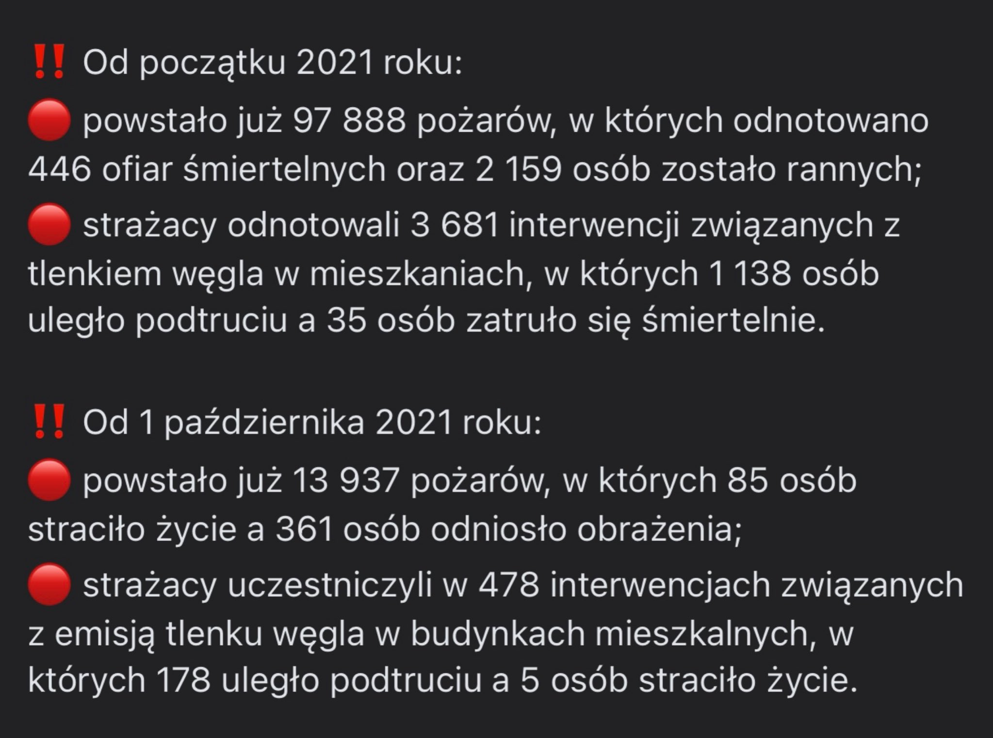 Od 1 października 2021 roku strażacy uczestniczyli w 478 interwencjach związanych z emisją tlenku węgla w budynkach mieszkalnych, w których pięć osób straciło życie, a 178 uległo podtruciu. Od 1 stycznia 2021 roku strażacy odnotowali już 3681 interwencji związanych z tlenkiem węgla w mieszkaniach, 1138 osób uległo podtruciu, niestety 35 osób zatruło się śmiertelnie.