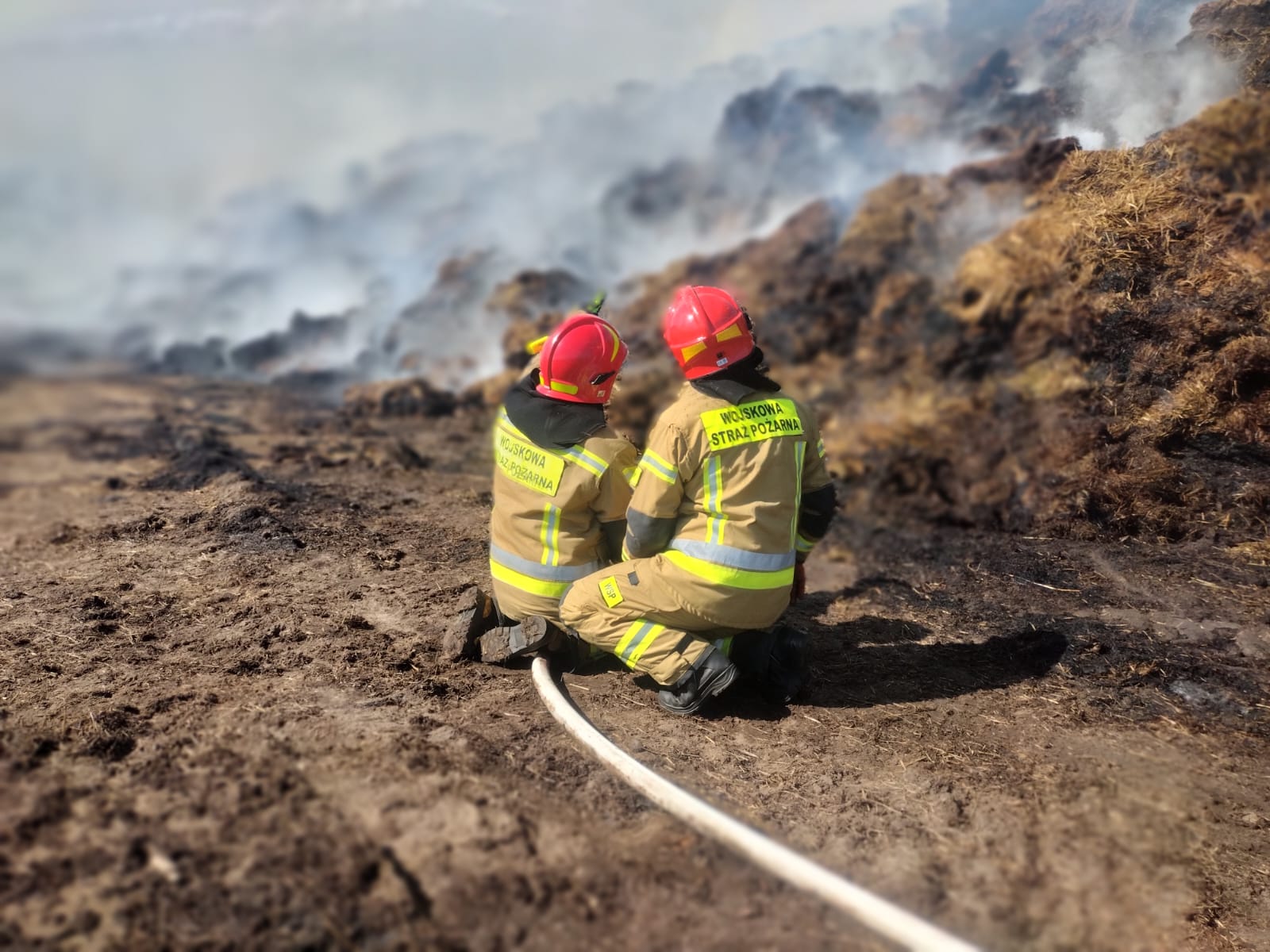 W działaniu strażaków wspierają rolnicy i pracownicy gospodarstwa rolnego. Wysoka temperatura oraz zadymienie nie ułatwiają działań gaśniczych dla strażaków.