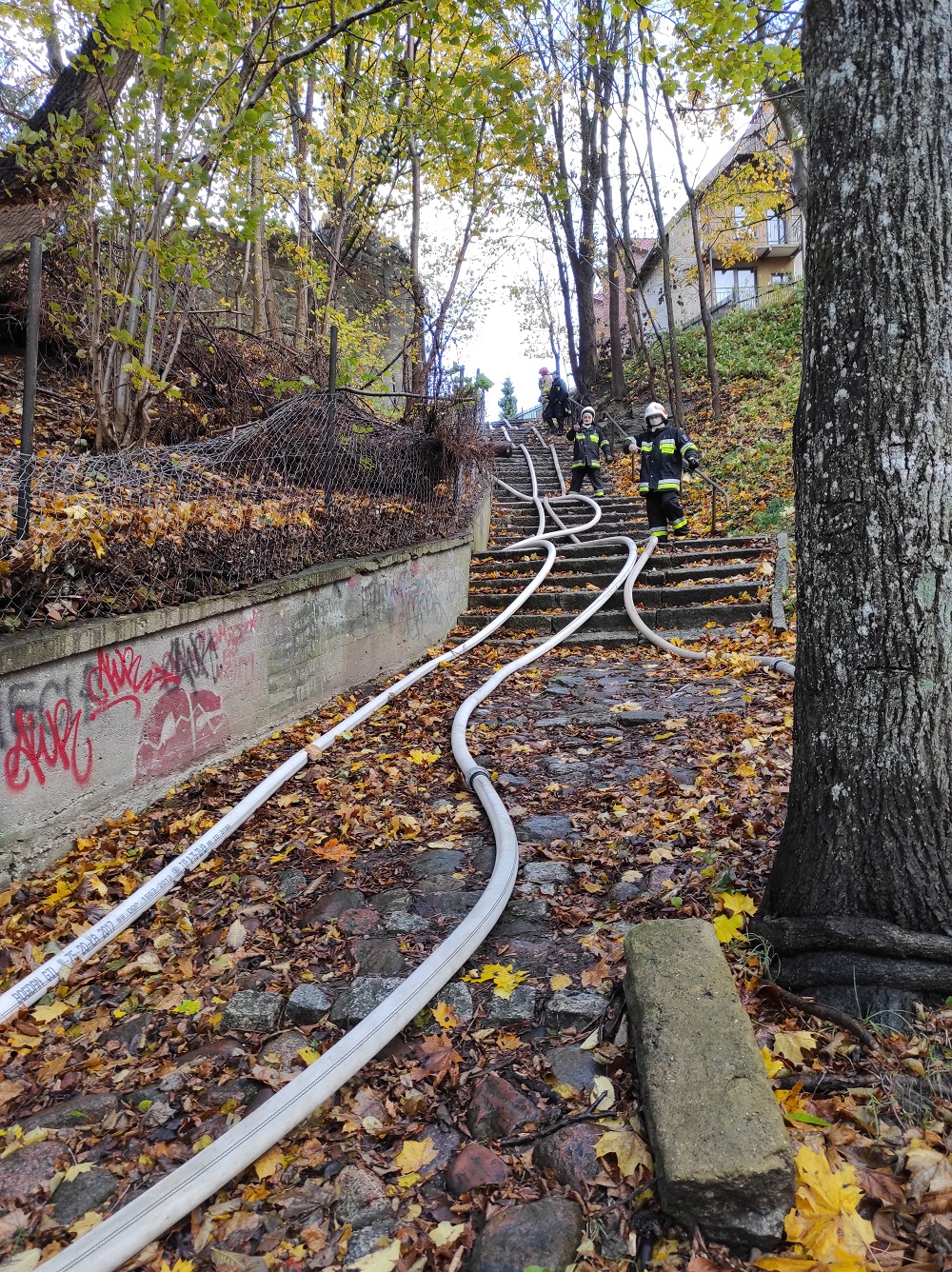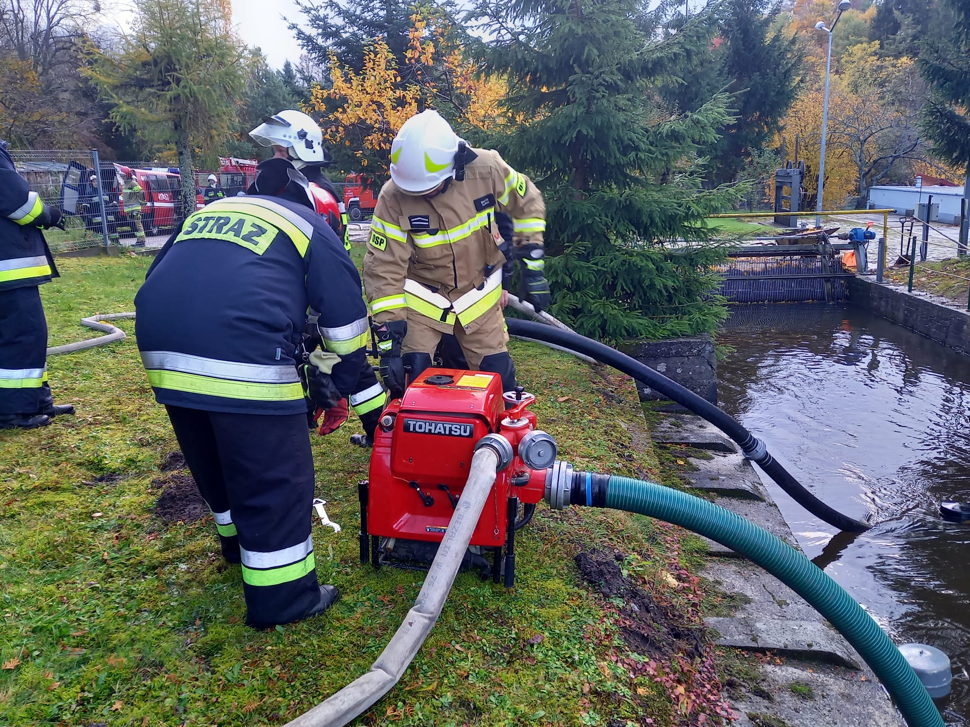Pogoda w dniu ćwiczeń również mocno testowała wytrzymałość strażaków, poprzez silny wiatr, opady deszczu i gradu. Po zbudowaniu skutecznego systemu pobierania i dostarczania wody na duże odległości strażacy sprawili trzy pojazdy specjalne wokół obiektu sakralnego, z których podany został środek gaśniczy (autodrabina oraz dwa podnośniki hydrauliczne).
