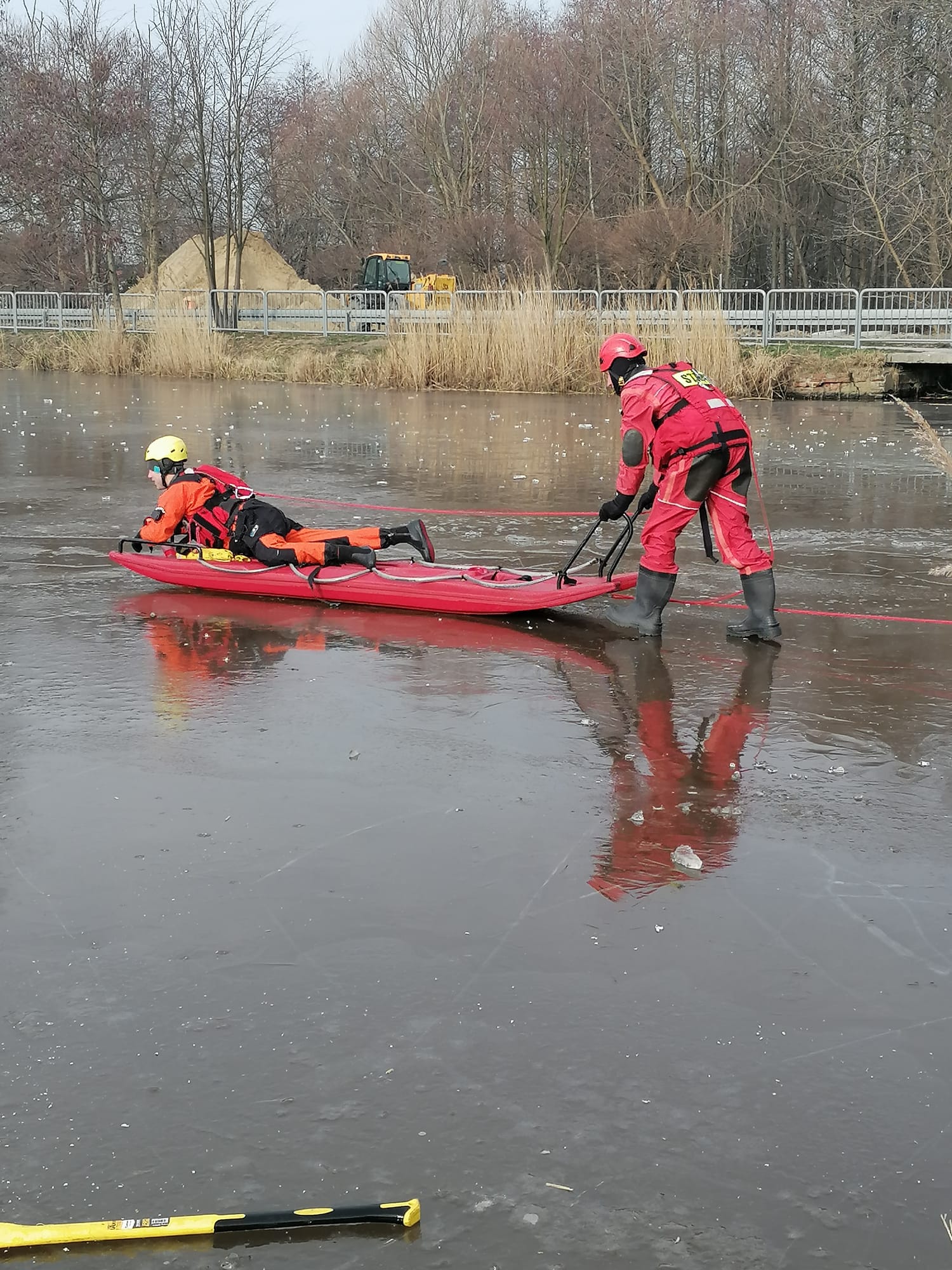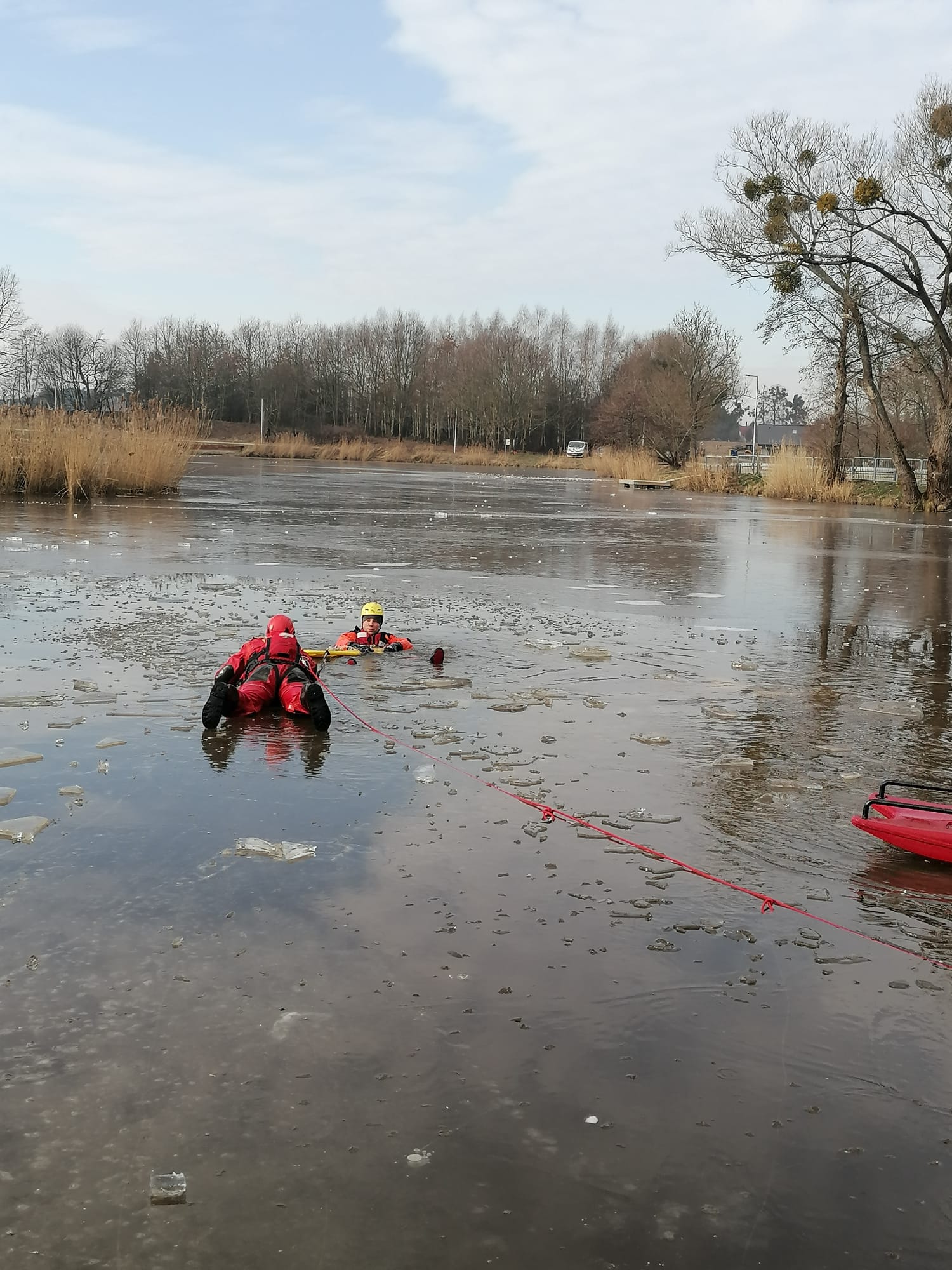 Niska temperatura sprawiła, że tafla zbiornika wodnego pokryła się lodem, umożliwiając tym samym realizację ćwiczeń.