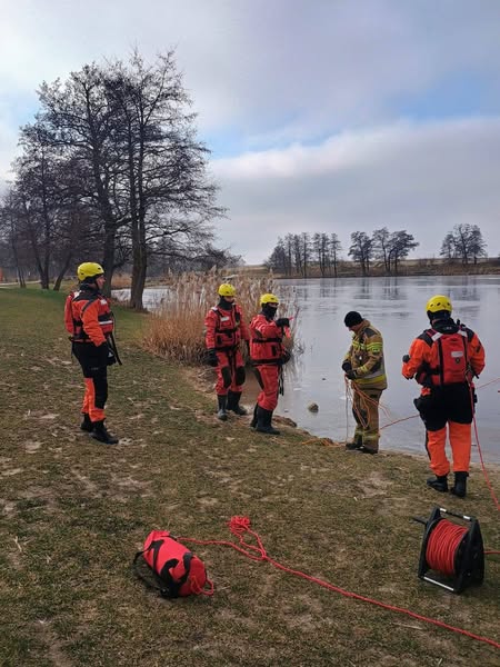 W ramach doskonalenia zawodowego strażacy z Jednostki Ratowniczo – Gaśniczej Państwowej Straży Pożarnej w Braniewie przeprowadzają ćwiczenia z ratownictwa na lodzie.