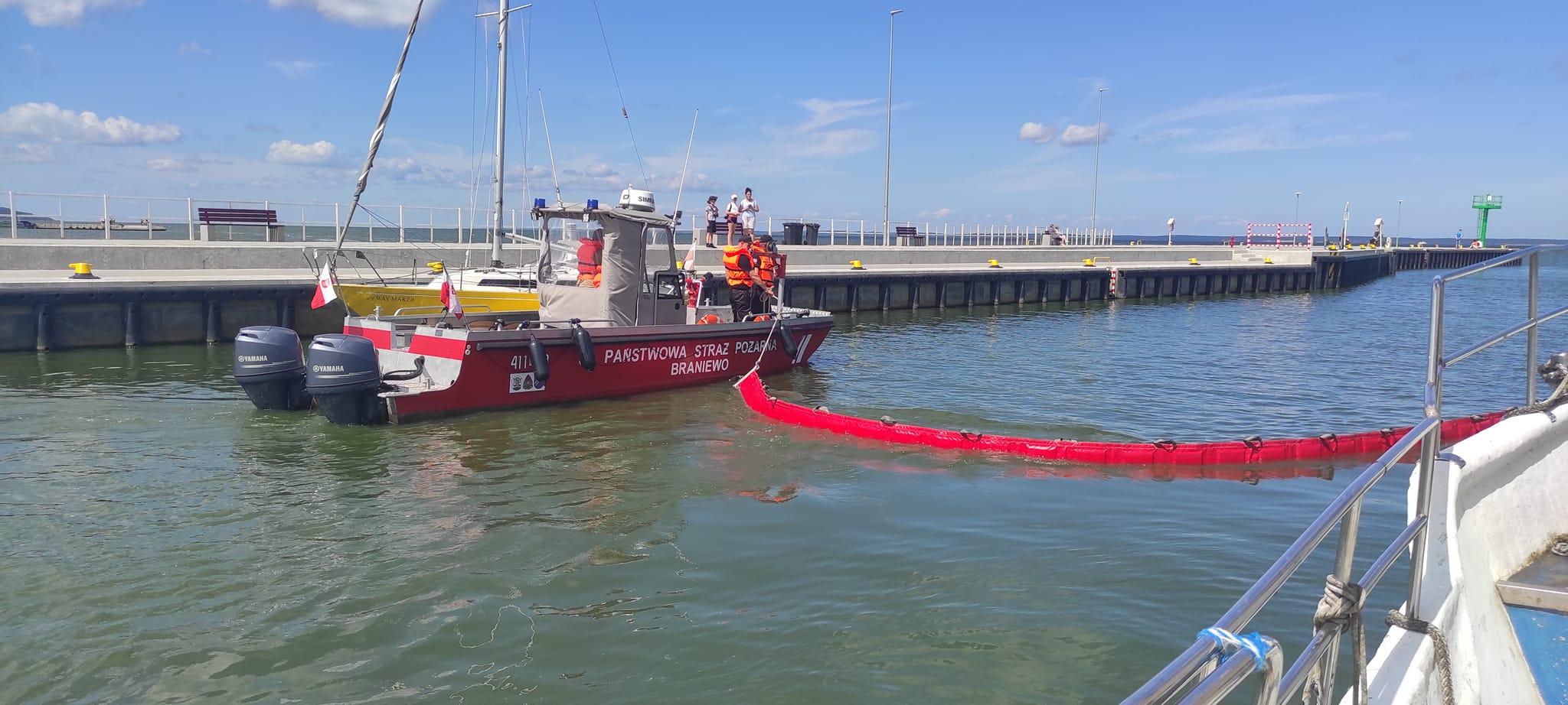 Strażacy z Państwowej Straży Pożarnej w Braniewie doskonalili organizację akcji ratownictwa ekologicznego na wodach Zalewu Wiślanego. Szkolenie przeprowadzono we Fromborku w kanale portowym.