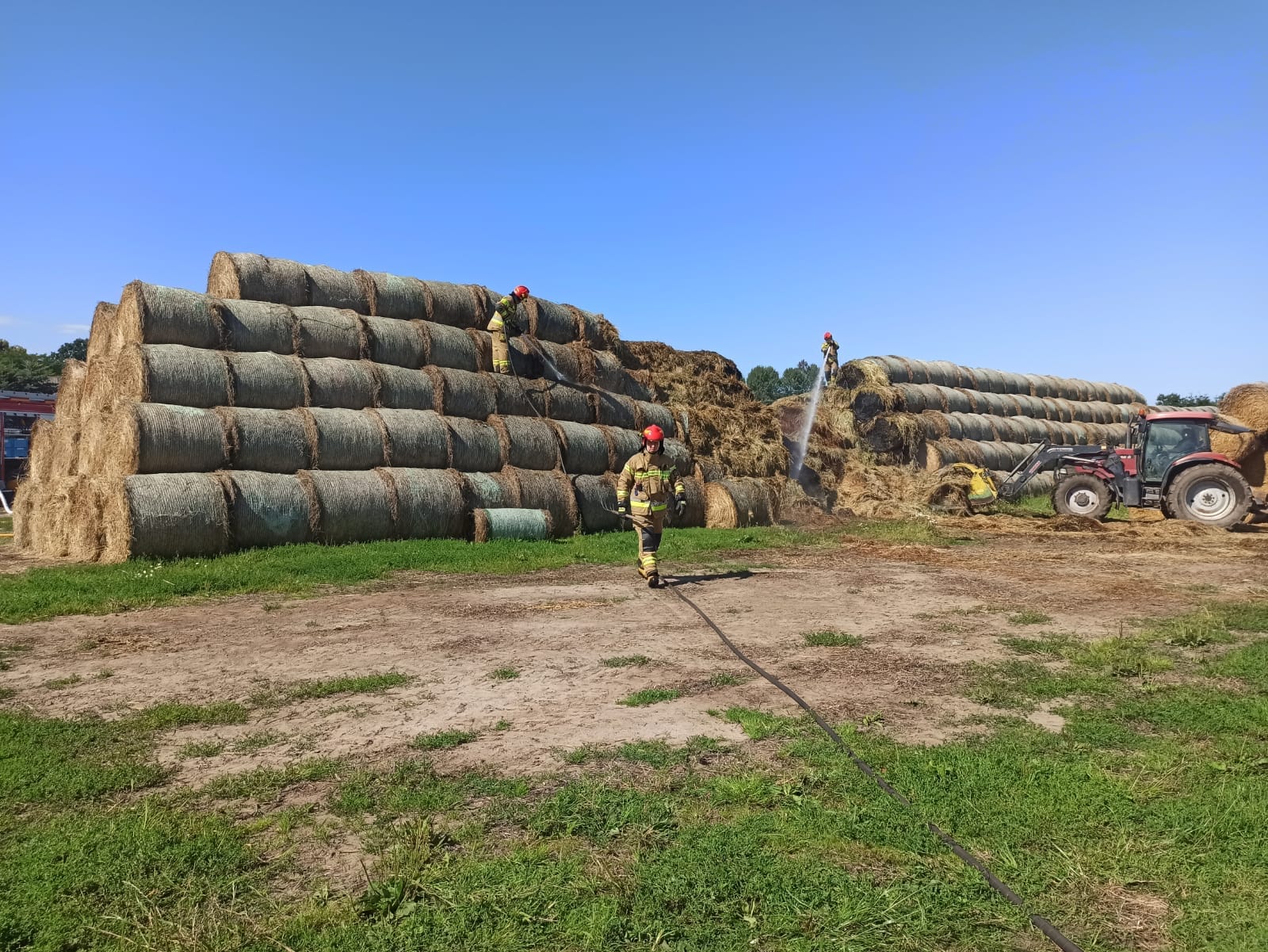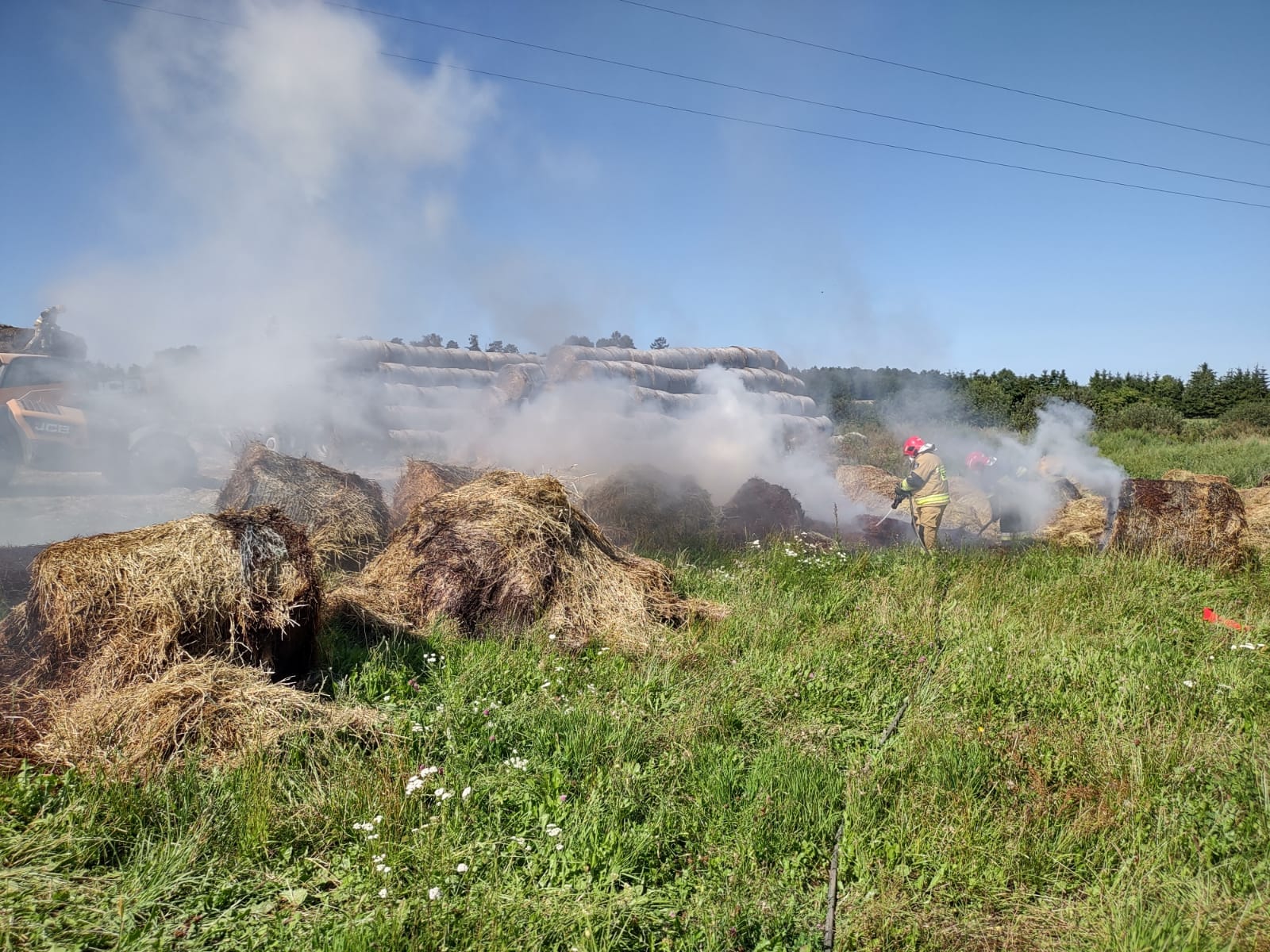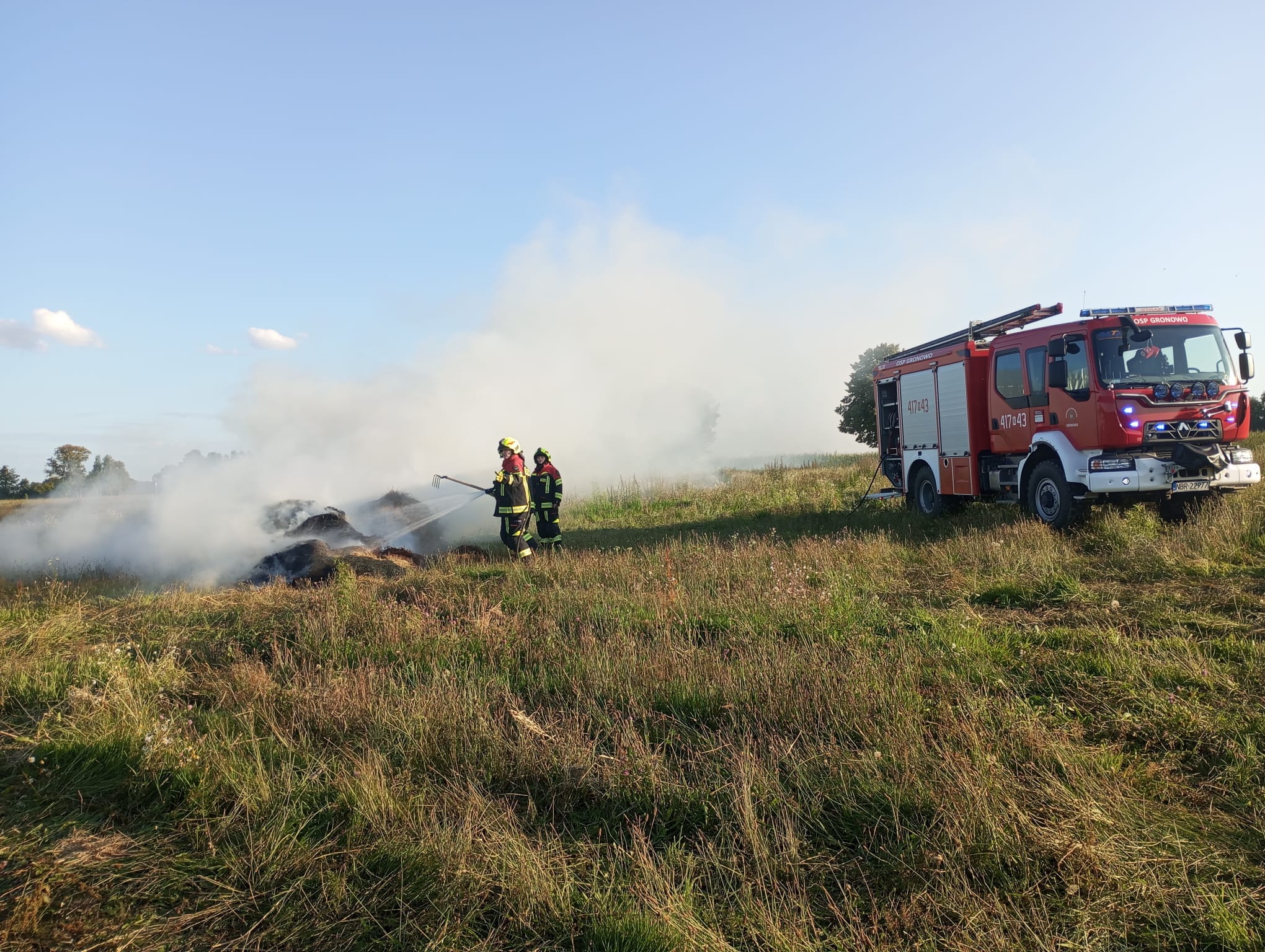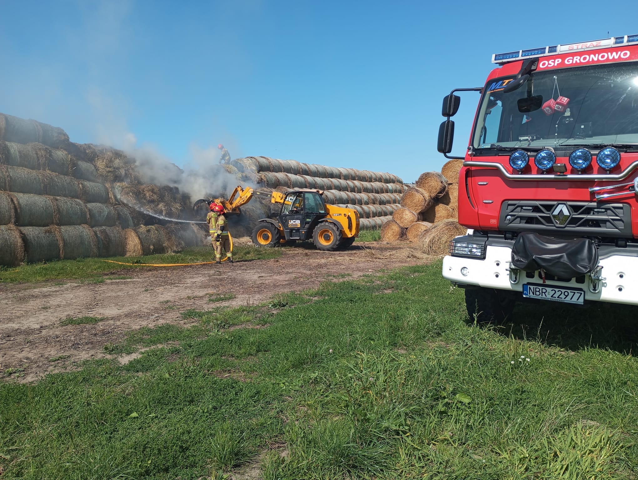 Ogniem objętya był pryzma siana w miejscowości Rodowo. Działania strażaków polegały na podaniu prądów gaśniczych wody, kontrolowaniu rozprzestrzeniania się ognia i dogaszeniu pogorzeliska. W działaniu wykorzystano również sprzęt mechaniczny, z wykorzystaniem którego usunięto palace się baloty na pobliskie pole, gdzie zostały dogaszone przez strażaków.