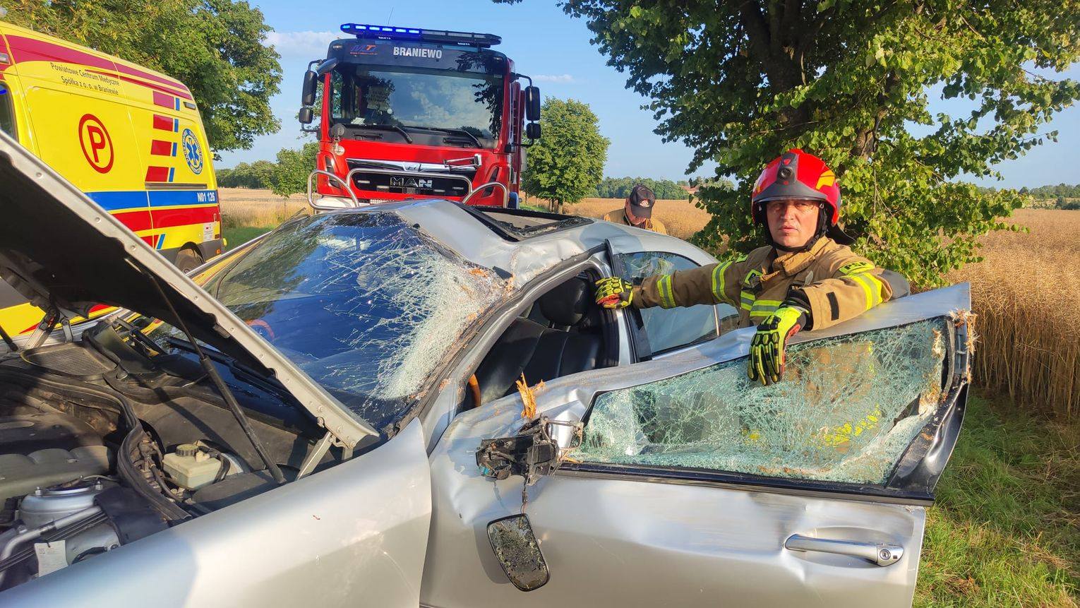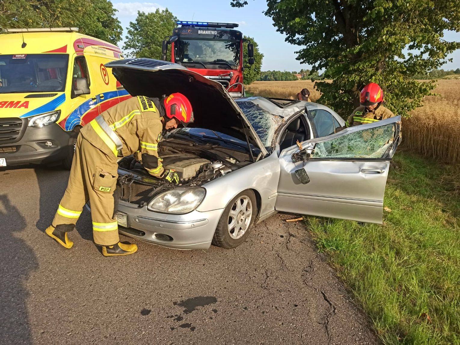 BRANIEWO – NOWA PASŁĘKA. Na drodze powiatowej prowadzącej z Braniewa do Nowej Pasłęki kierowca Mercedesa klasy S stracił panowanie nad pojazdem, który wypadł z drogi i uderzył bokiem w przydrożne drzewo.