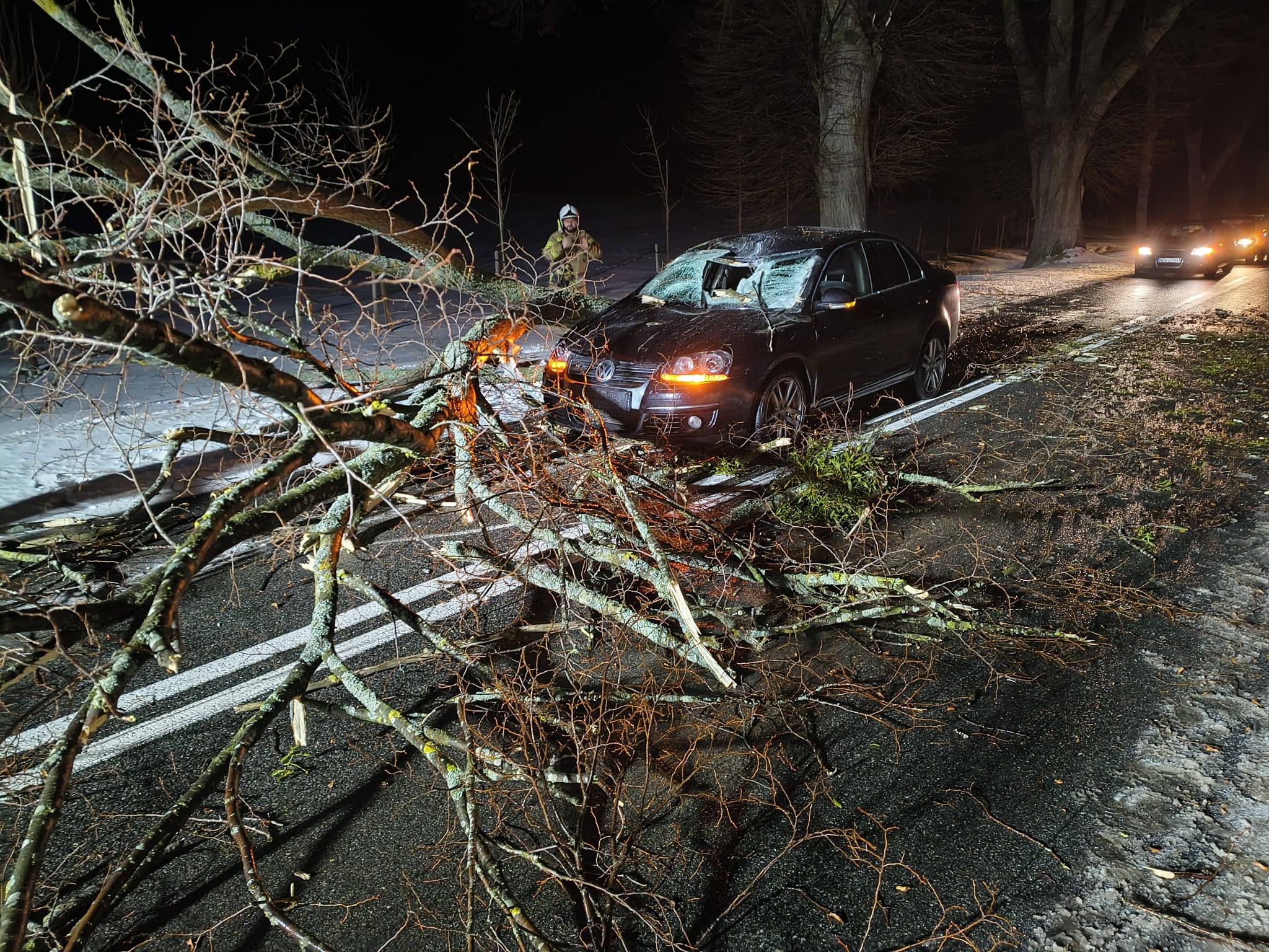 W sobotę, 21 lutego br. na jadący samochód marki Volkswagen spadł konar drzewa.