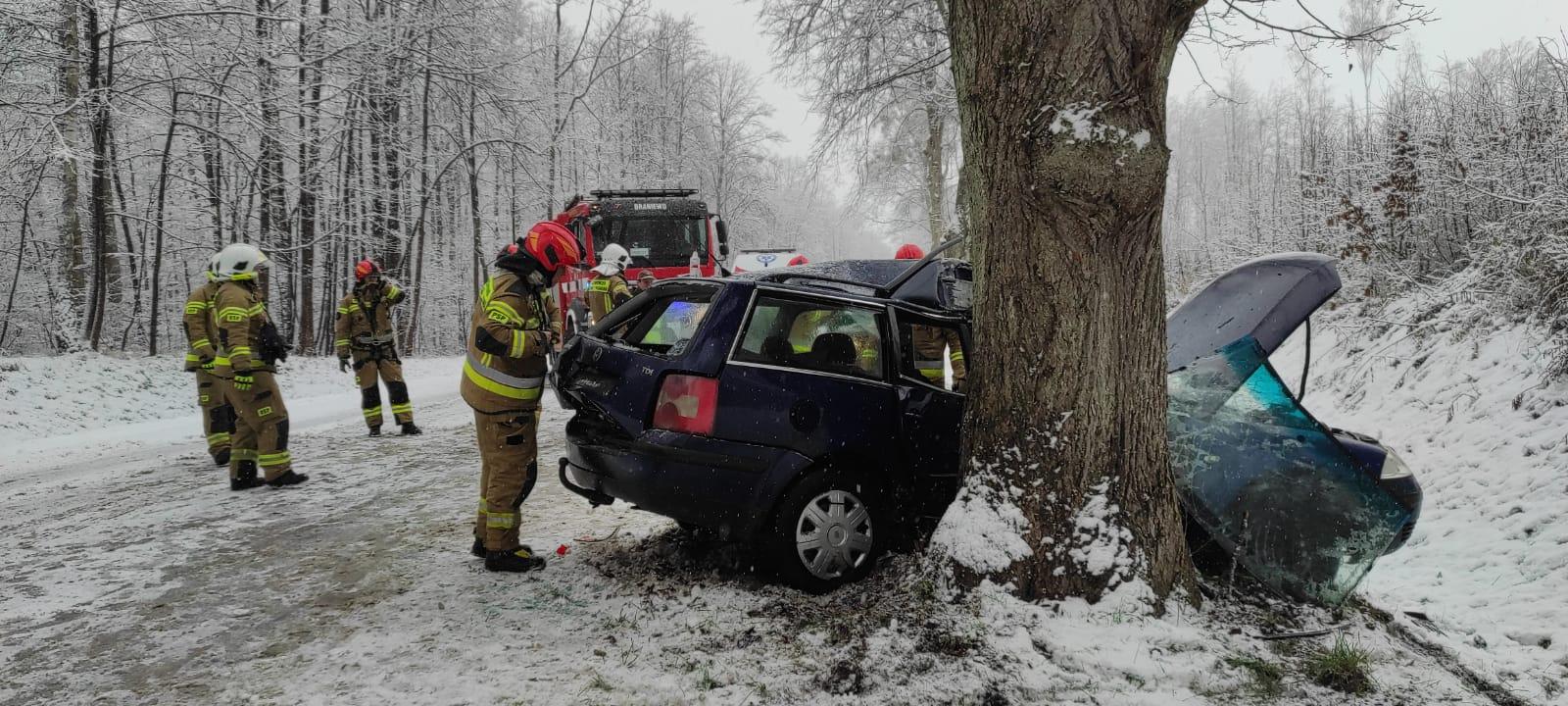 Kierujący osobowym Volkswagenem Passatem, na prostym odcinku drogi, stracił panowanie nad pojazdem, który zjechał na pobocze i uderzył bokiem w przydrożne drzewo. Aby wydobyć z rozbitego auta nieprzytomnego kierowcę strażacy musieli wykorzystać zestaw narzędzi hydraulicznych. Poszkodowany został przekazany załodze zespołu ratownictwa medycznego i przewieziony do szpitala w Elblągu.