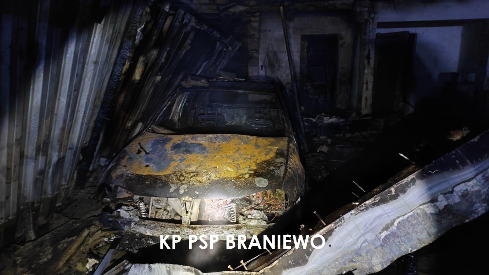 W chwili przyjazdu pierwszej jednostki ochrony ppoż. ogniem objęte było całe wnętrze garażu oraz znajdujący się wewnątrz samochód.