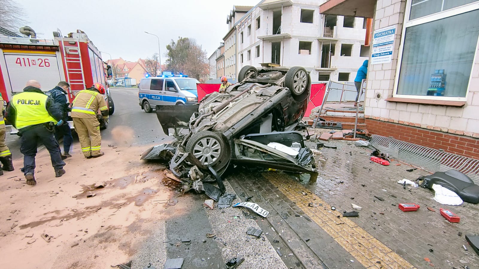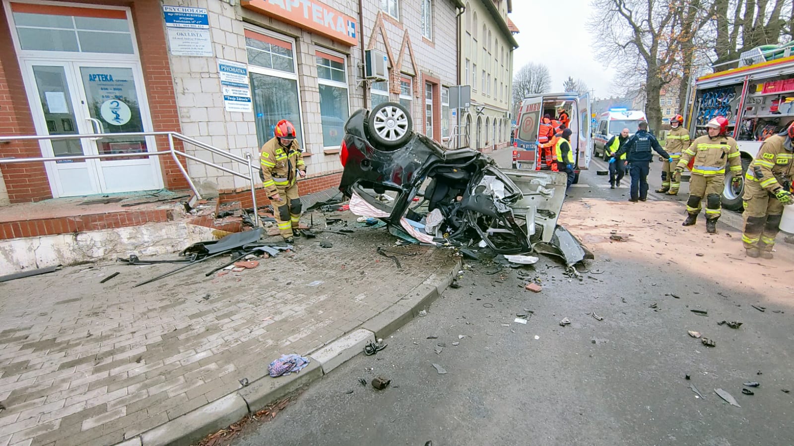 Kierowca Citroena C2, jadący drogą wojewódzką nr 504, z impetem uderzył w budynek – schody apteki. Siła uderzenia była tak duża, że auto obróciło się i dachowało. Wewnątrz zniszczonego pojazdu znajdował się uwięziony kierowca.
