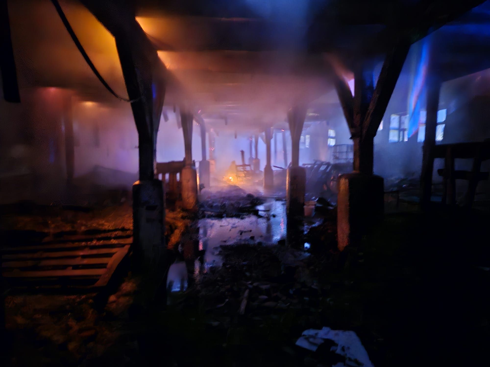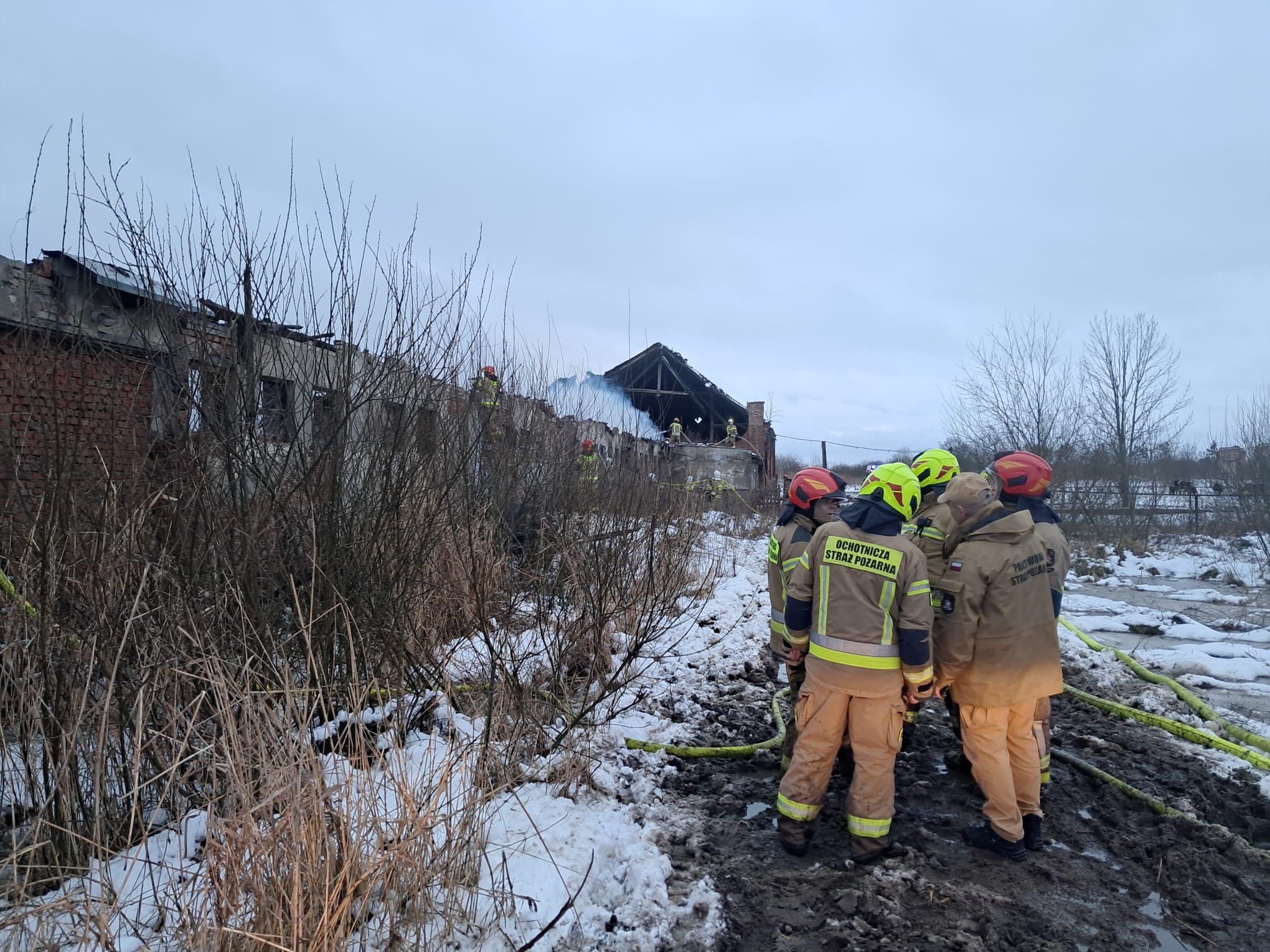 Z uwagi na zawalenie się dachu działania gaśnicze strażacy realizowali z zewnątrz, docierając do ognisk pożaru.