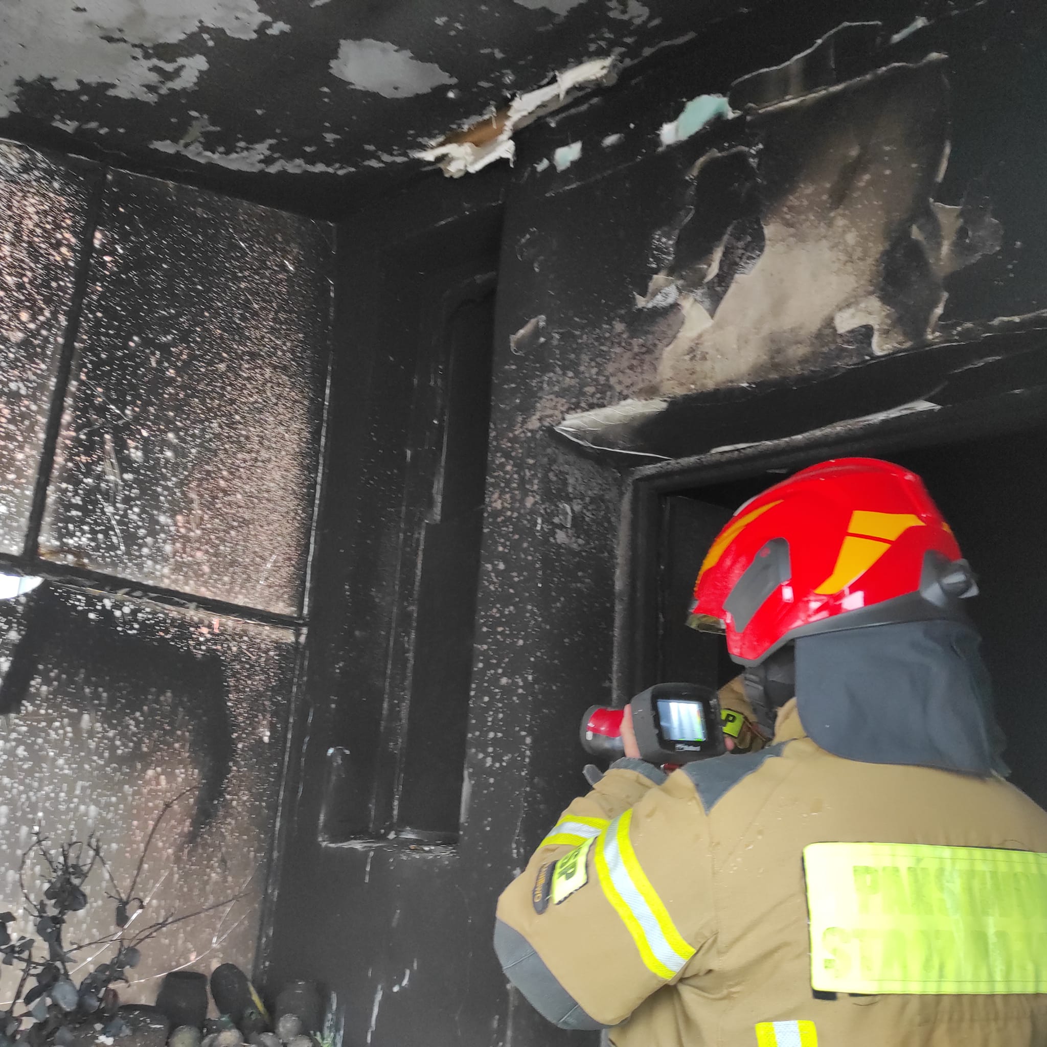 z wykorzystaniem kamery termowizyjnej czy nie ma zarzewi ognia oraz udzielili pomocy medycznej na terenie akcji dla dwóch osób. Jedna osoba z oparzeniami została zabrana przez Zespół Ratownictwa Medycznego do szpitala.