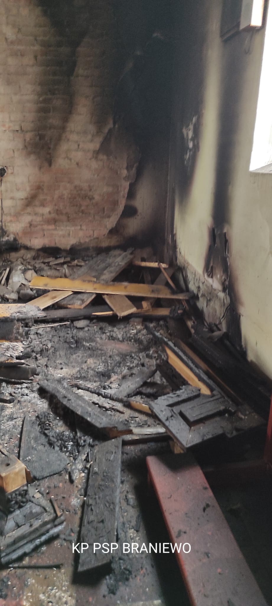 Strażacy przewietrzyli obiekt oraz z wykorzystaniem kamery termowizyjnej przeszukali pogorzelisko, usuwając część desek spalonej podłogi. Straty wewnątrz obiektu są znaczne.