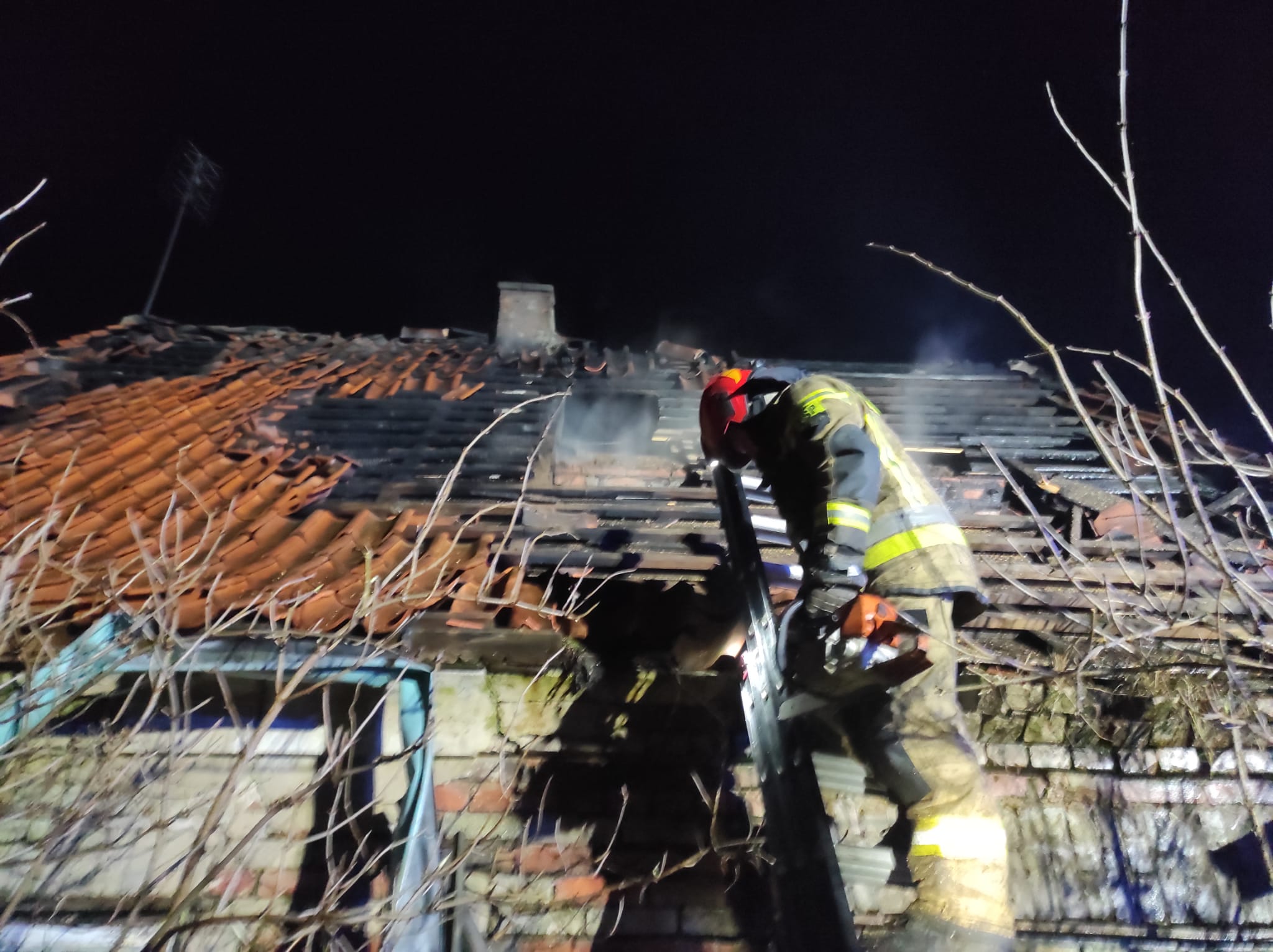 Po opanowaniu pożaru rozpoczęła się żmudna praca rozbiórkowa na pogorzelisku. Strażacy z wykorzystaniem drabin pożarniczych dostali się na dach budynku i usunęli część spalonego poszycia dachu docierając do ukrytych zarzewi ognia. Po około 2,5 godzinie prowadzonej akcji gaśniczej pożar został ugaszony.