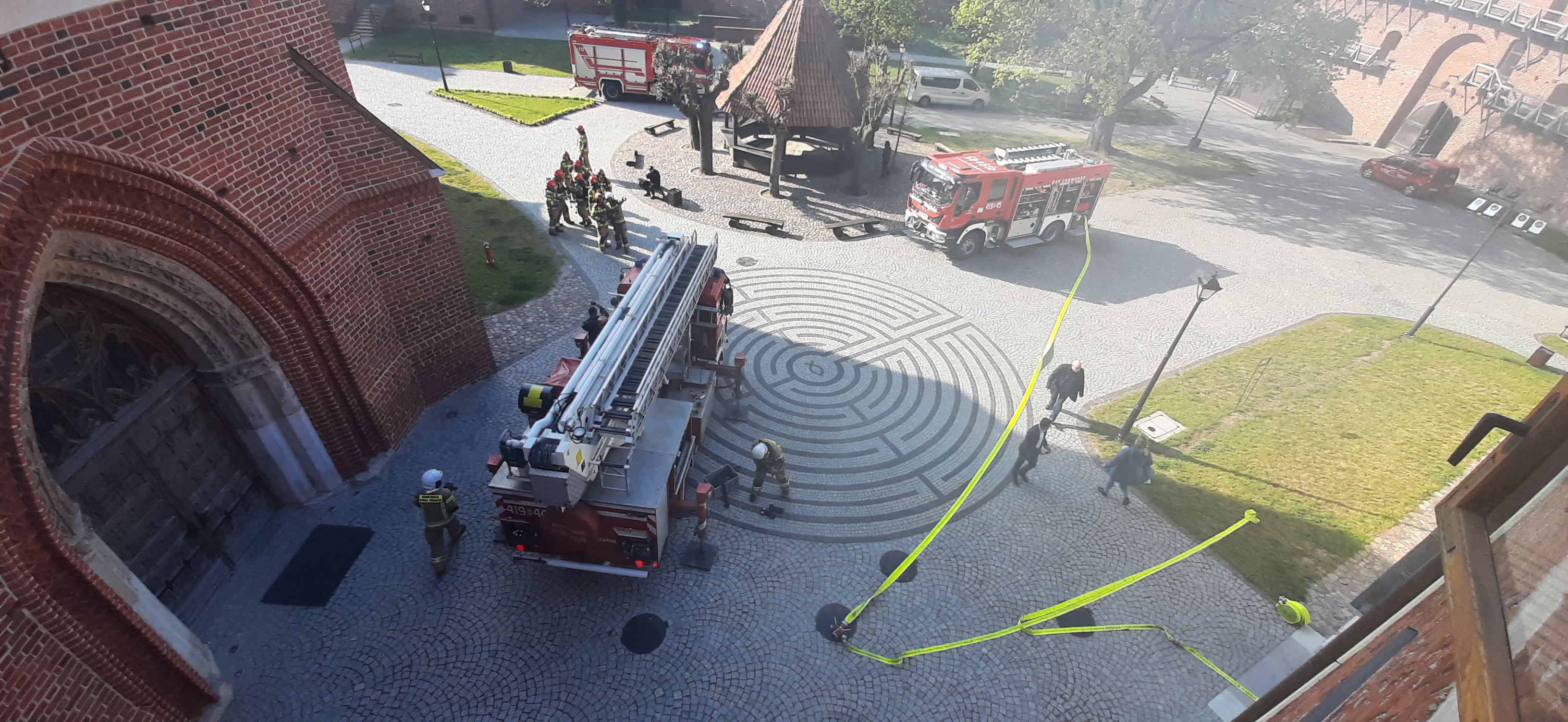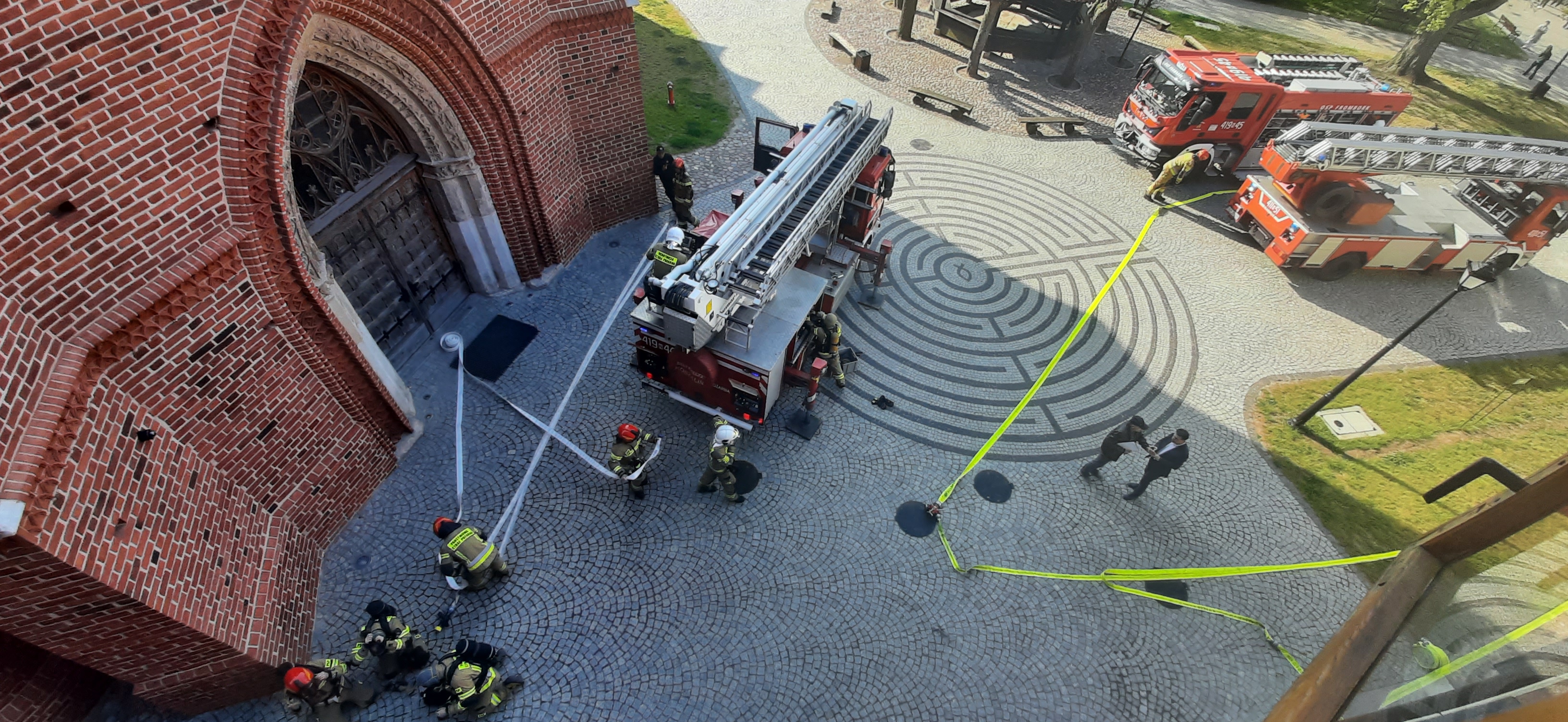 w specjalnych skrzyniach wynoszone były na zewnątrz. Strażacy oprócz gaszenia pożaru, musieli odnaleźć poszkodowanego, który został ewakuowany na zewnątrz ze strefy pożarowo niebezpiecznej. Dodatkowym wyzwaniem było bezpieczne wprowadzenie wozów strażackich przez bramę na dziedziniec Wzgórza Katedralnego. W trakcie ćwiczeń sprawdzono możliwości pojazdów specjalnych w postaci podnośnika hydraulicznego oraz autodrabiny pożarniczej.