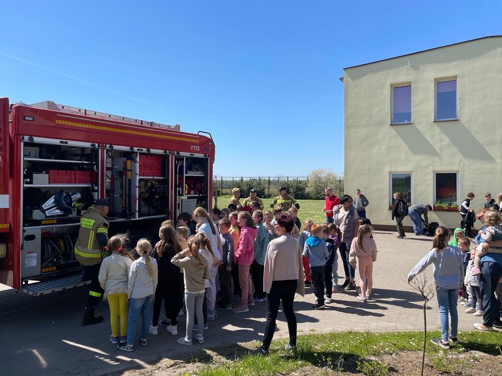 Po zakończonym alarmie uczniowie mogli zapoznać się z wyposażeniem wozu strażackiego, którym przybyli strażacy z PSP.