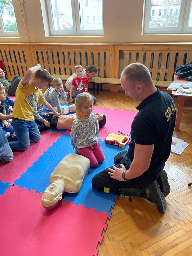 W piątek, 2 grudnia br. dzieci z Przedszkola Niepublicznego BAJKA w Braniewie z wielką radością powitały wyjątkowych gości, strażaków z Komendy Powiatowej Państwowej Straży Pożarnej w Braniewie. Dzieci dowiedziały się, że praca strażaka nie polega tylko na gaszeniu pożarów, ale również na udzielaniu pomocy ludziom. Strażacy z najmłodszymi (grupa Pszczółki) przeprowadzili ćwiczenia praktyczne z umiejętności udzielania pierwszej pomocy przedmedycznej.