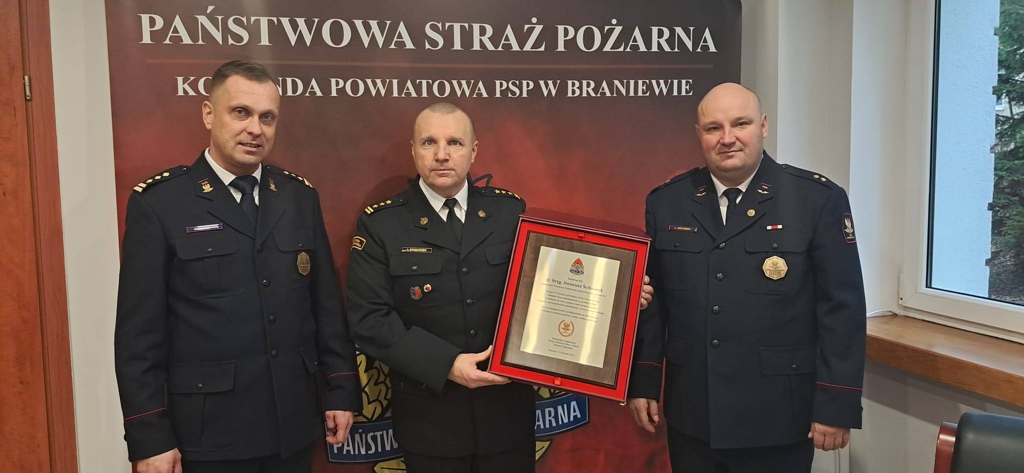 Komendant Powiatowy PSP w Braniewie st. bryg. Ireneusz Ścibiorek oraz Zastępca Komendanta Powiatowego PSP w Braniewie st. kpt. Andrzej Kaliszuk pamiątkowy medal 30-lecia KSRG wręczyli dla: