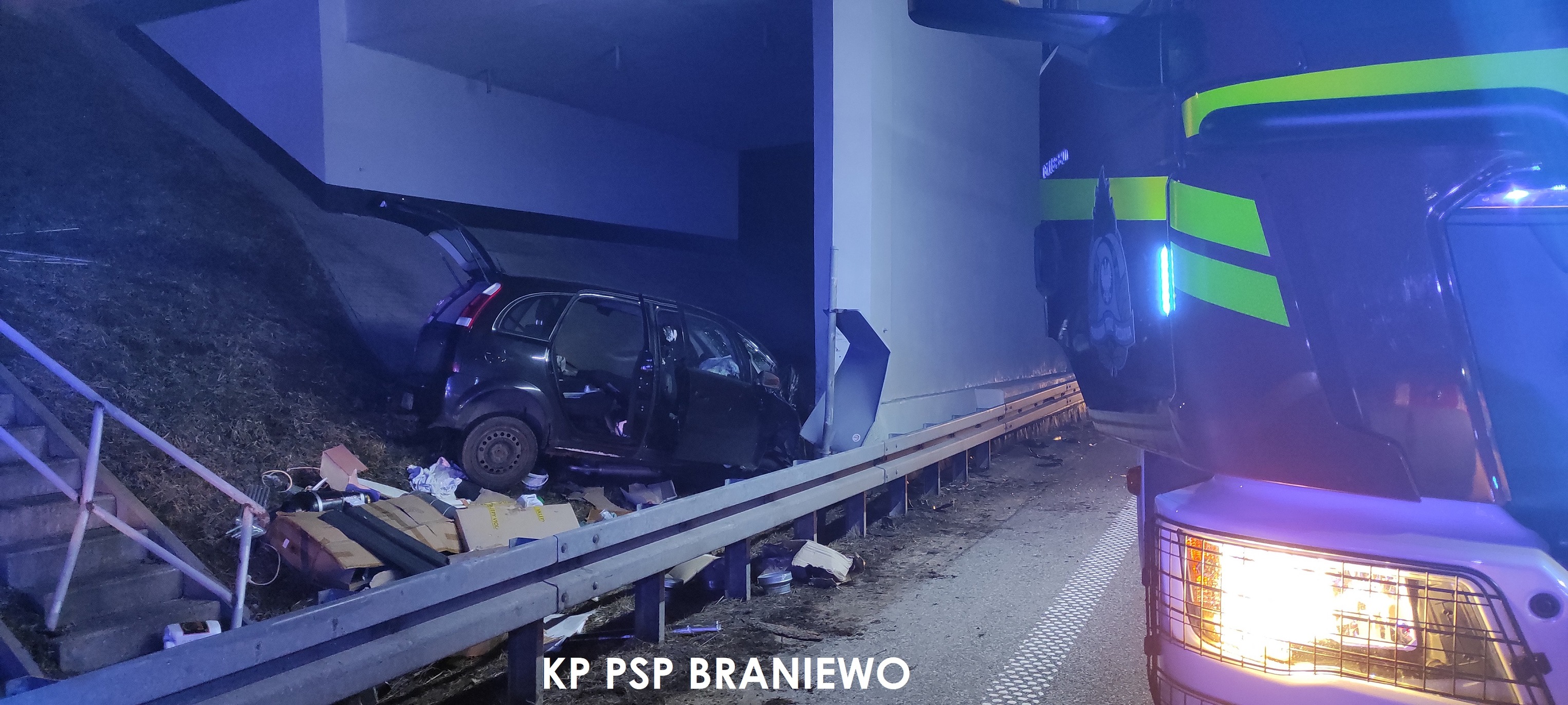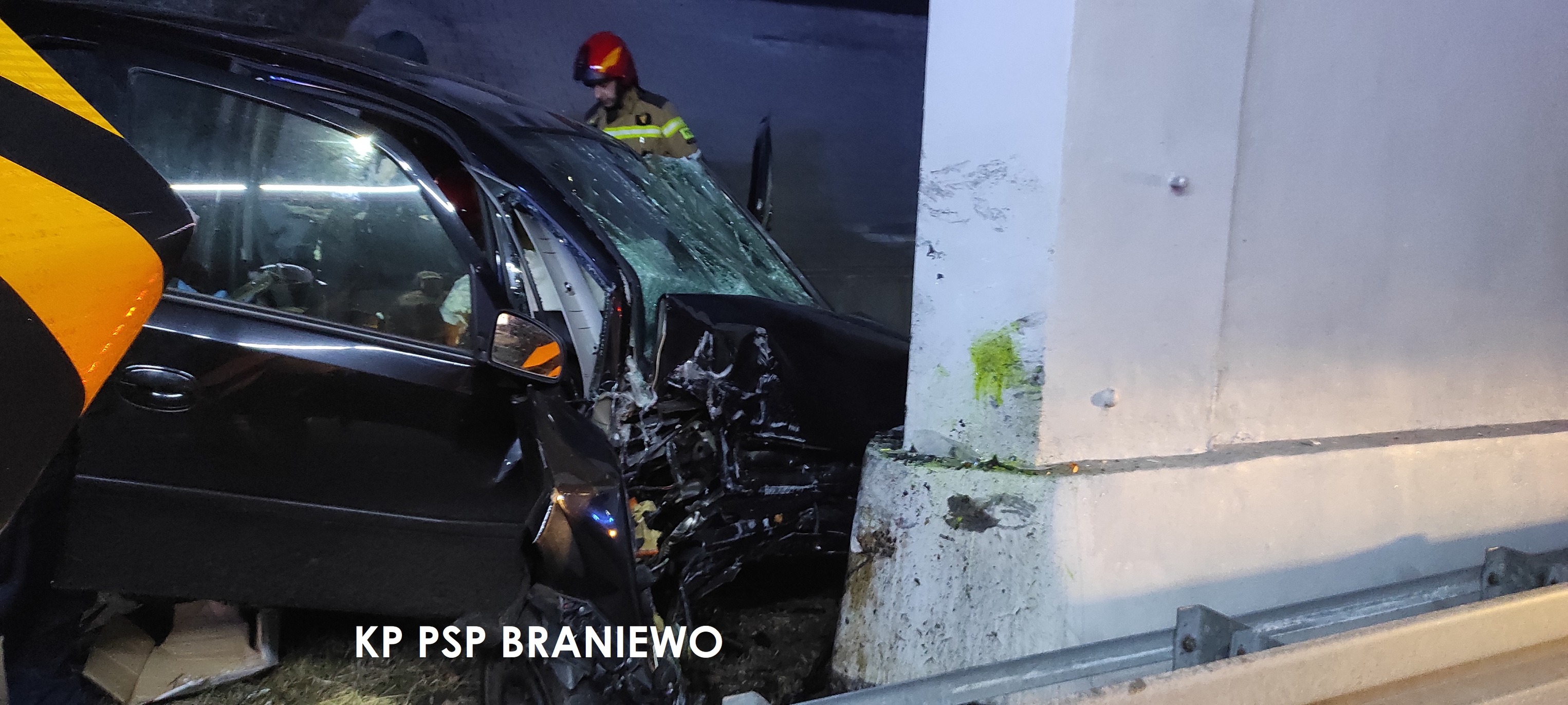 Auto po przejechaniu kilkudziesięciu metrów z impetem uderzyło czołowo w filar wiaduktu.