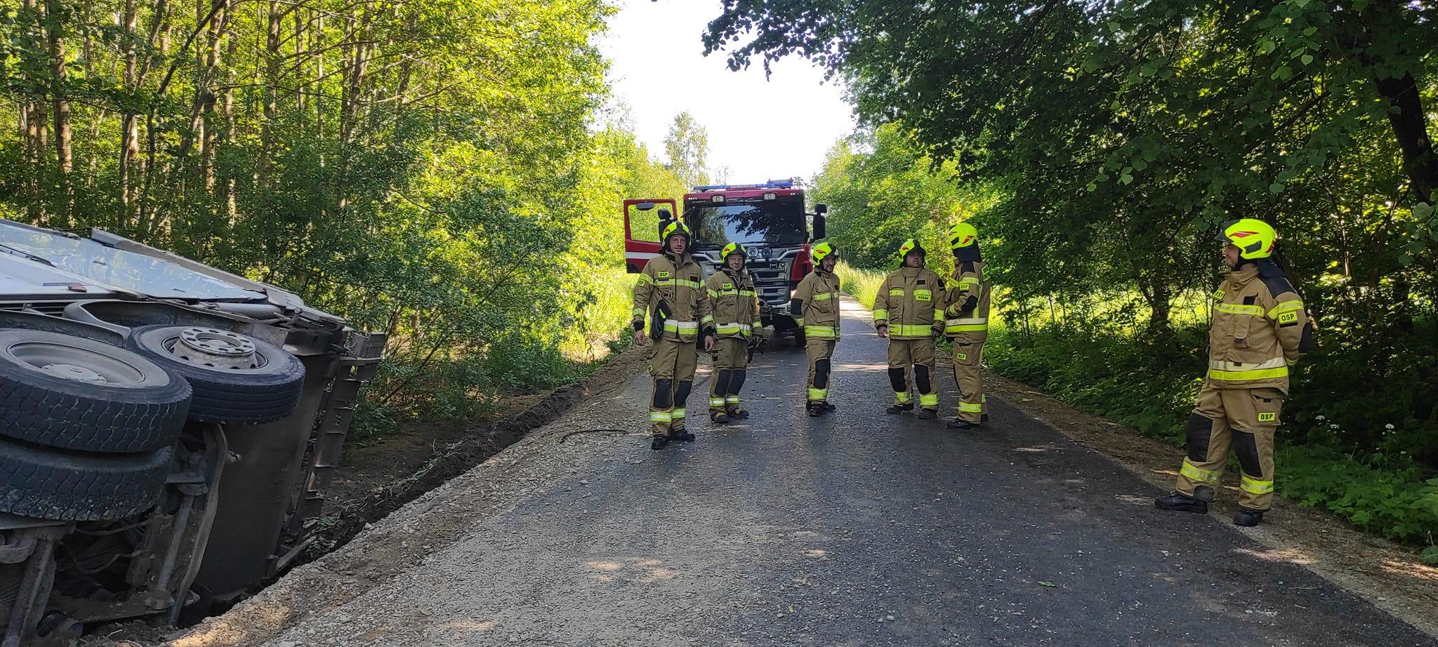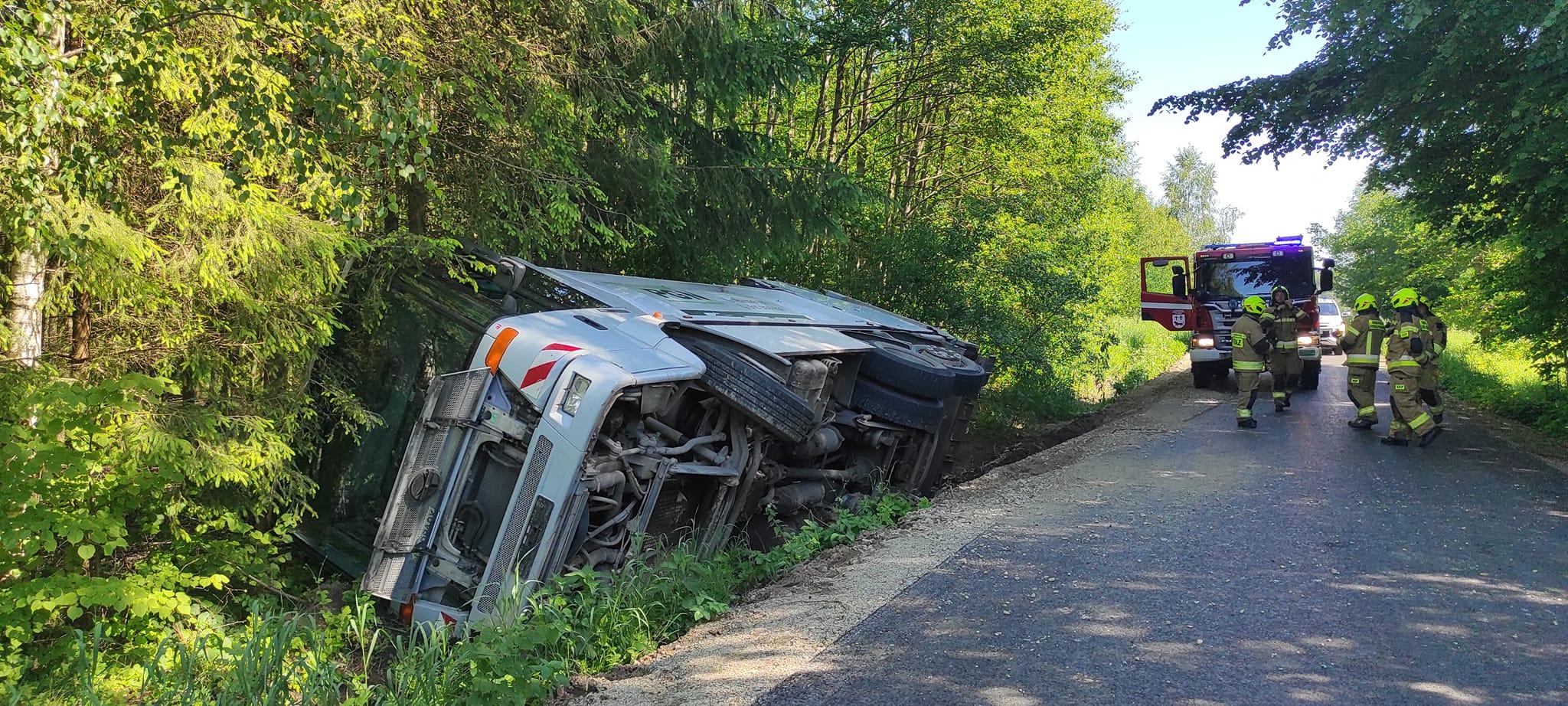 Ciężarówka wjechała do rowu i przewróciła się na bok. Kierowca auta nie odniósł obrażeń i samodzielnie opuścił pojazd.